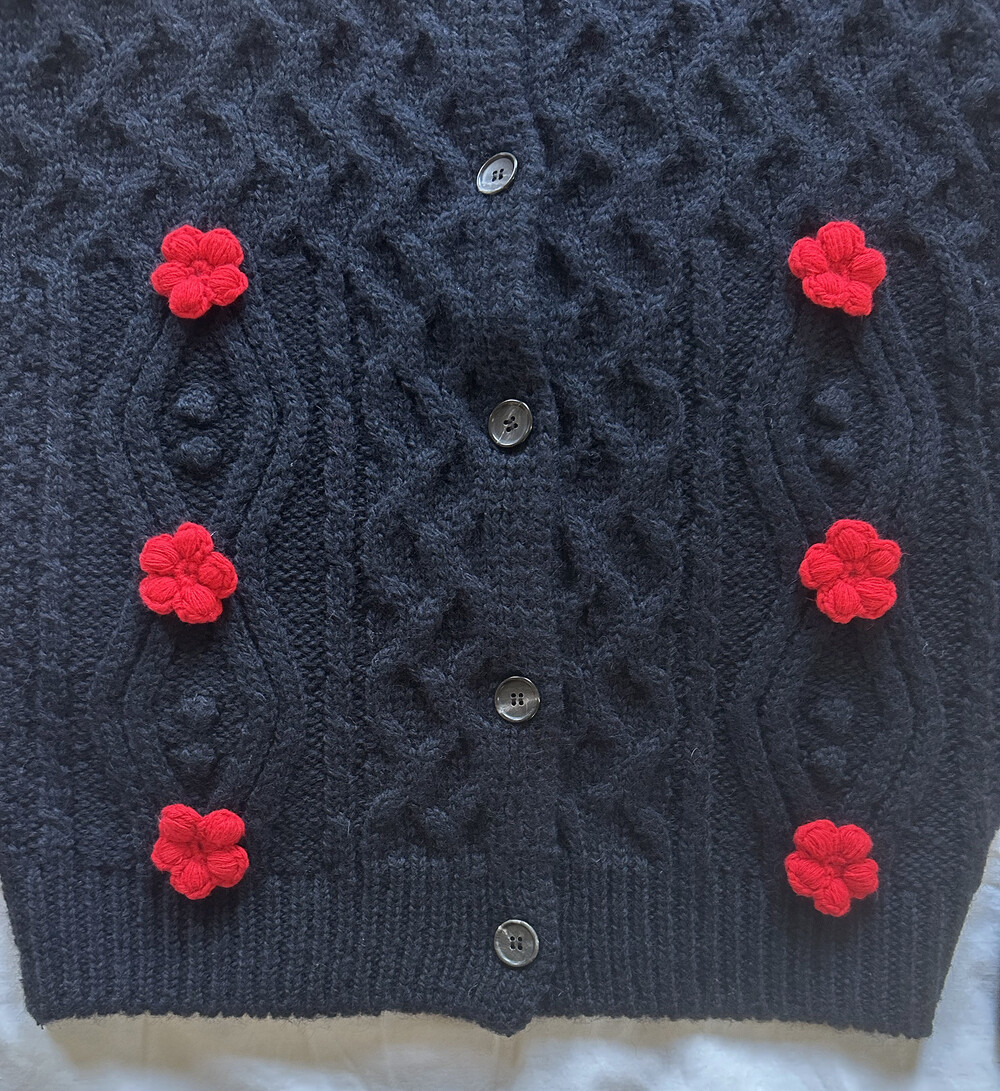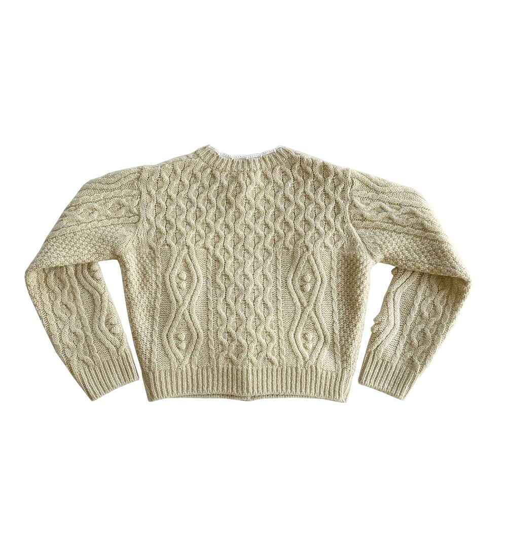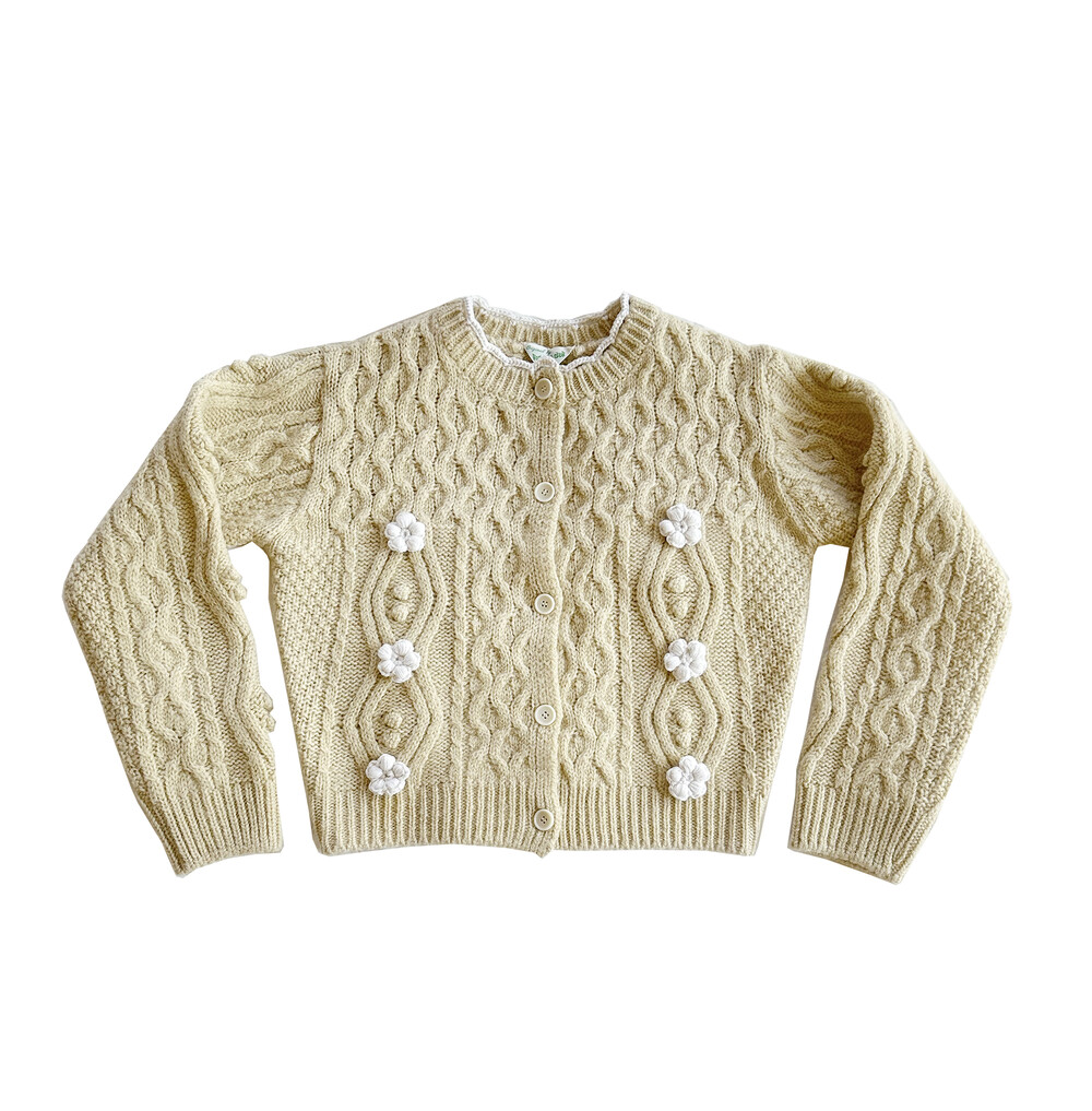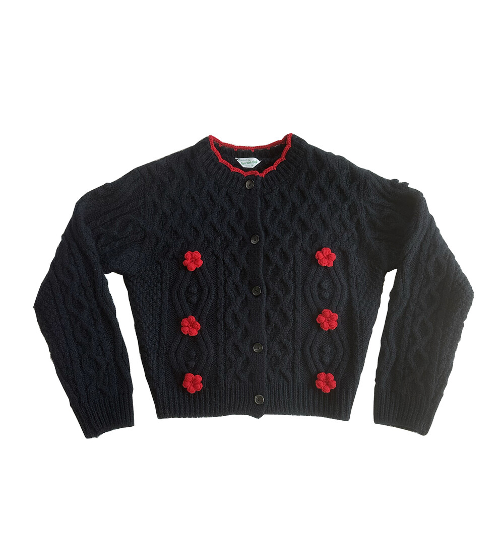핸드메이드 꽃이 장식되어진 울 100% 꽈배기 패턴의 니트 가디건입니다.