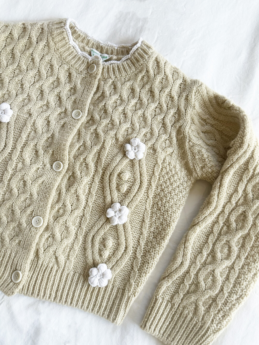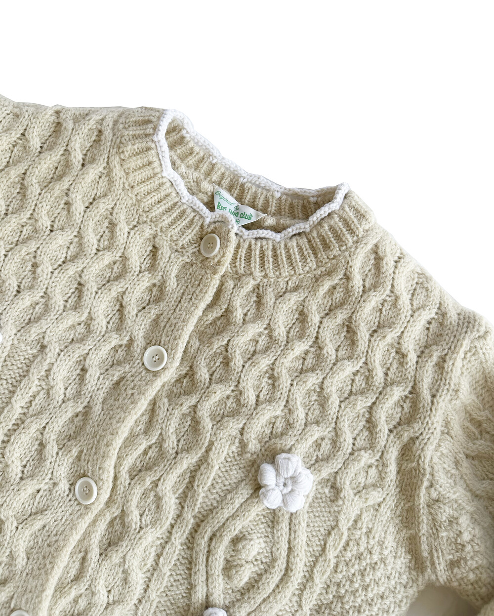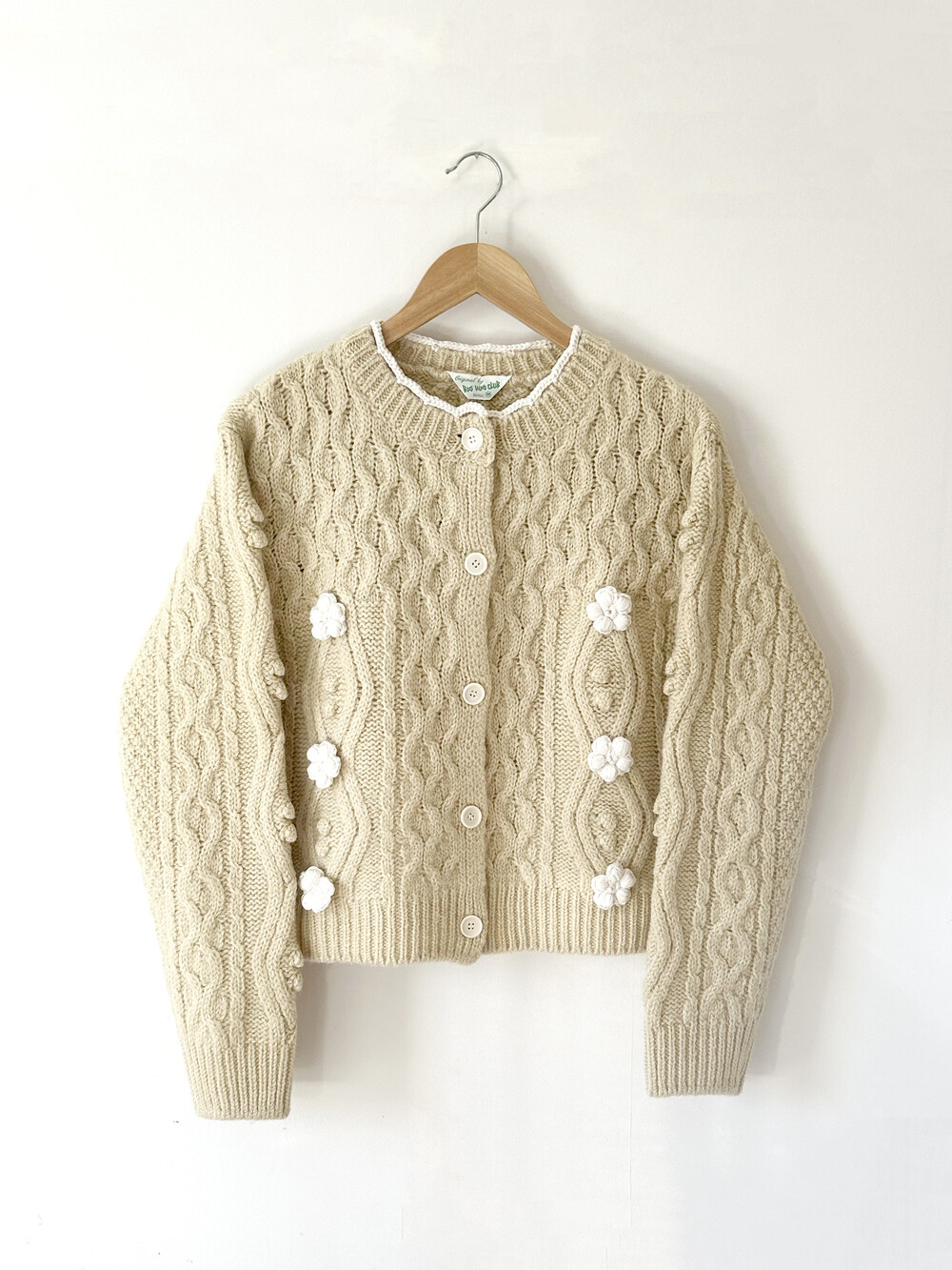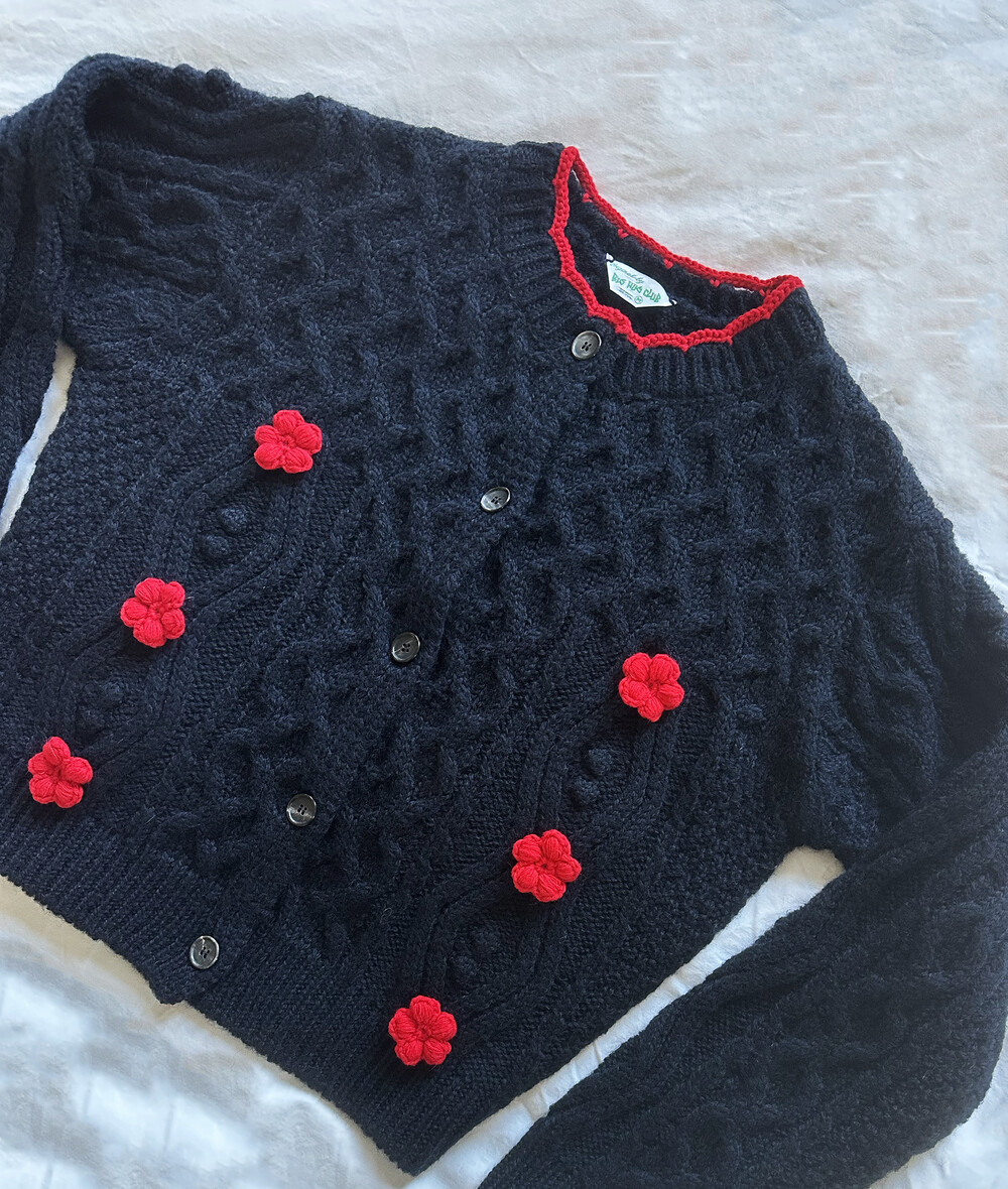 핸드메이드 꽃이 장식되어진 울 100% 꽈배기 패턴의 니트 가디건입니다.