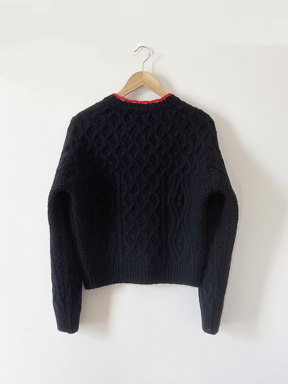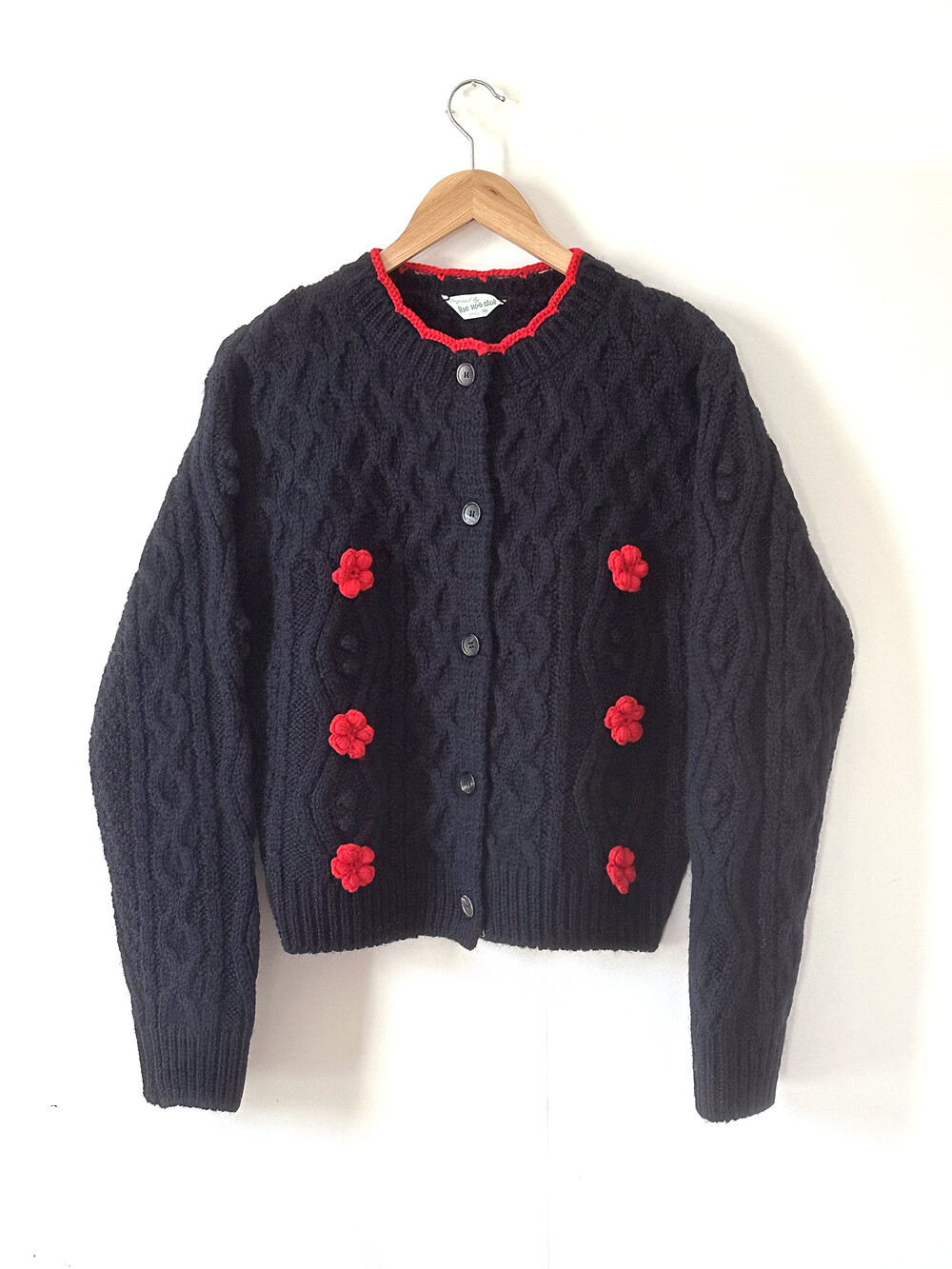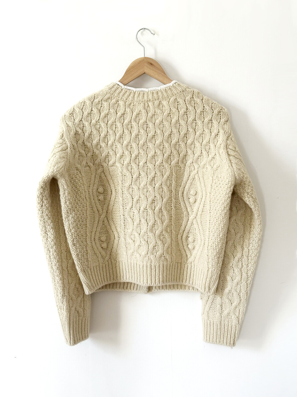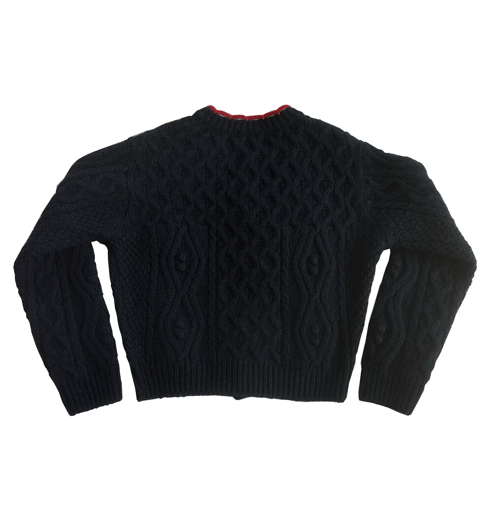 핸드메이드 꽃이 장식되어진 울 100% 꽈배기 패턴의 니트 가디건입니다.