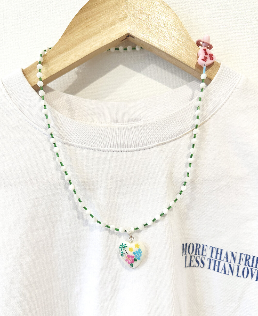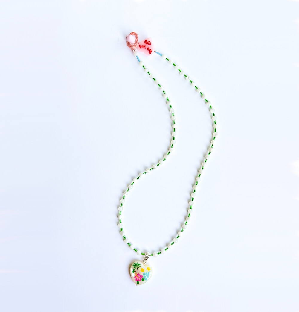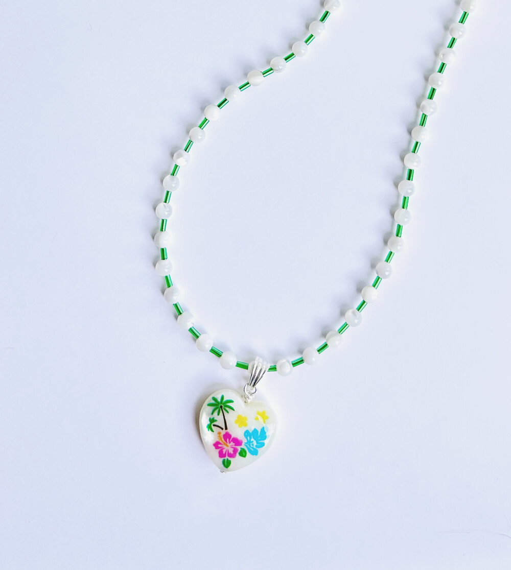 하트 모양의 자개 펜던트 위에 하와이안 무드의 야생화가 프린트된 목걸이입니다.