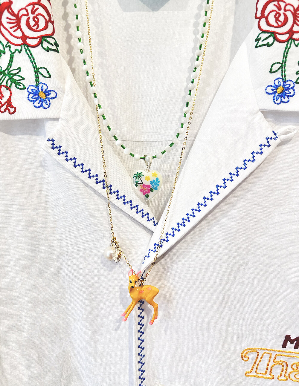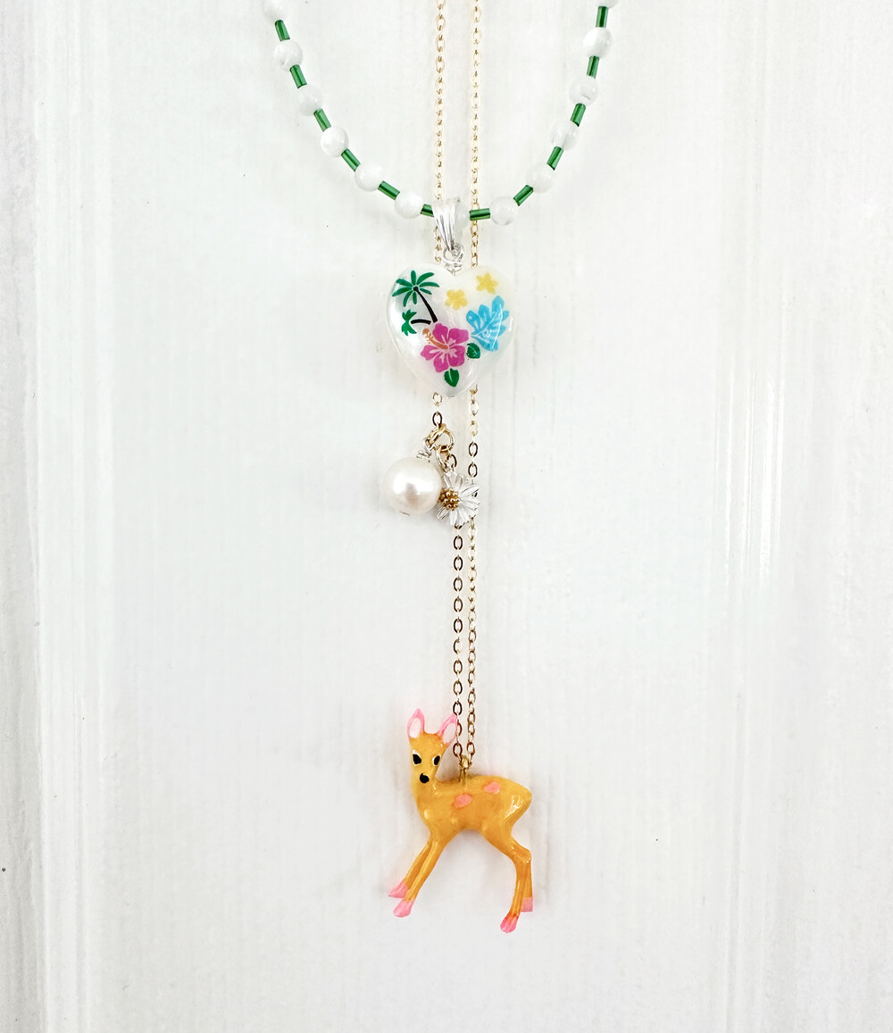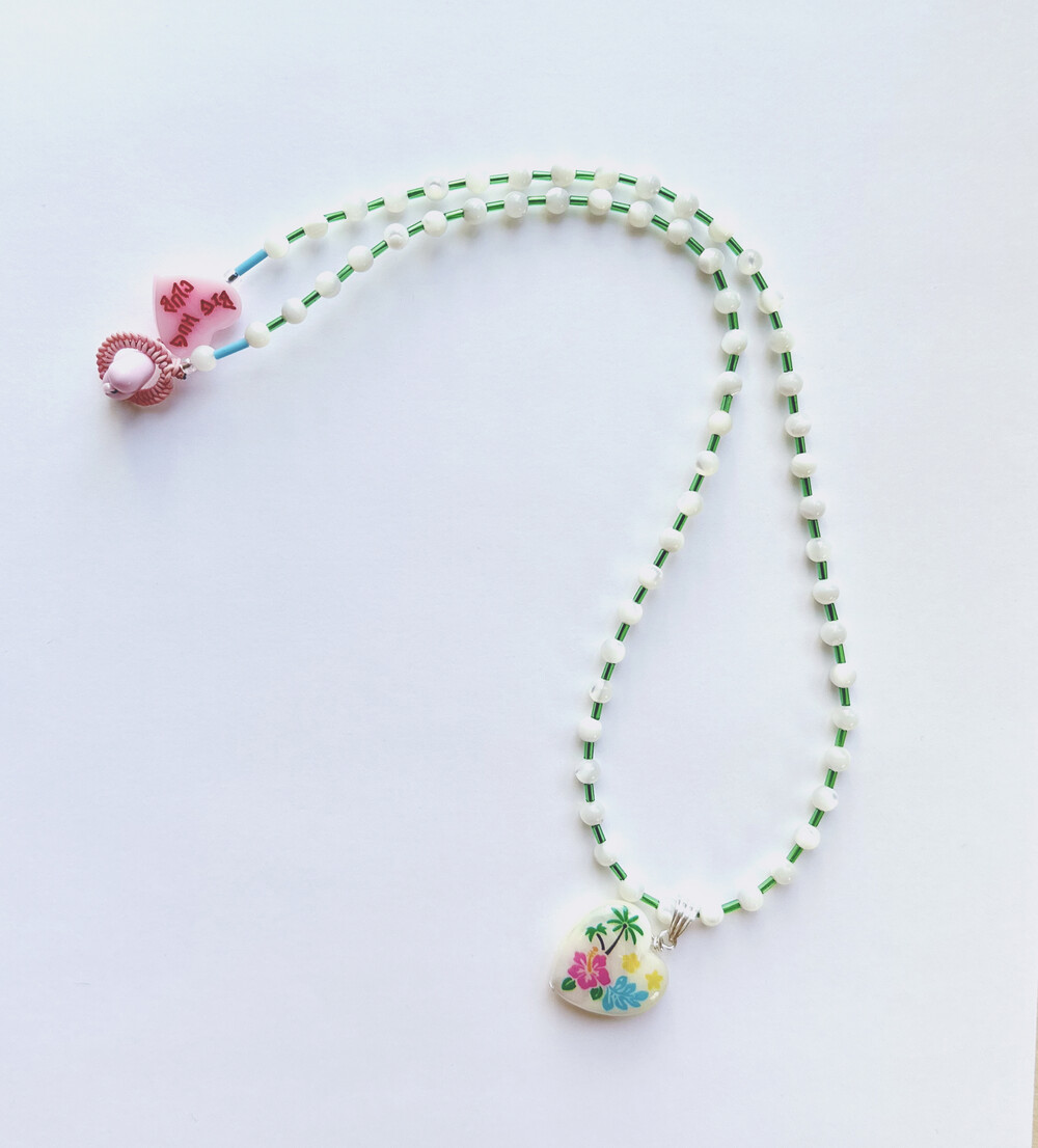 하트 모양의 자개 펜던트 위에 하와이안 무드의 야생화가 프린트된 목걸이입니다.