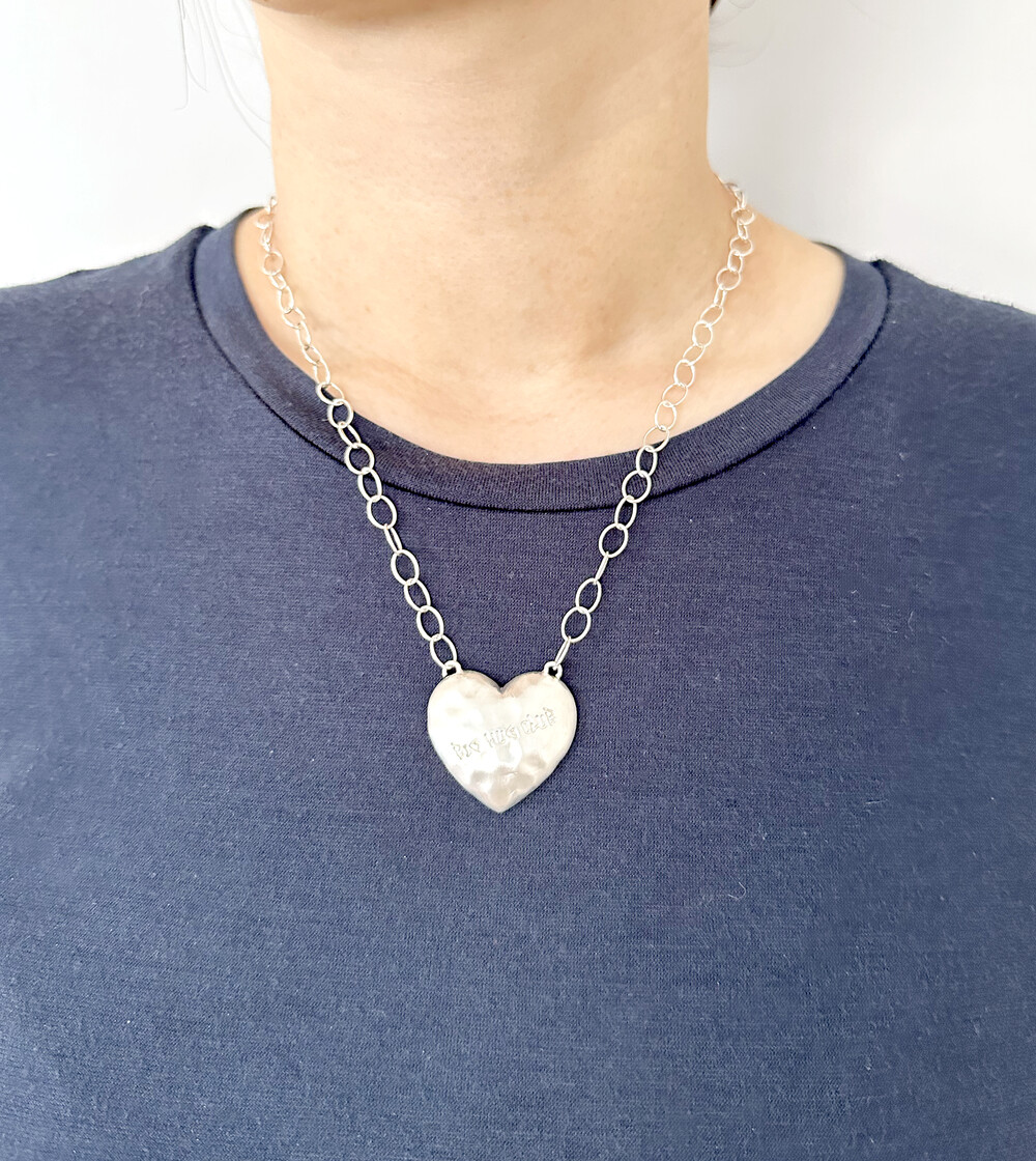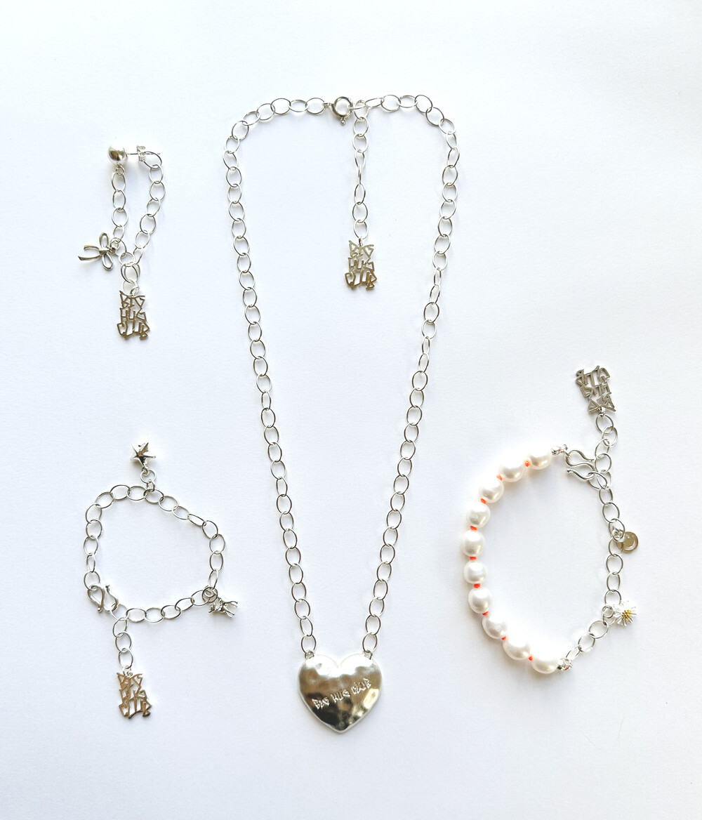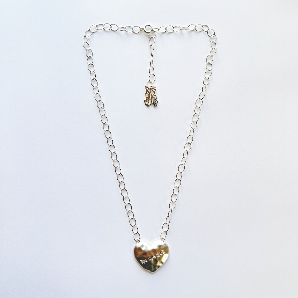 목걸이는 로고가 있는 실버 하트 펜던트 목걸이입니다.