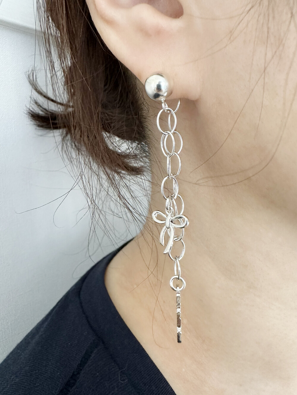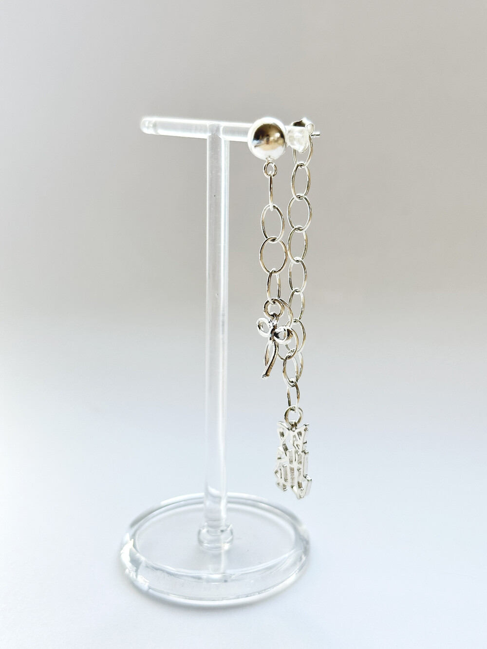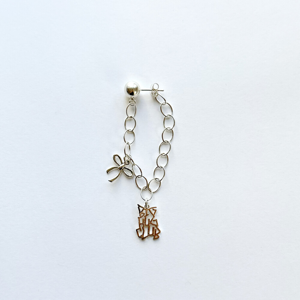 귀걸이는 리본과 로고 참이 있는 피어싱 귀걸이입니다.