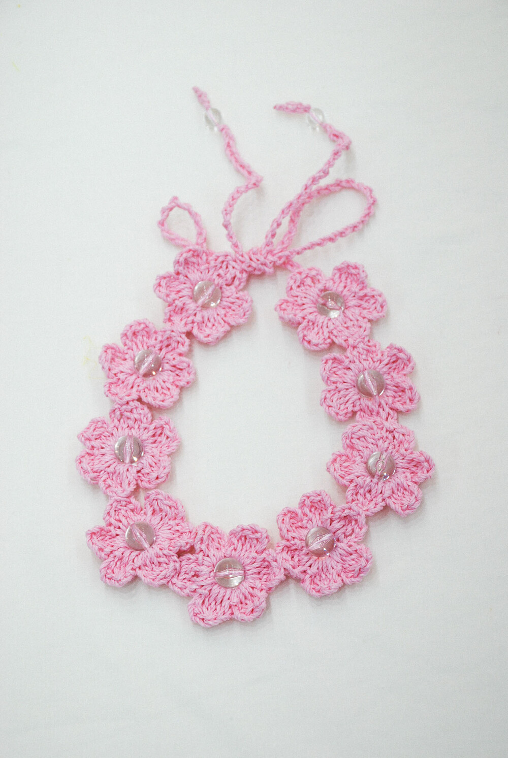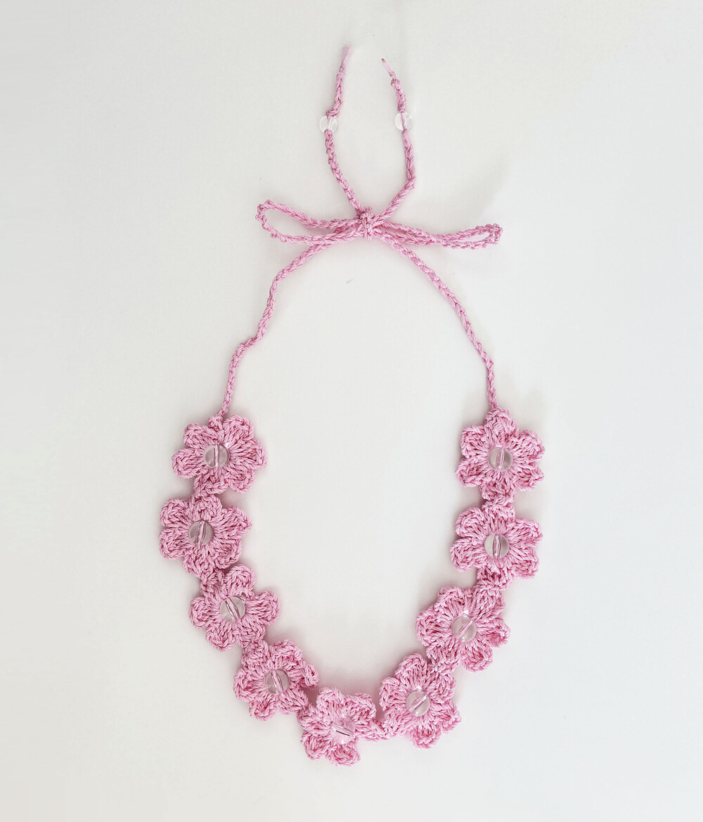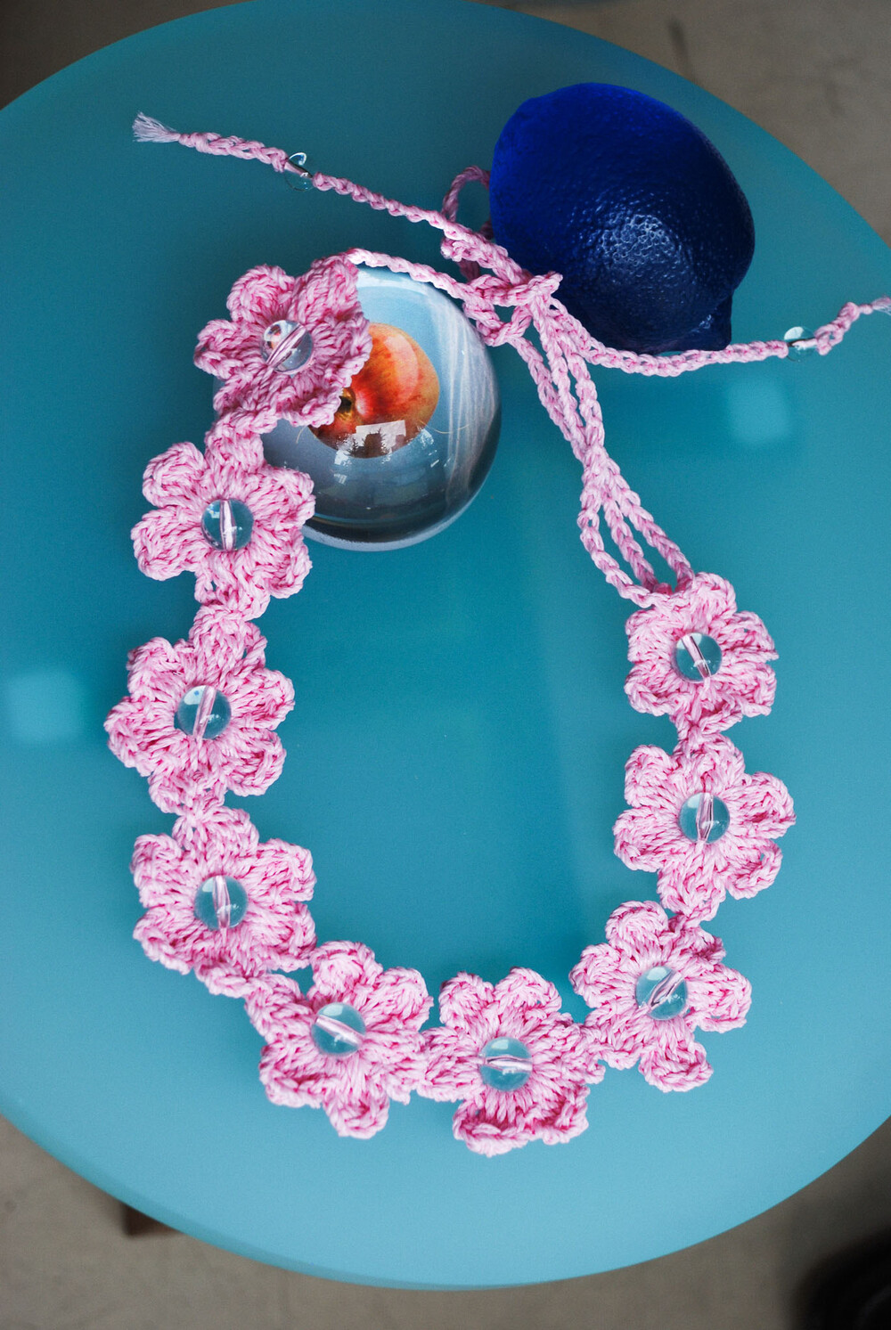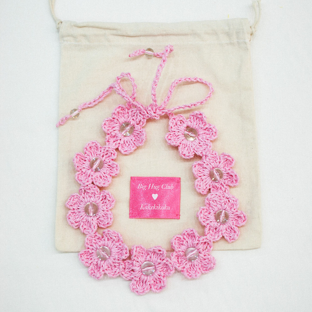 핸드메이드로 짜인 큼직한 니트 꽃목걸이로
