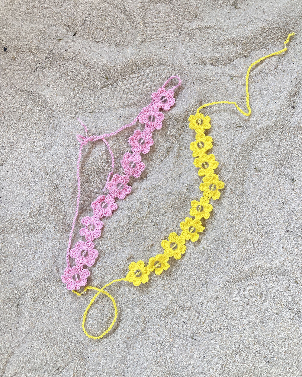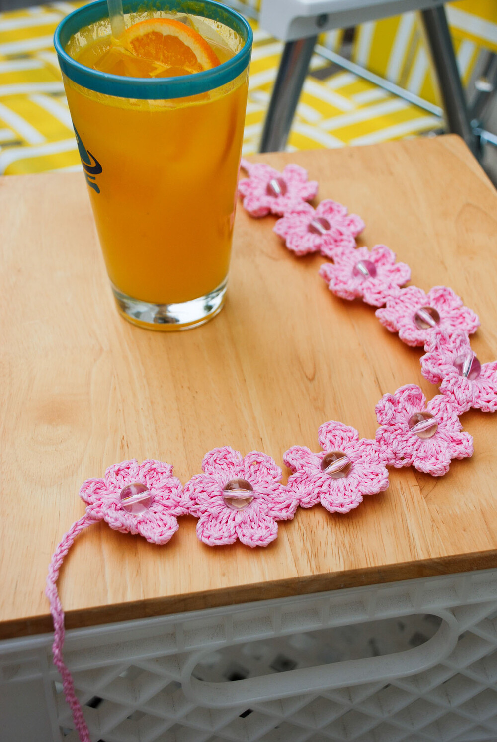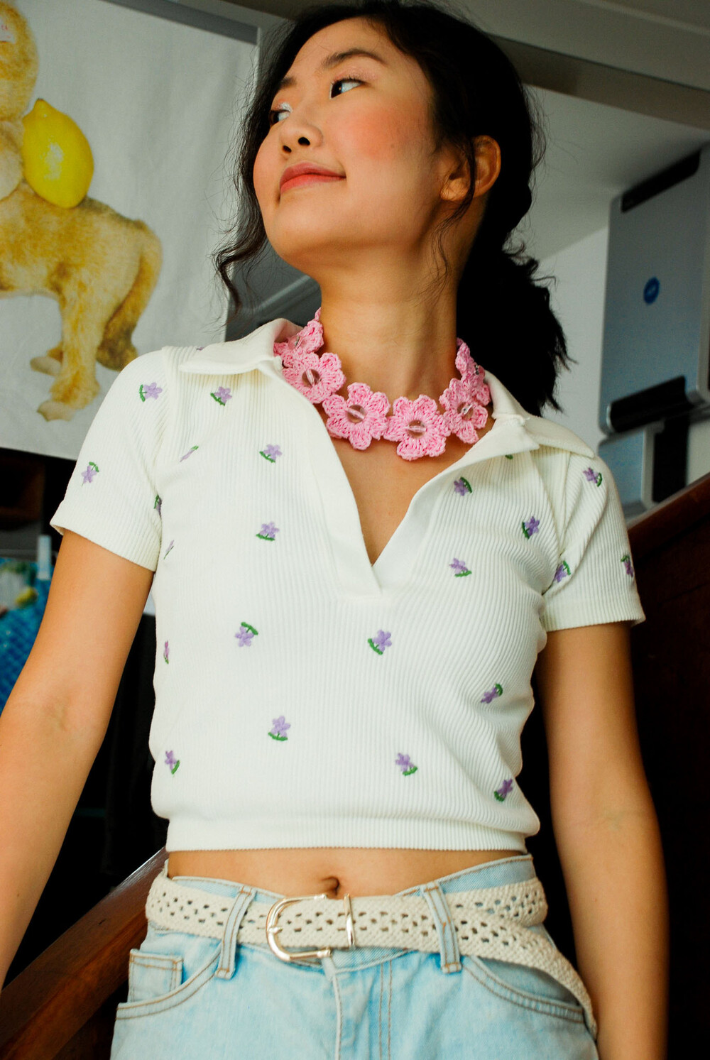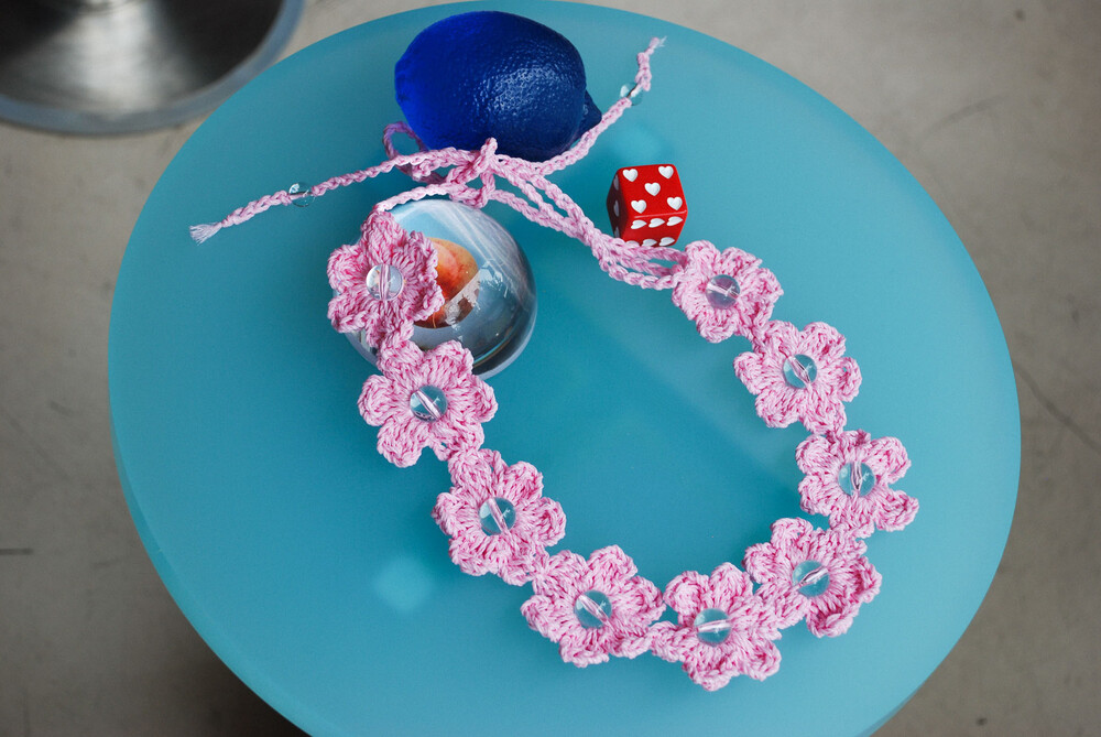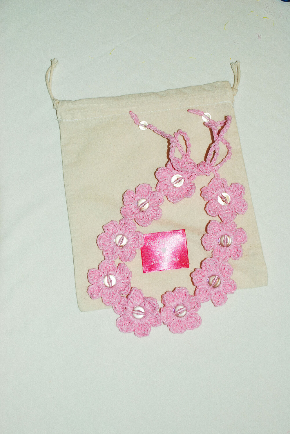 핸드메이드로 짜인 큼직한 니트 꽃목걸이로