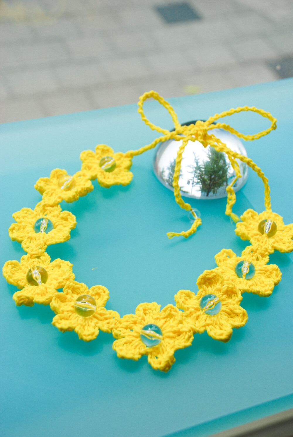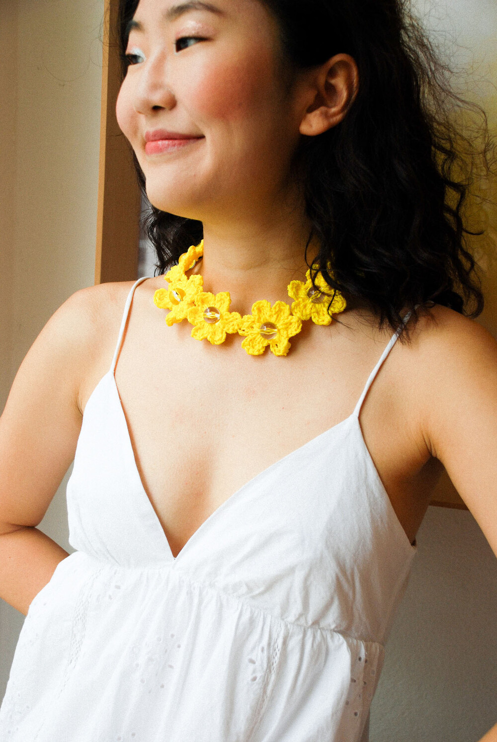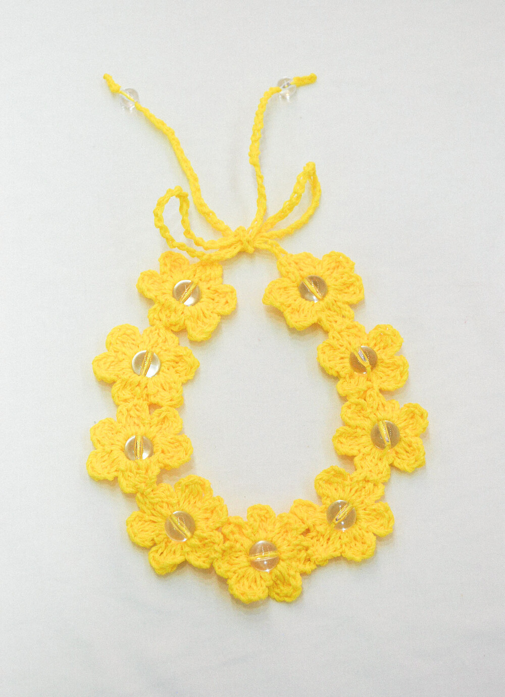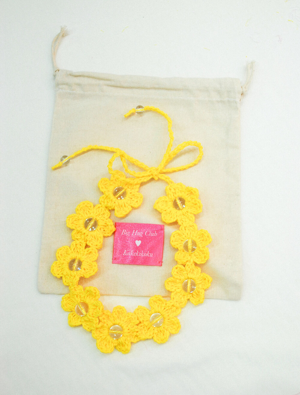 핸드메이드로 짜인 큼직한 니트 꽃목걸이로
