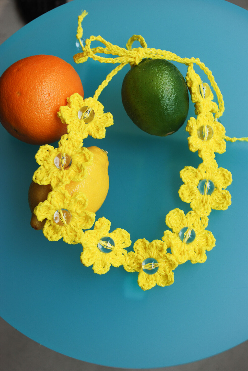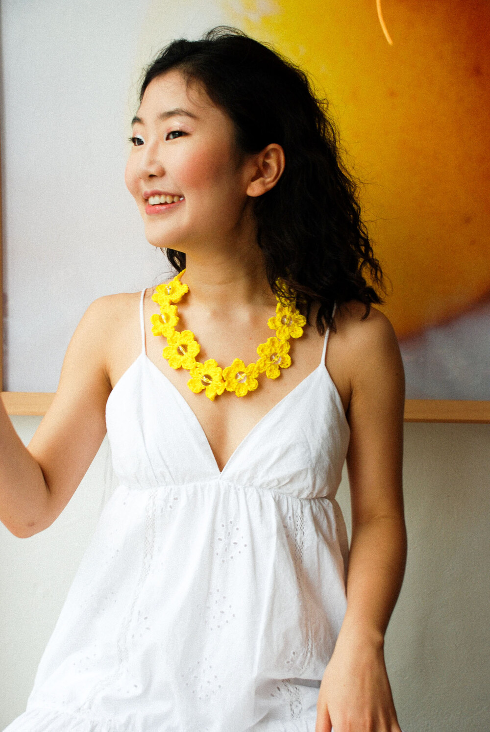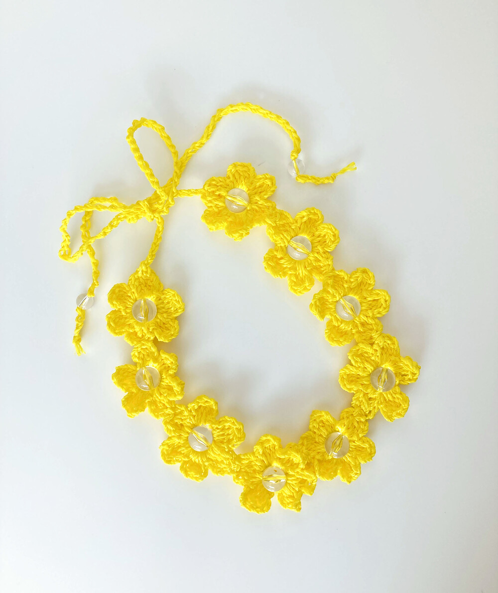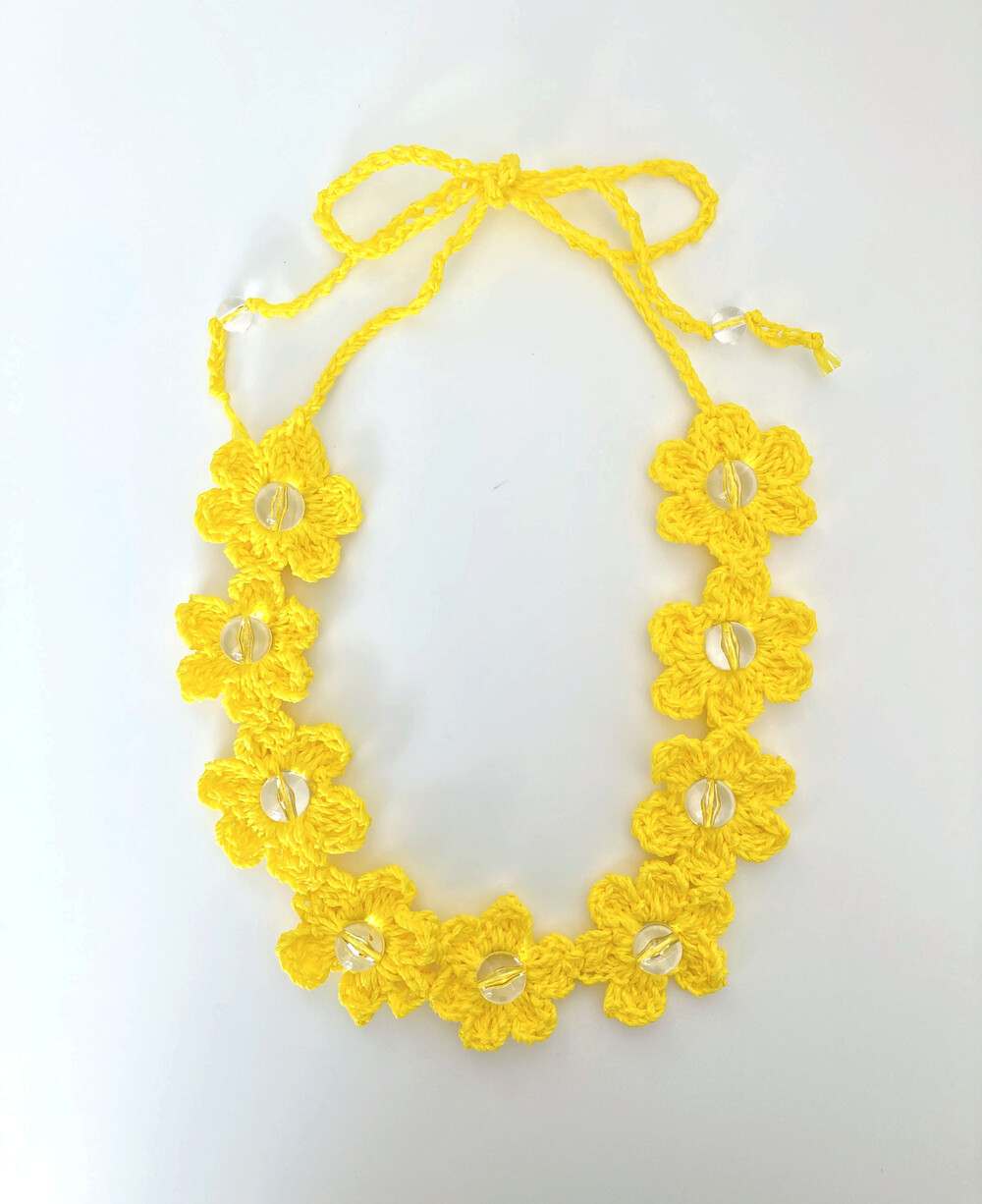 핸드메이드로 짜인 큼직한 니트 꽃목걸이로