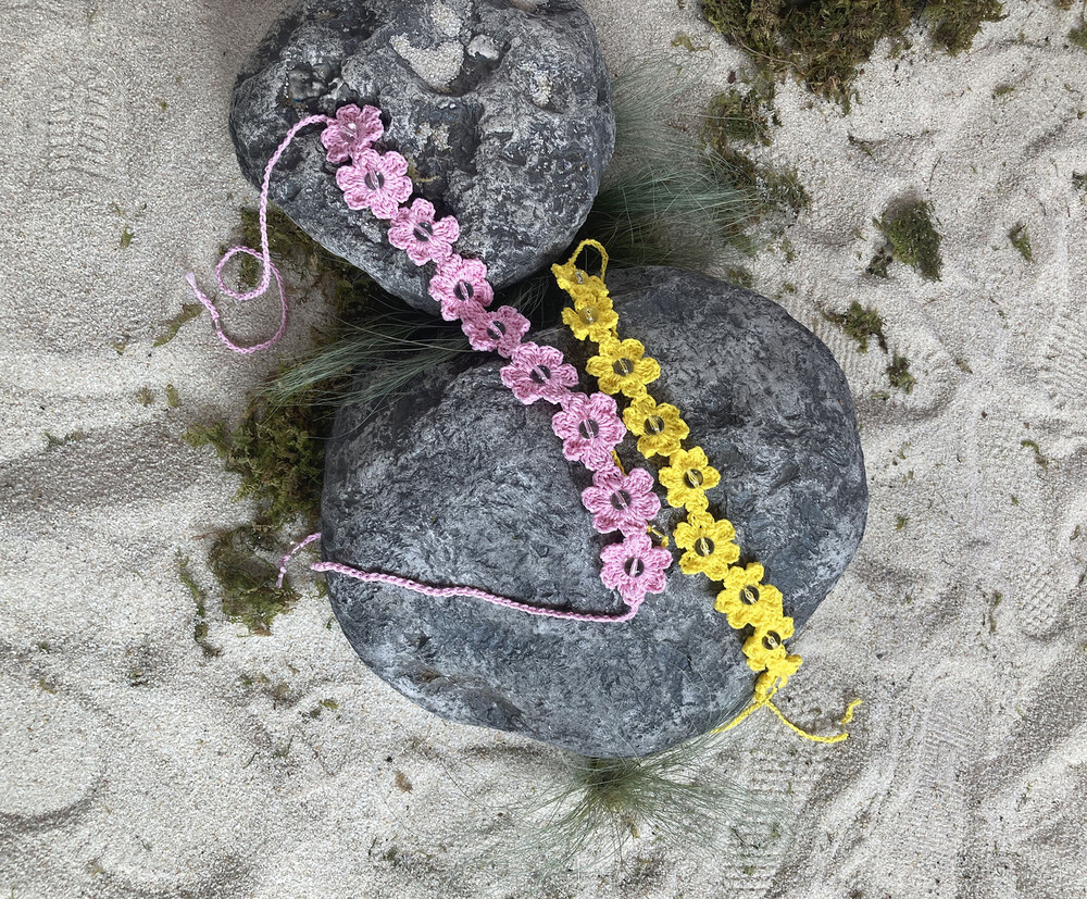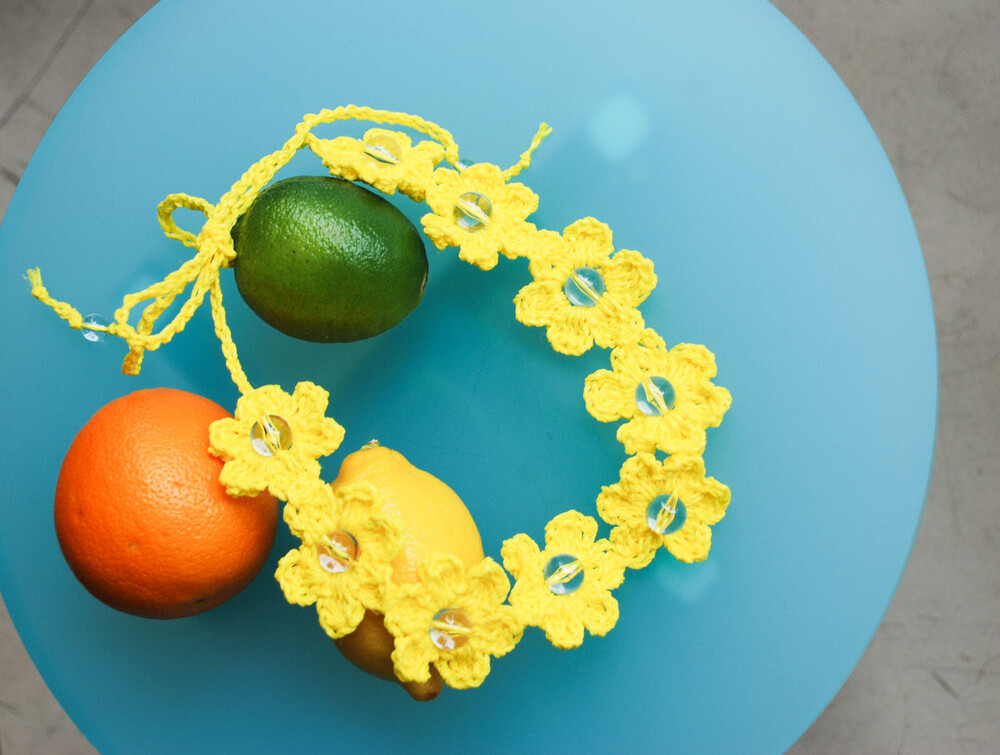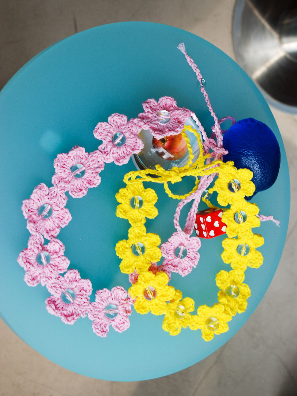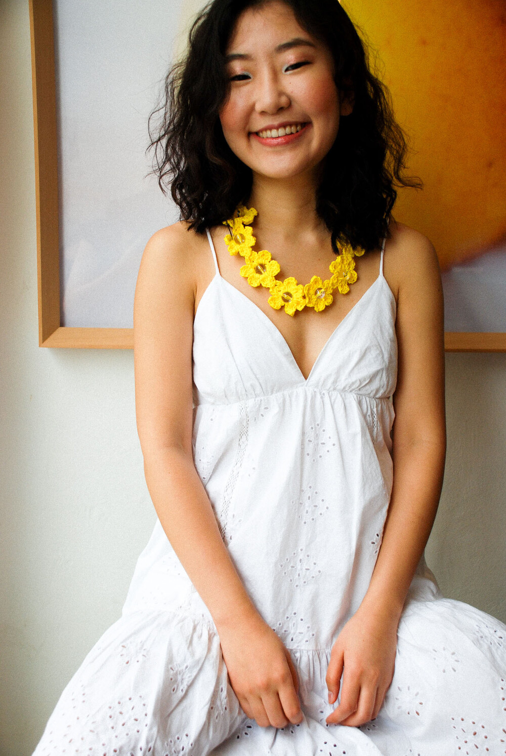 핸드메이드로 짜인 큼직한 니트 꽃목걸이로