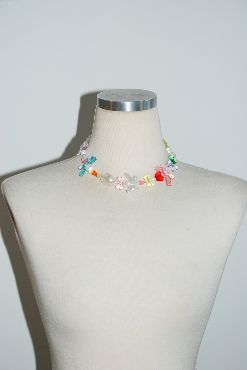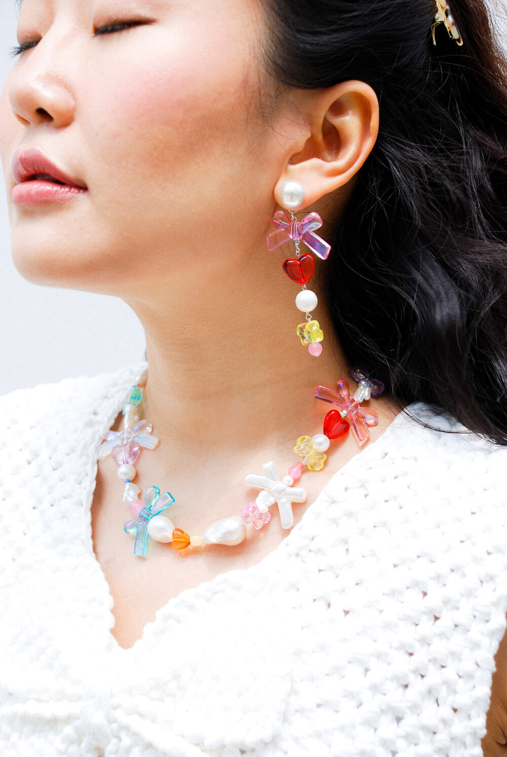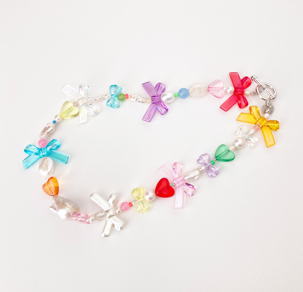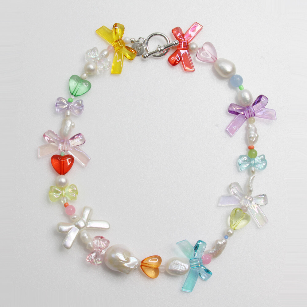 아크릴 리본과 양식 진주, 마노, 수정등 다양한 소재가 어울려진 목걸이입니다.