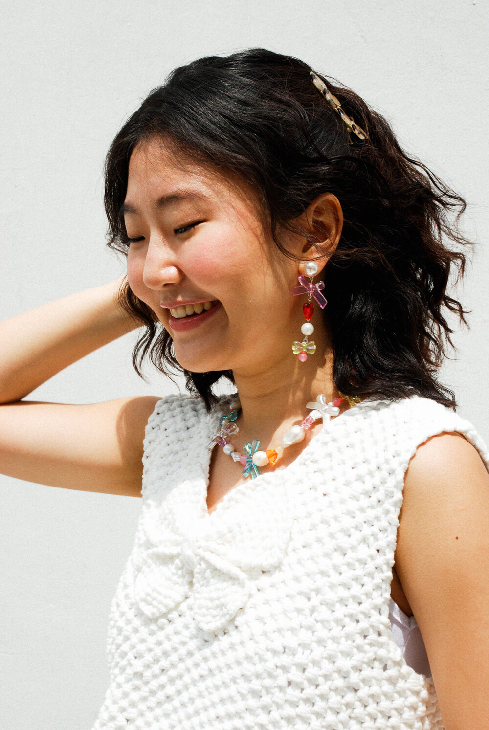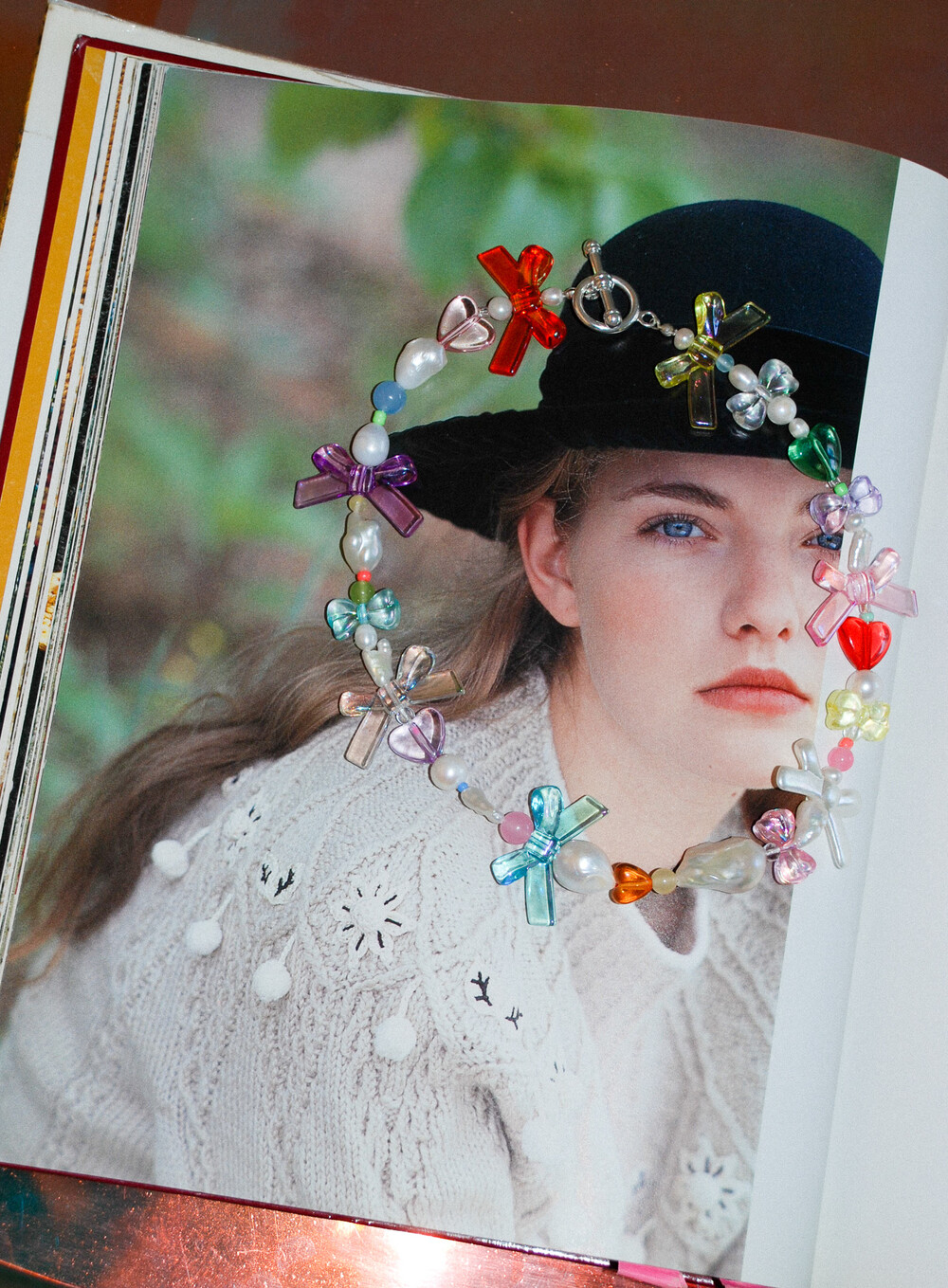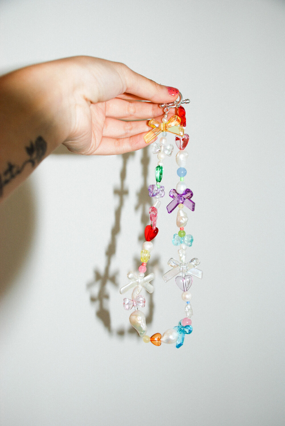 아크릴 리본과 양식 진주, 마노, 수정등 다양한 소재가 어울려진 목걸이입니다.