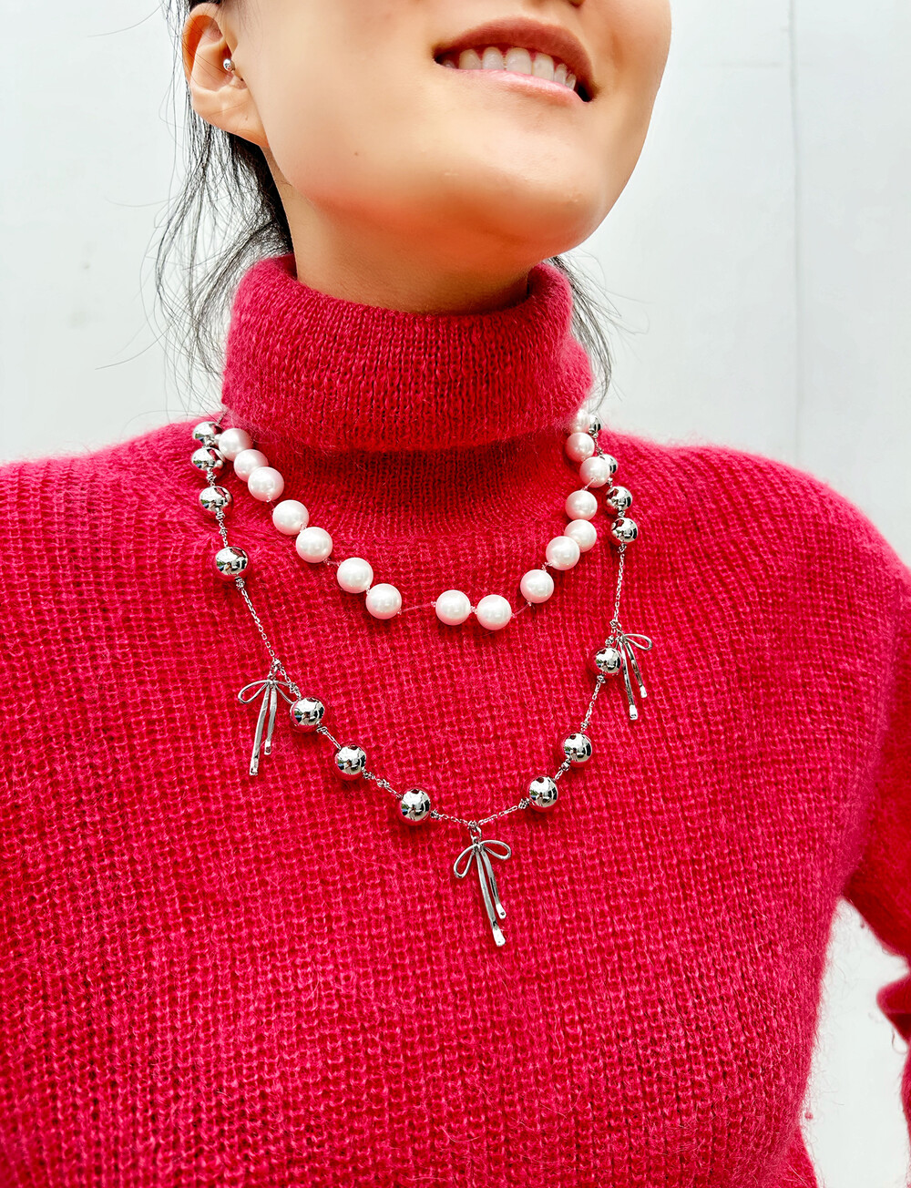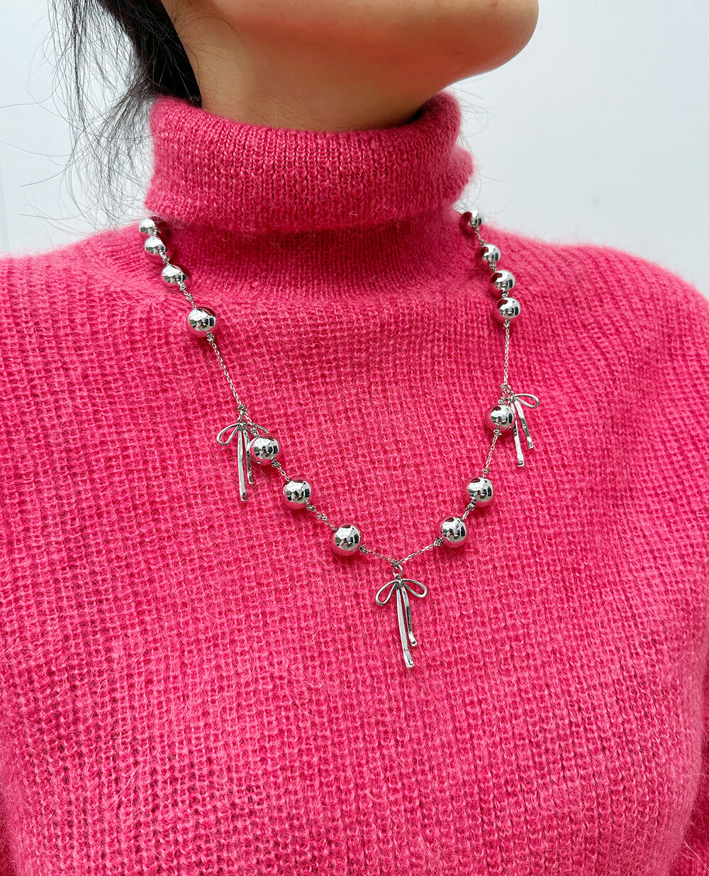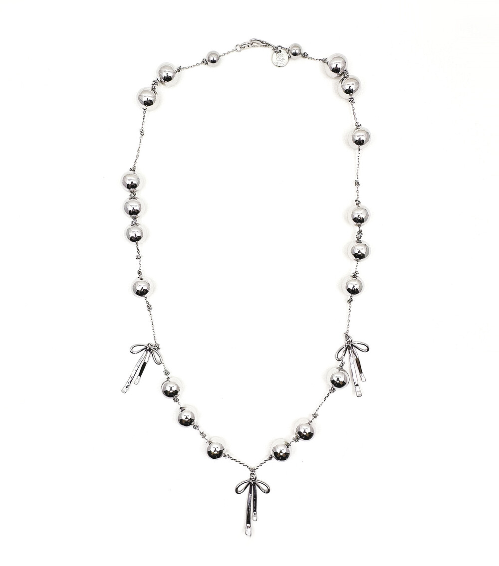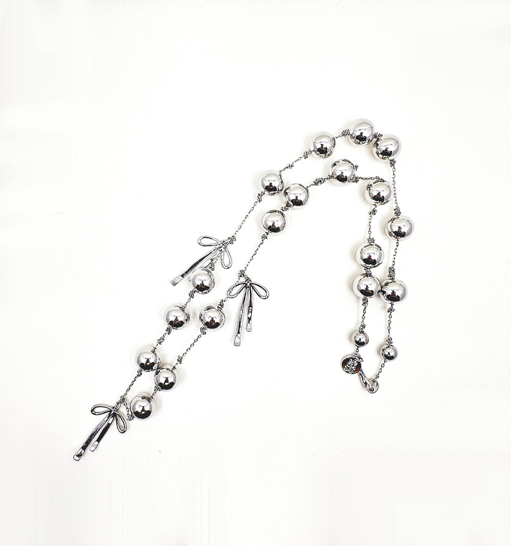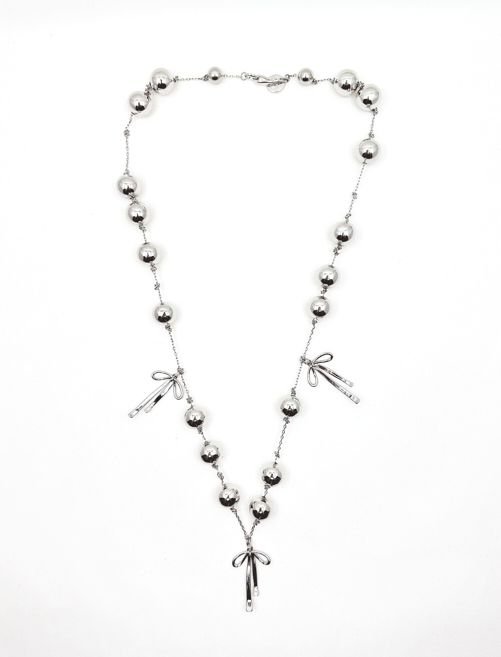 체인을 묶어 볼과 리본 펜던트를 고정한 유니크한 디자인의 목걸이입니다.