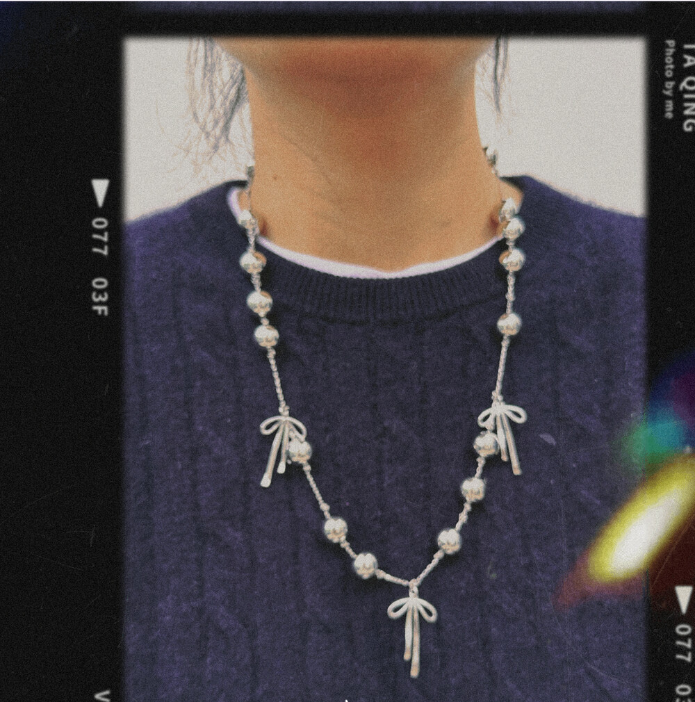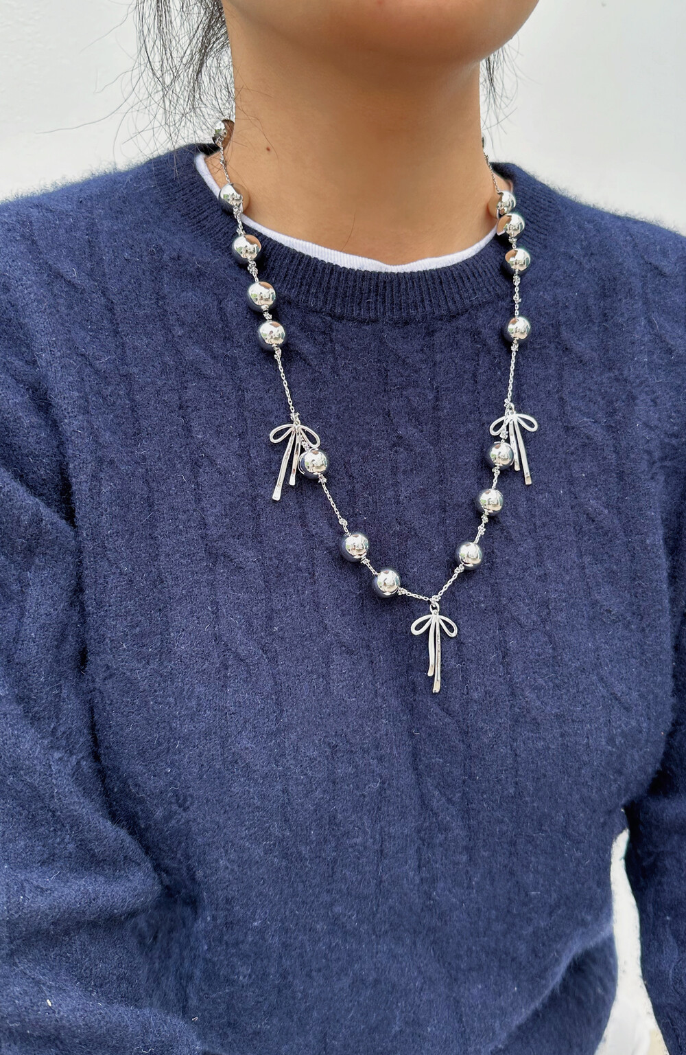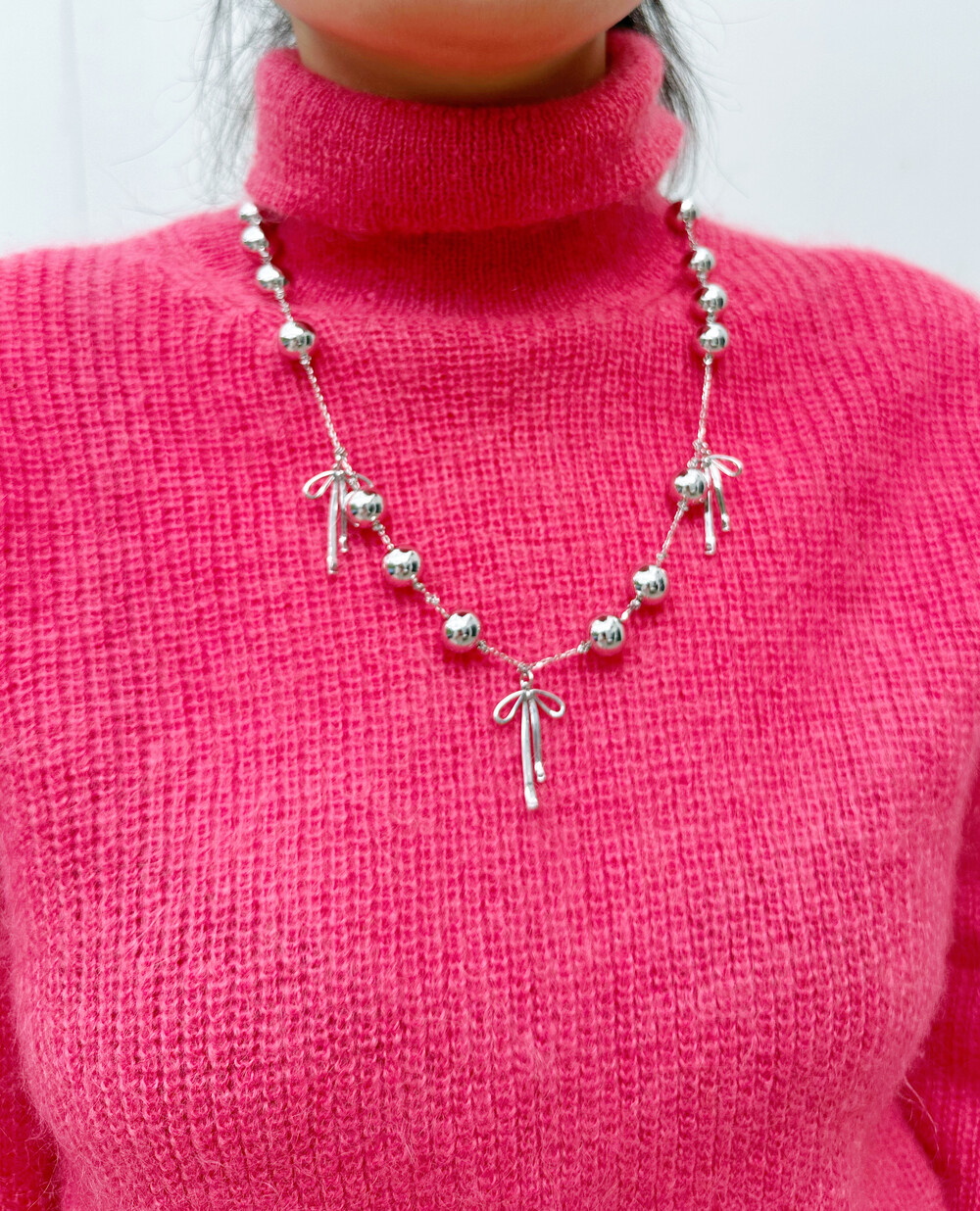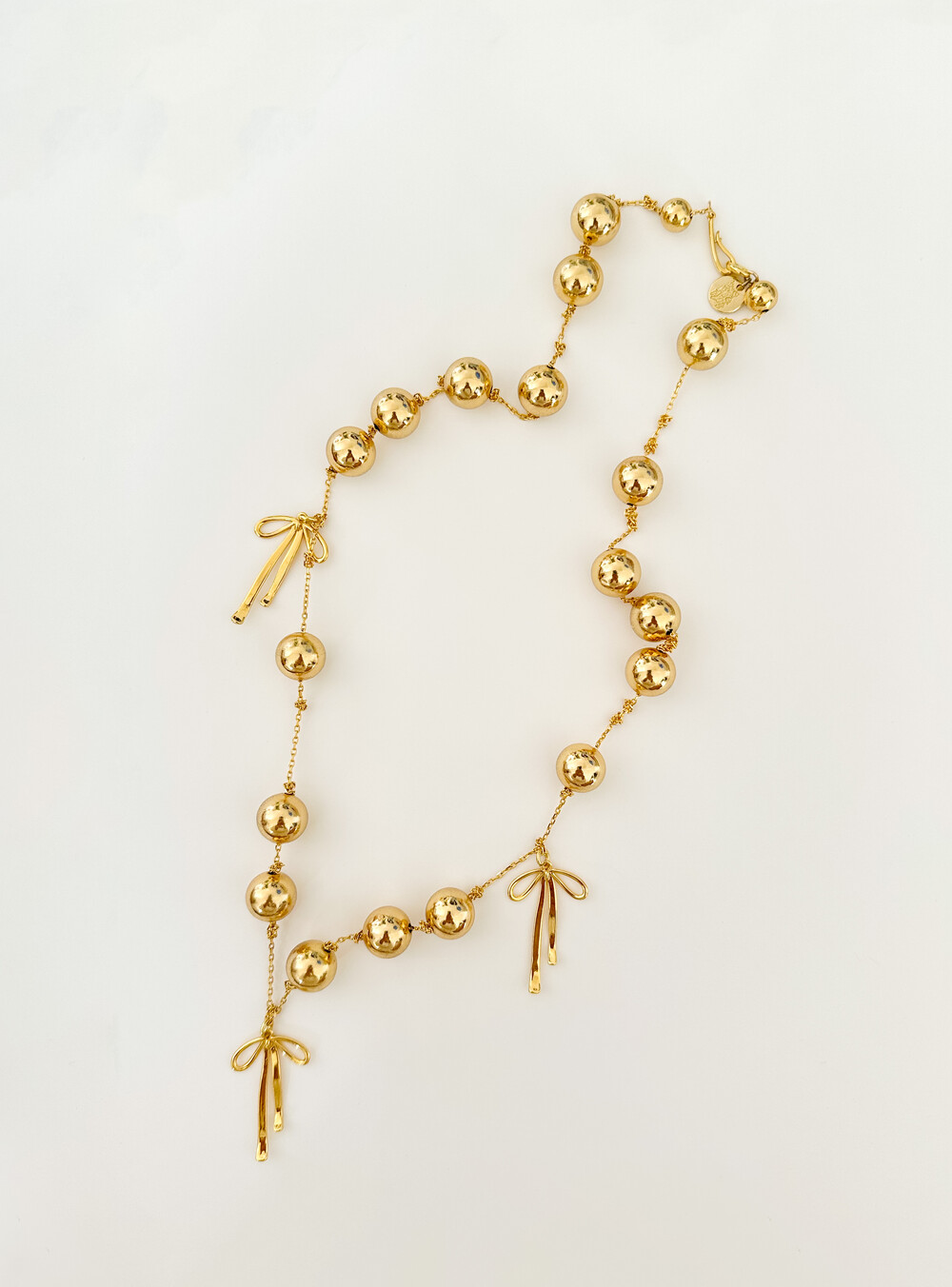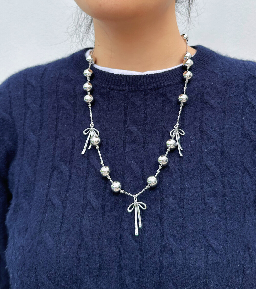 체인을 묶어 볼과 리본 펜던트를 고정한 유니크한 디자인의 목걸이입니다.