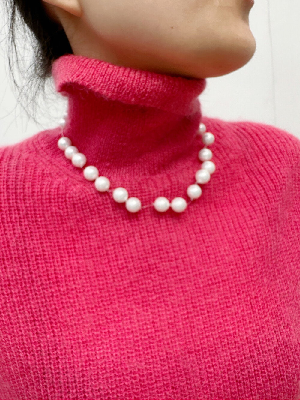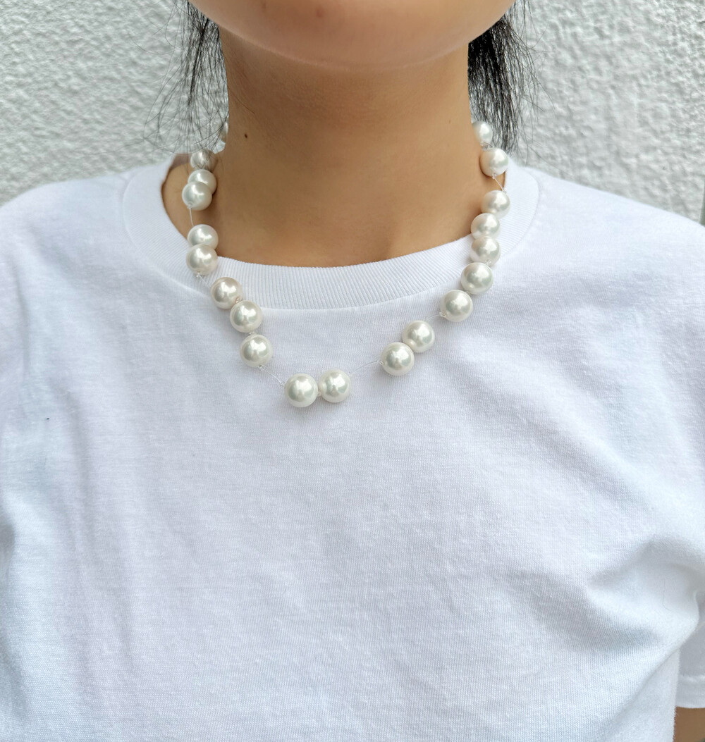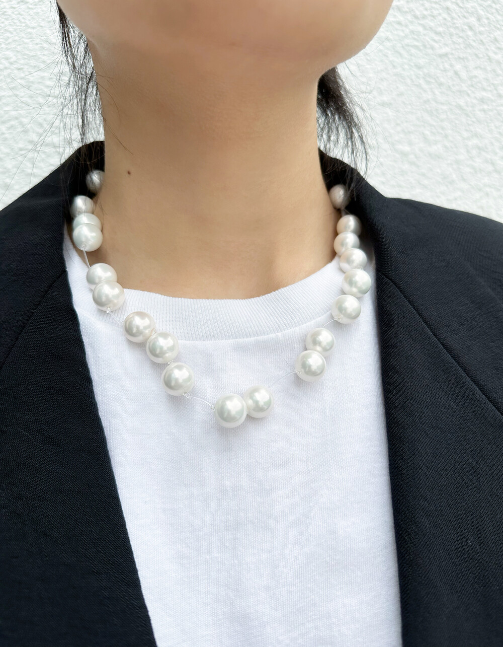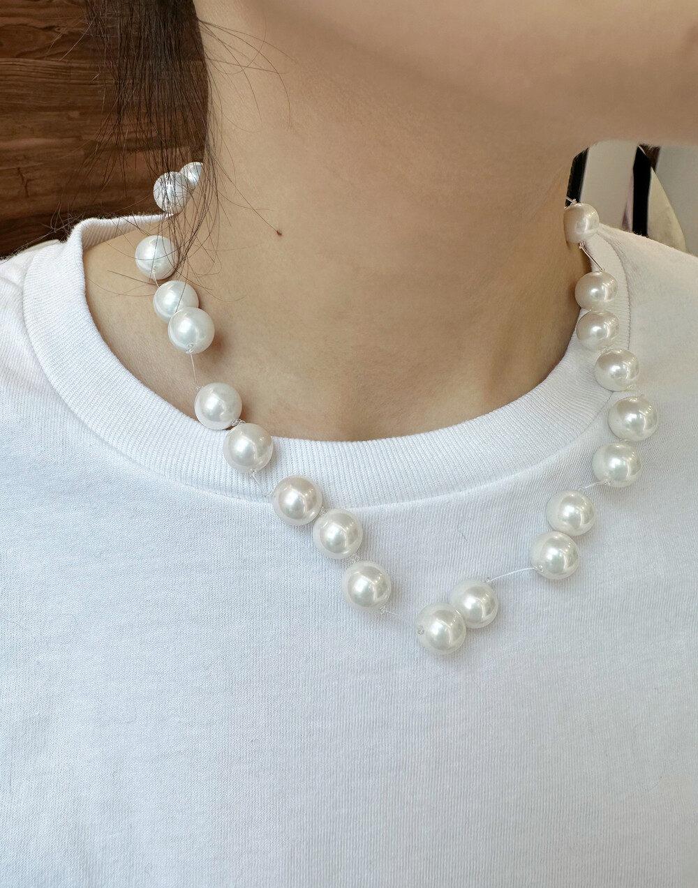 투명한 두꺼운 낚싯줄이 불규칙한 간격으로 띄워 묶은 자유로운 형태의 목걸이로 유니크한 아이템입니다.