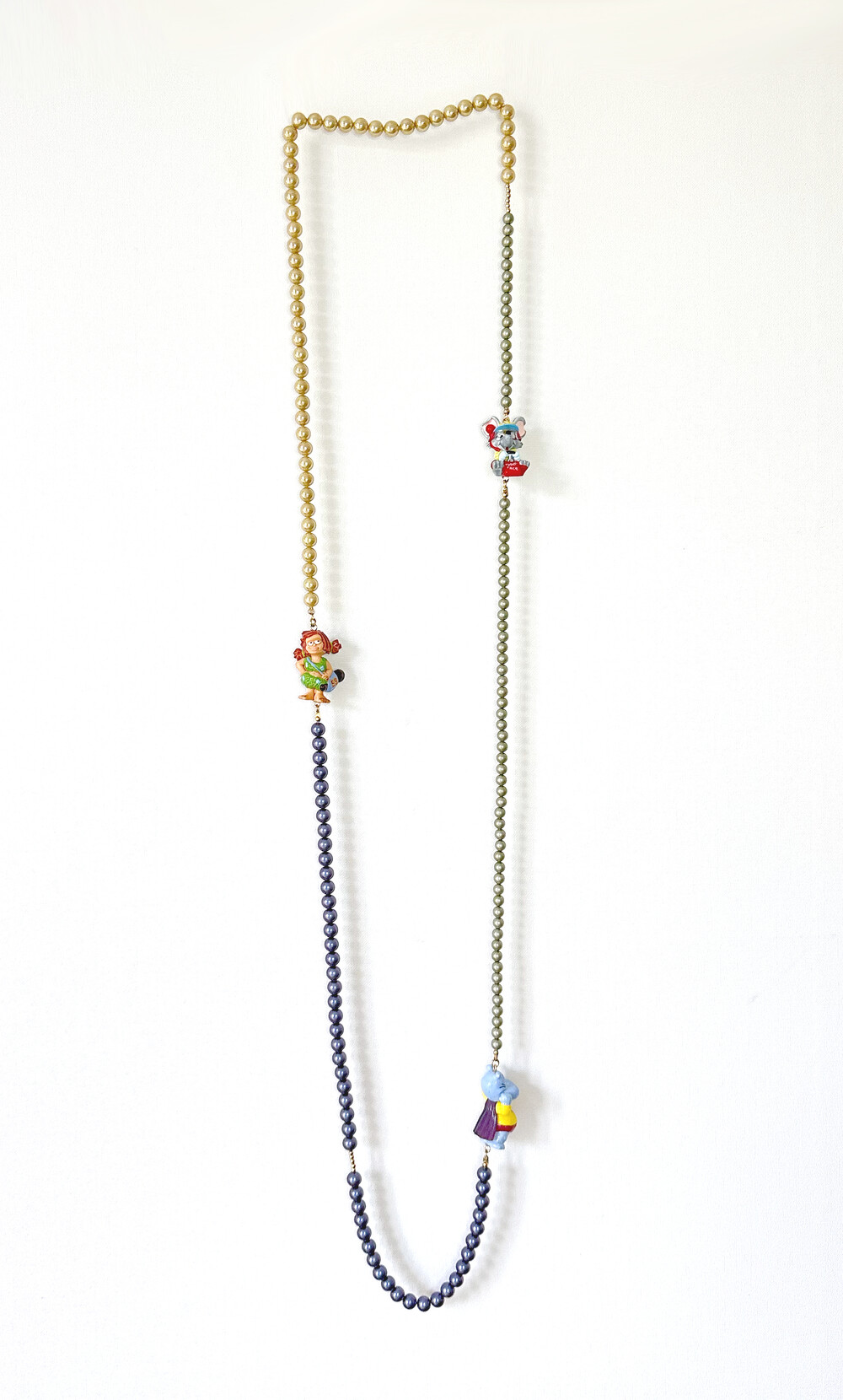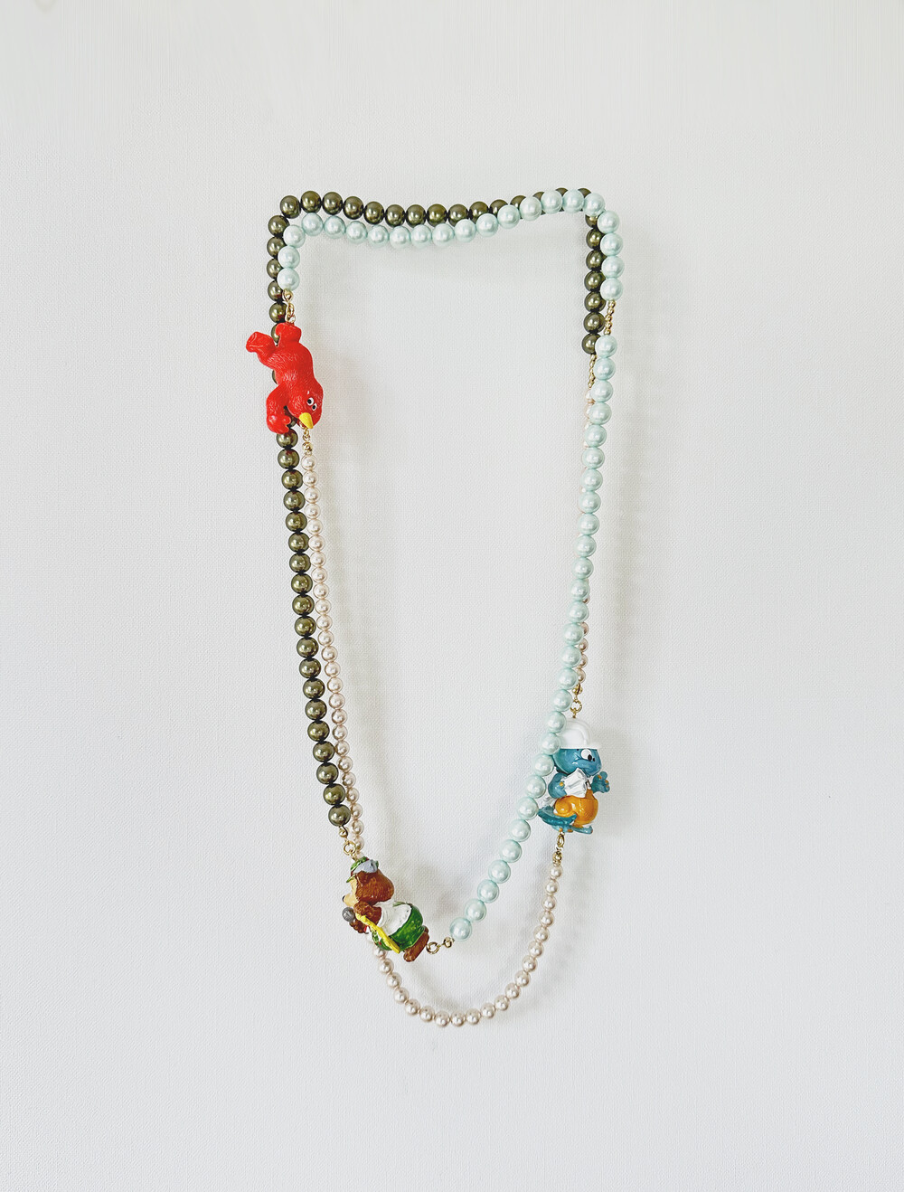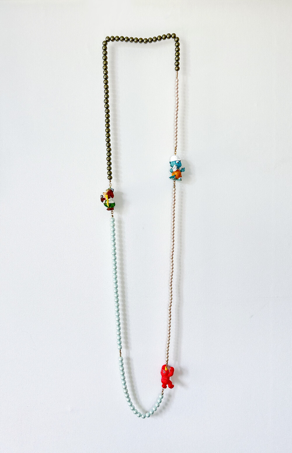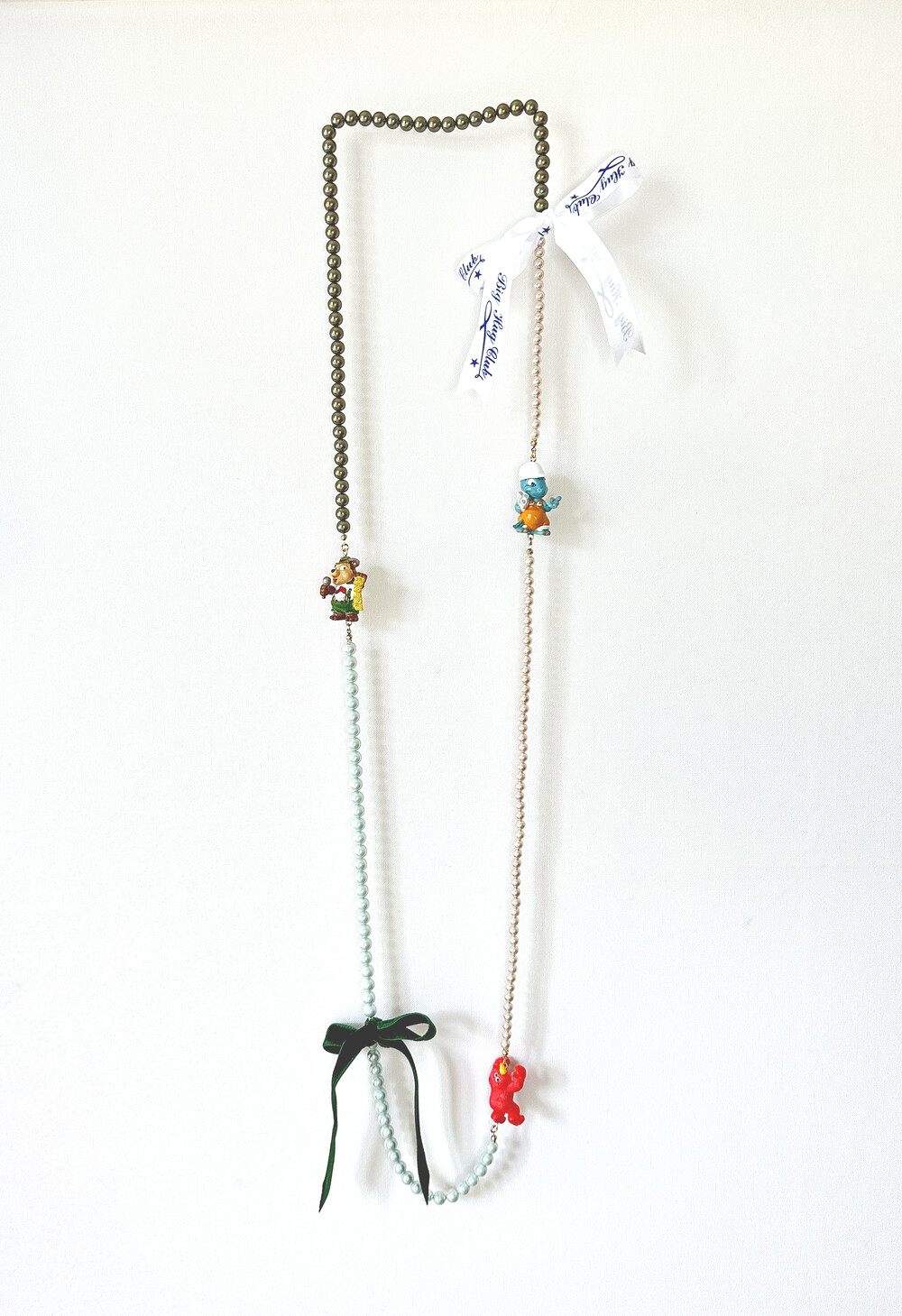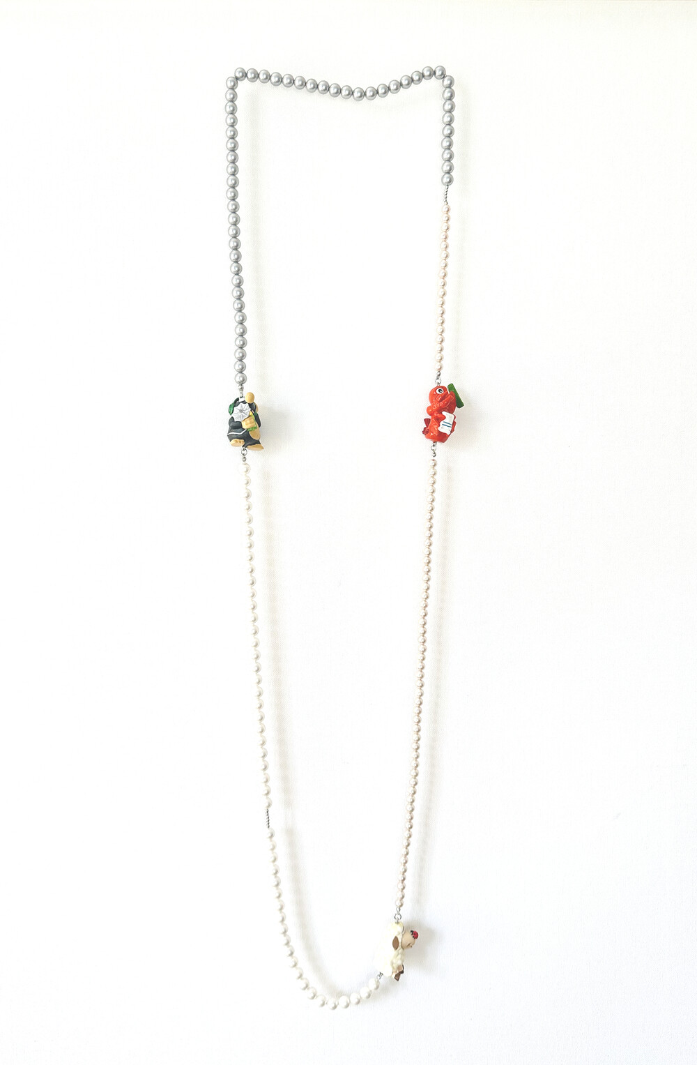 빈티지 작은 플라스틱 피규어를 재활용하여 제작한 긴 진주 목걸이입니다.