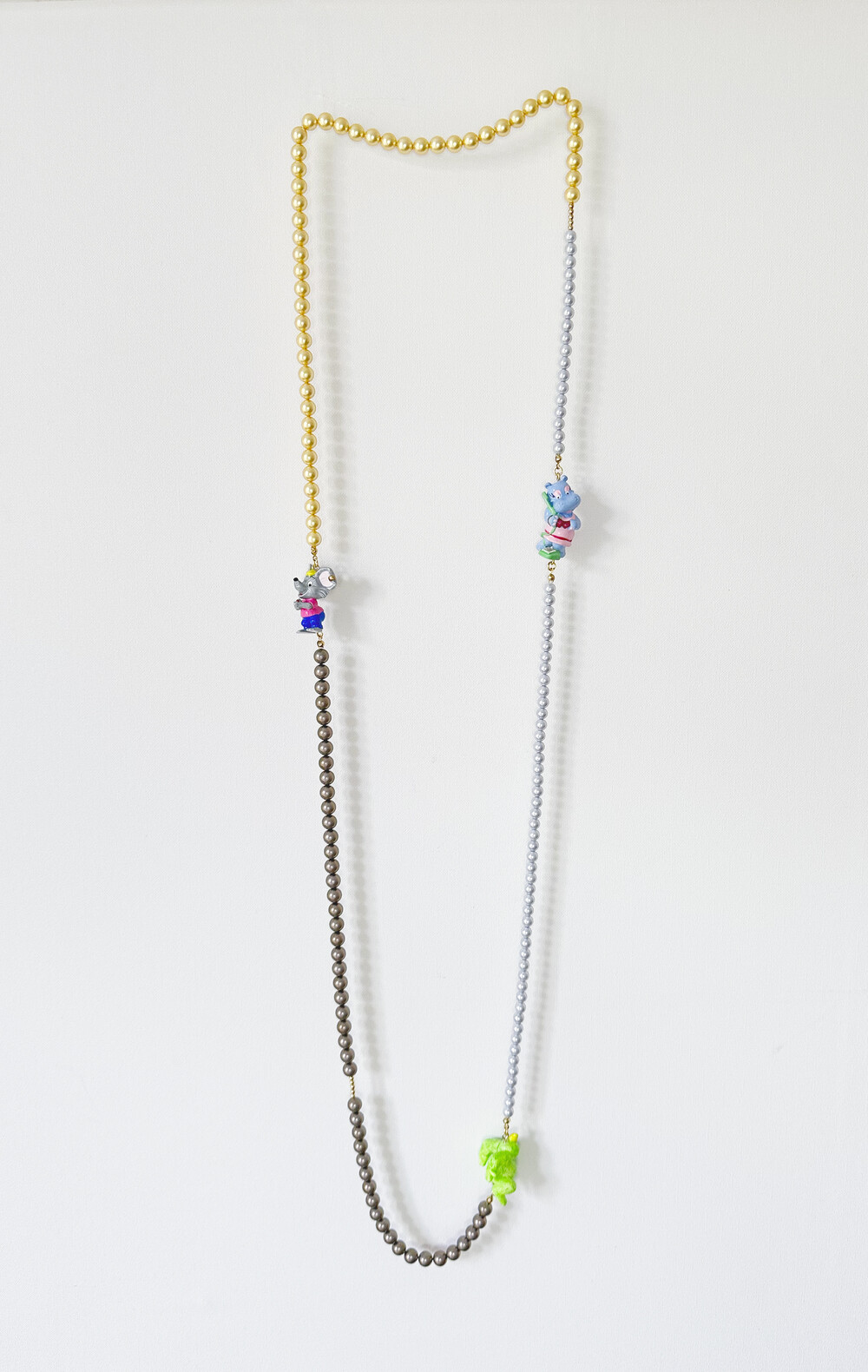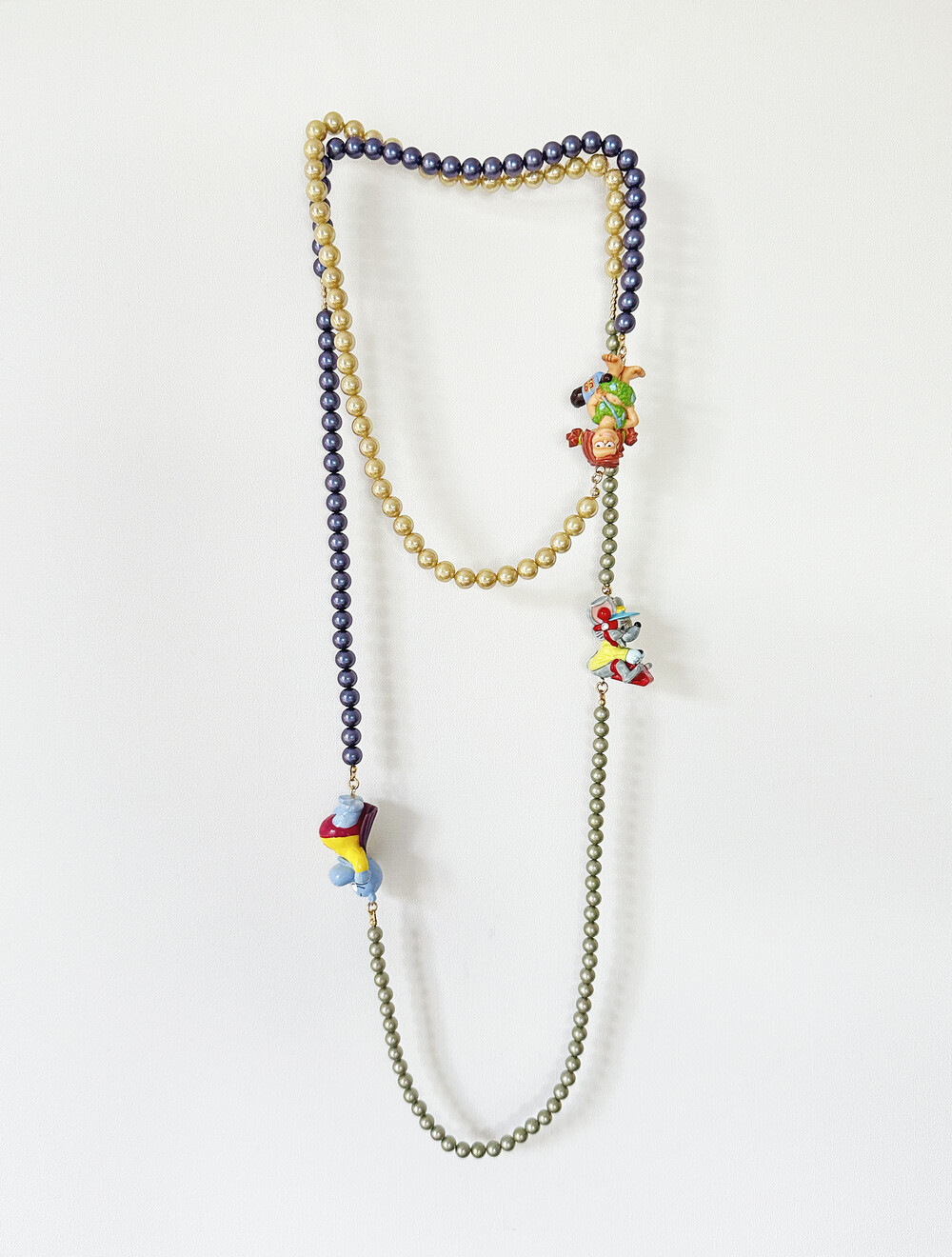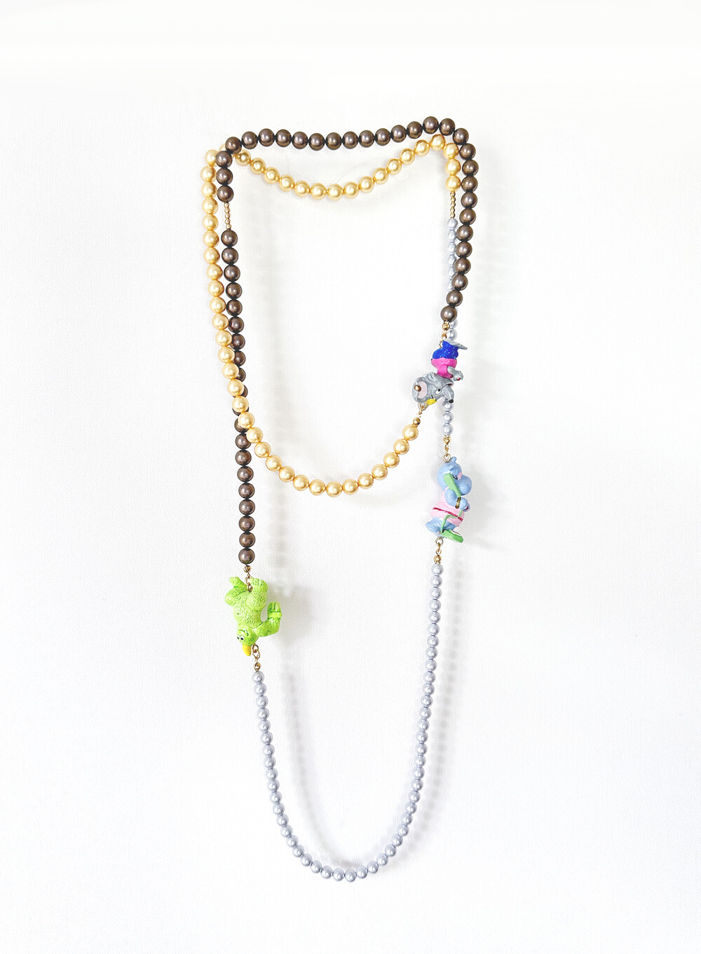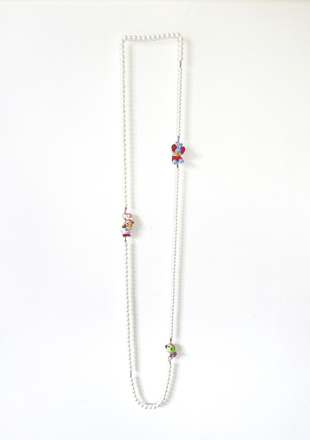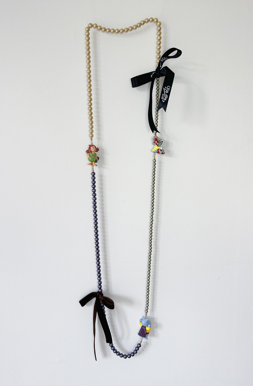 빈티지 작은 플라스틱 피규어를 재활용하여 제작한 긴 진주 목걸이입니다.