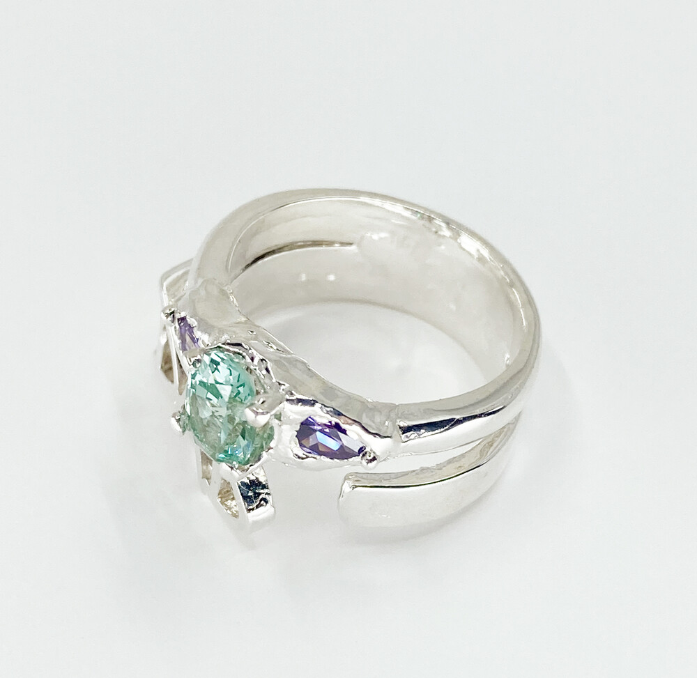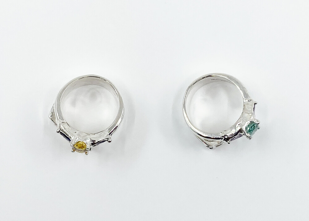 색상이 있는 큐빅과 은의 조화로 알 물림 형식의 방법으로 제작되어 더욱더 신비로운 내추럴한 형태를 가집니다.제작 방식의 특성상 자연스러운 울퉁불퉁한 표면을 가지며 모든 제품 하나하나 다 다른 형태를 가집니다.