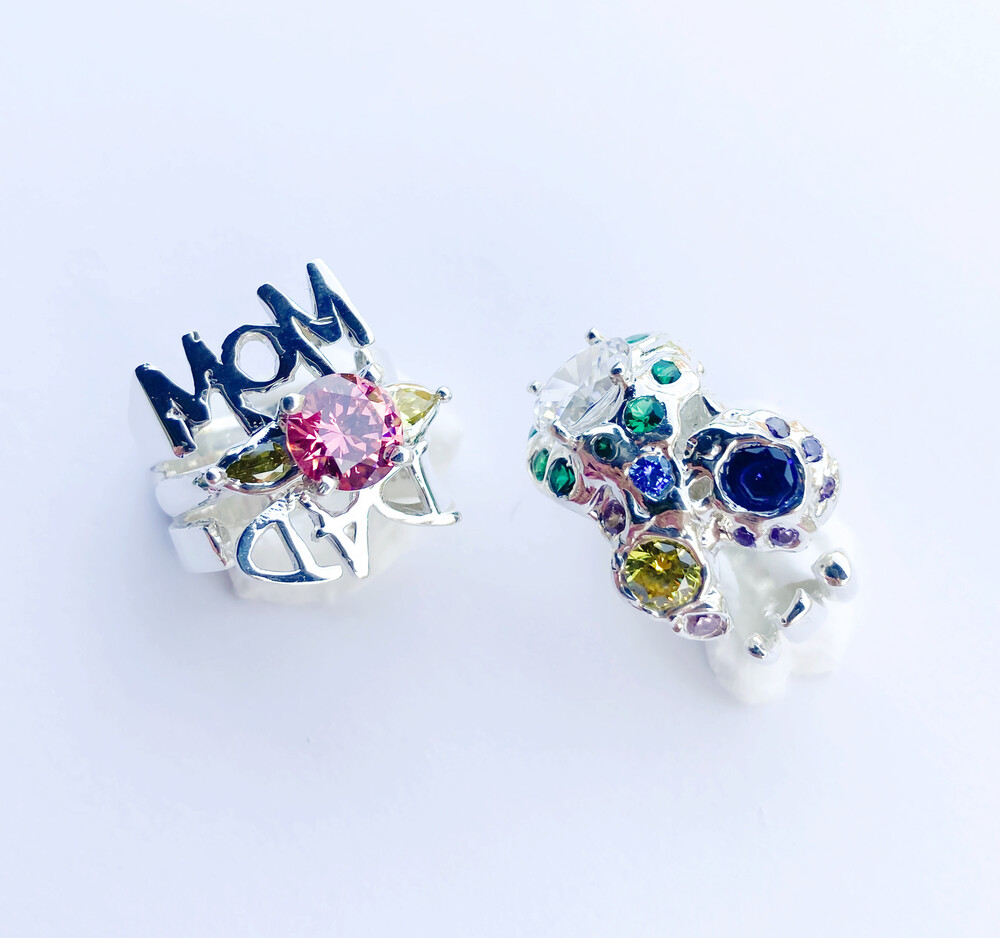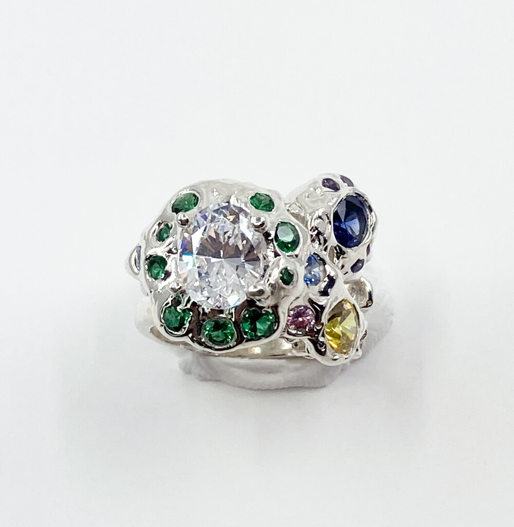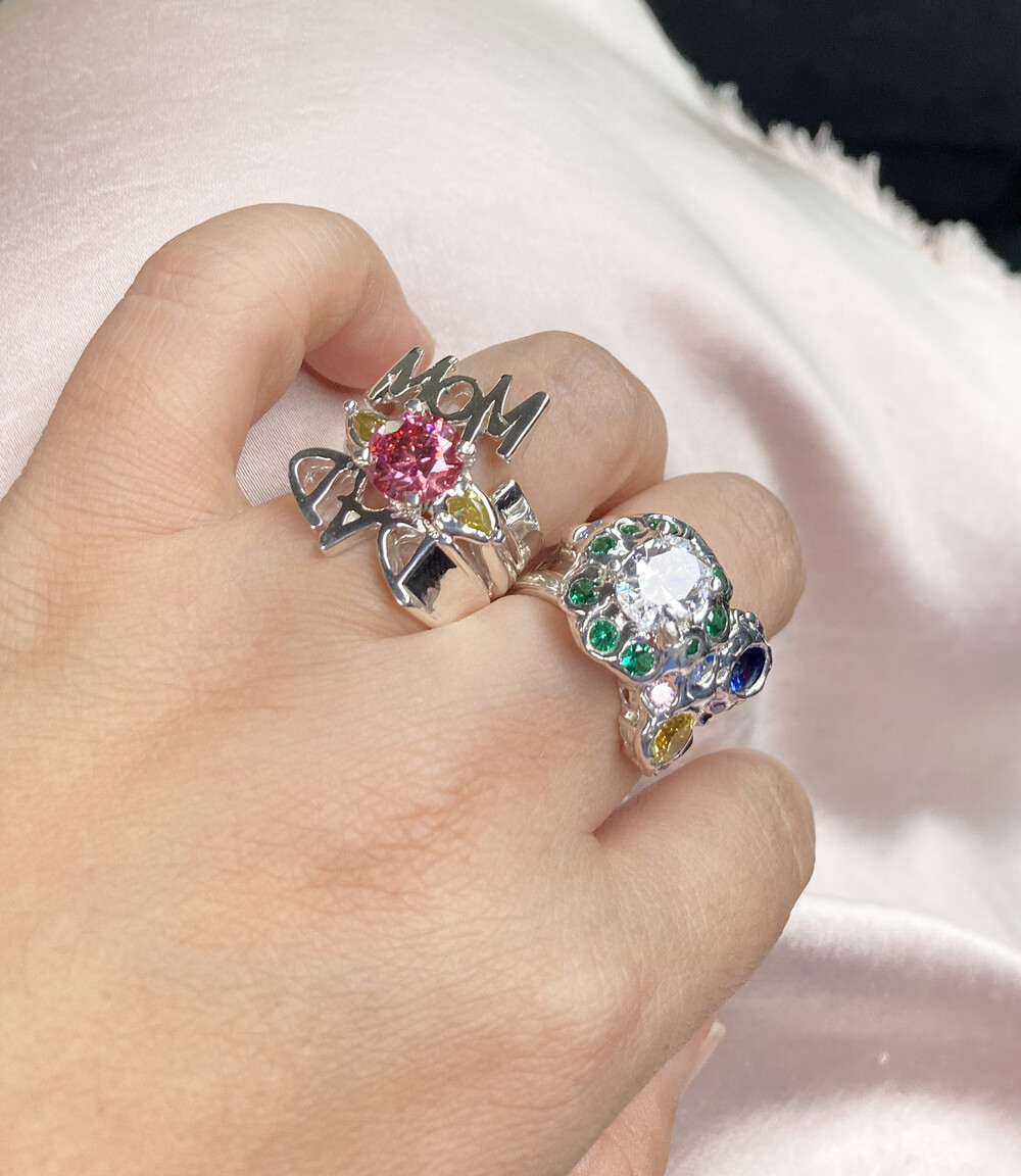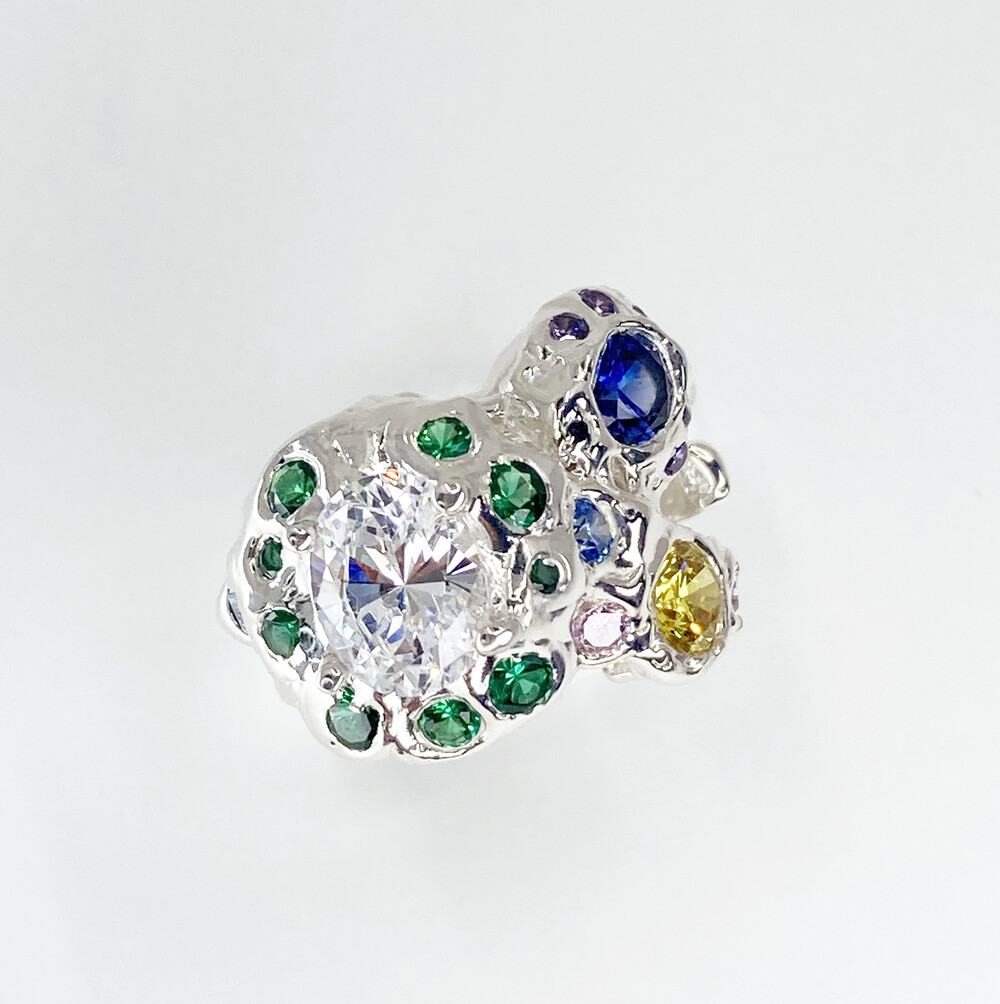 색상이 있는 큐빅과 은의 조화로 알 물림 형식의 방법으로 제작되어 더욱더 신비로운 내추럴한 형태를 가집니다.제작 방식의 특성상 자연스러운 울퉁불퉁한 표면을 가지며 모든 제품 하나하나 다 다른 형태를 가집니다.