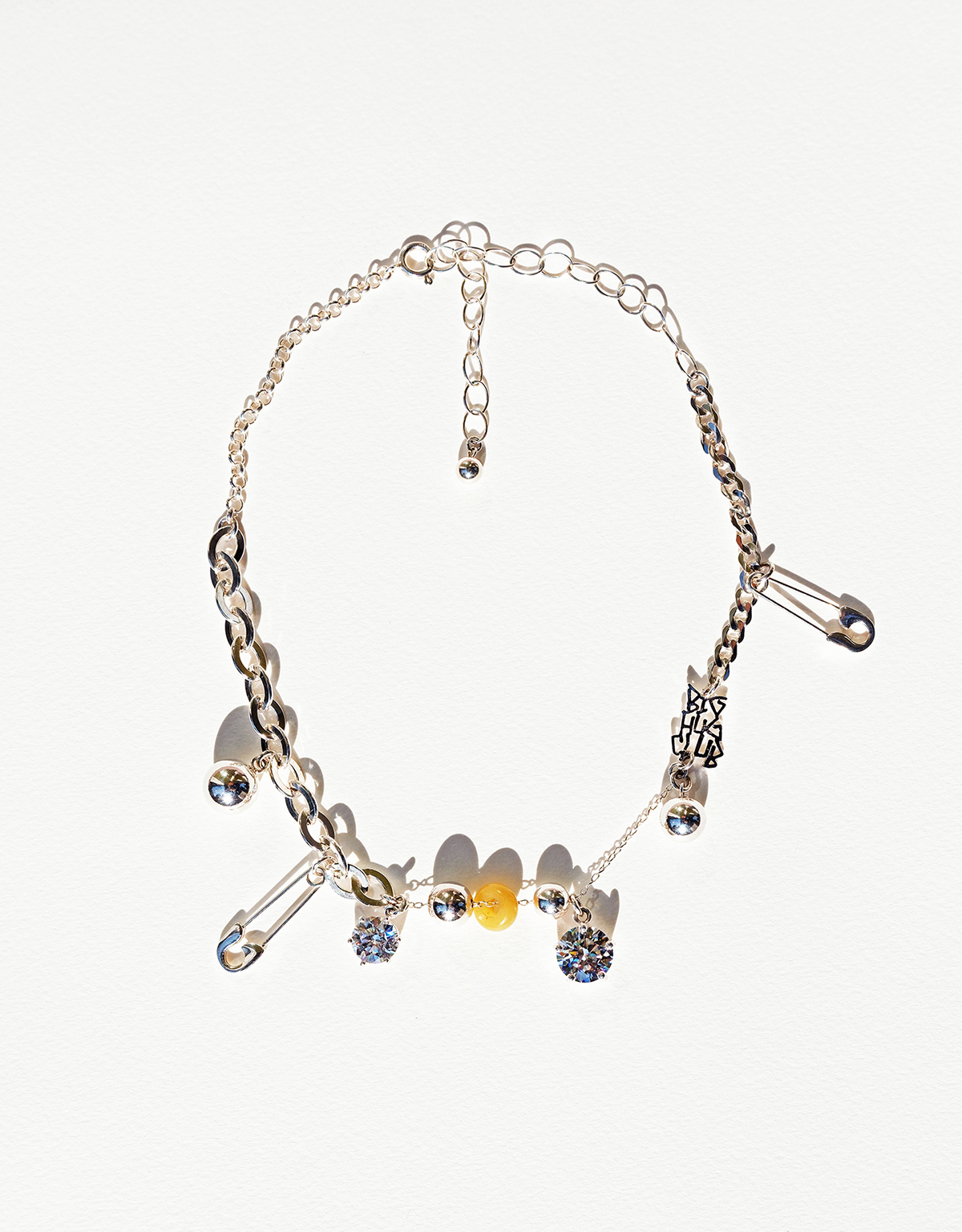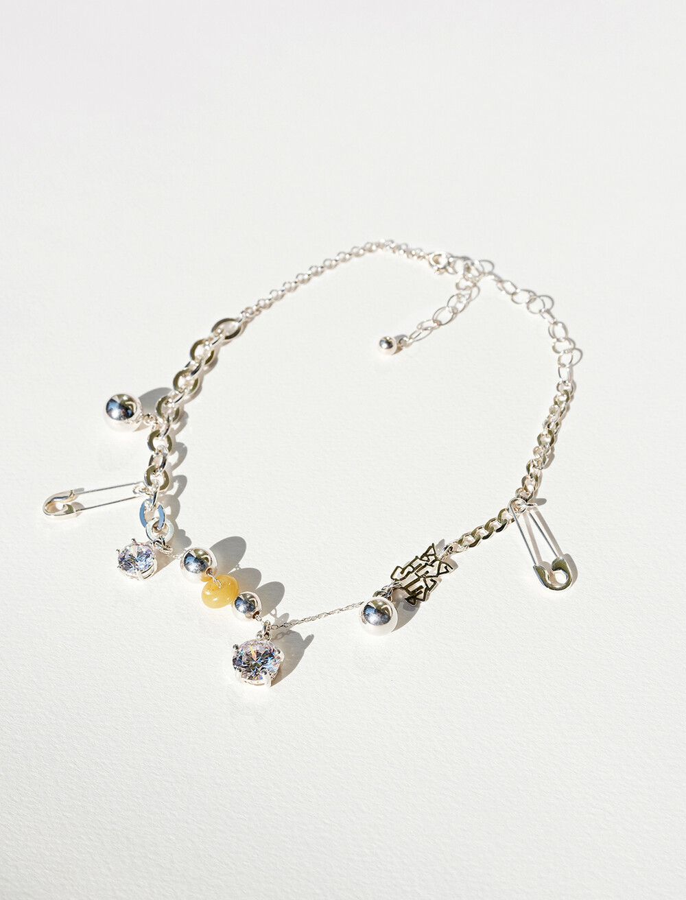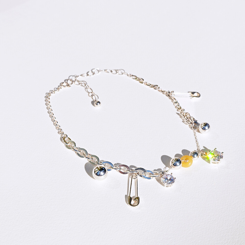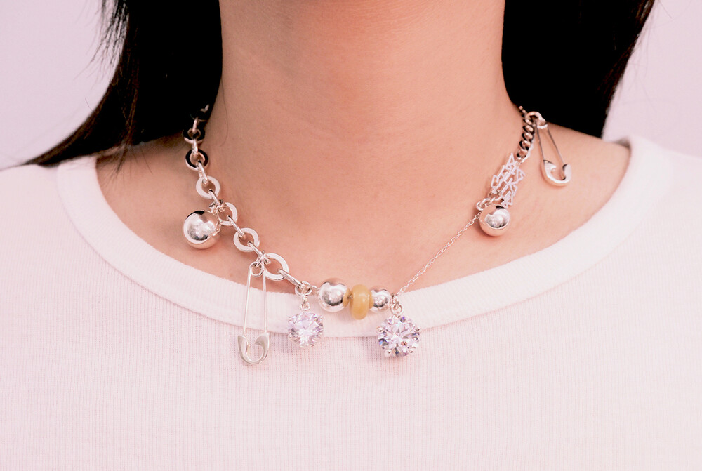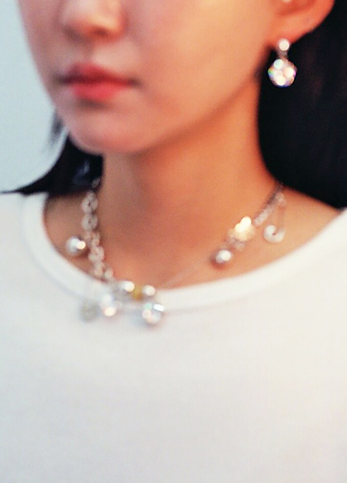 서로 다른 실버 체인과 반짝이는 큐빅, 옥 등의 소재가 조화롭게 어우러진 디자인입니다.