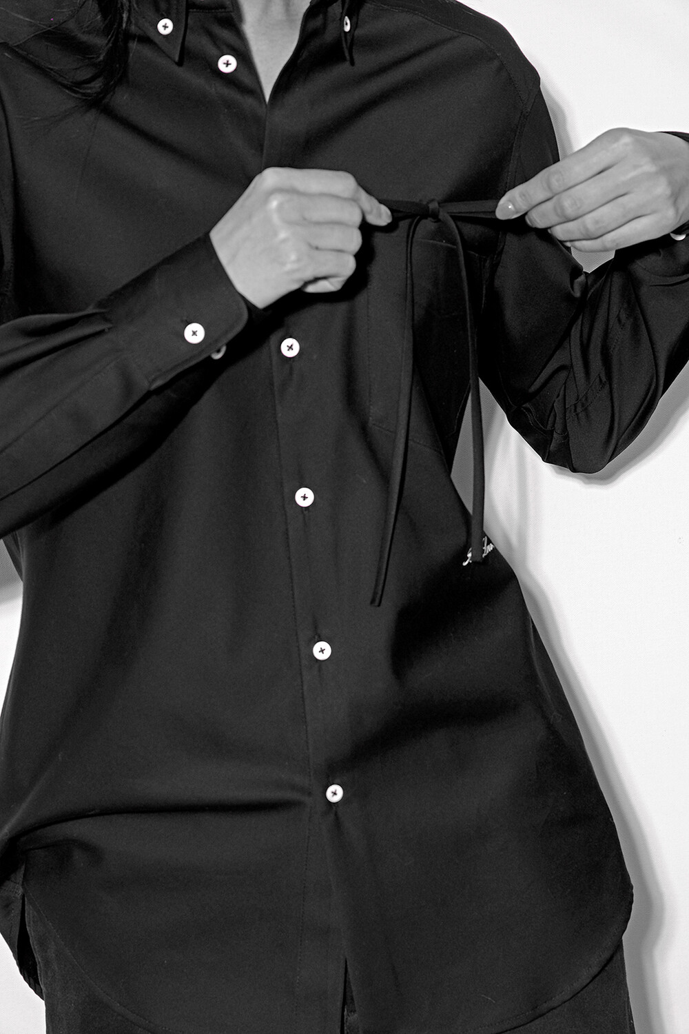 톡톡한 면 새틴 원단으로 제작되어, 실크처럼 은은한 광택과 부드러운 감촉이 돋보이는 바이어스 셔츠입니다.