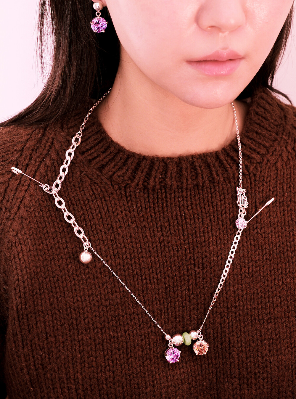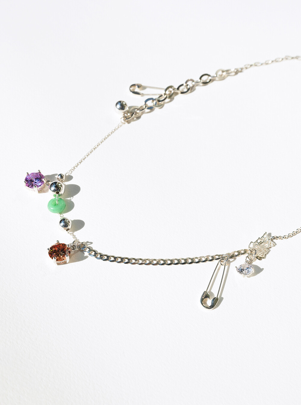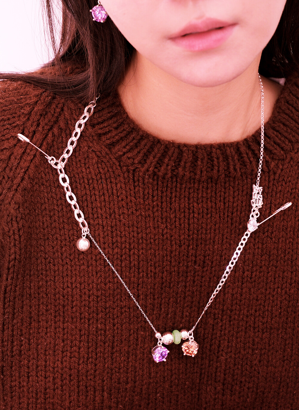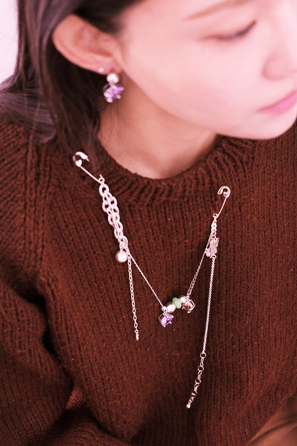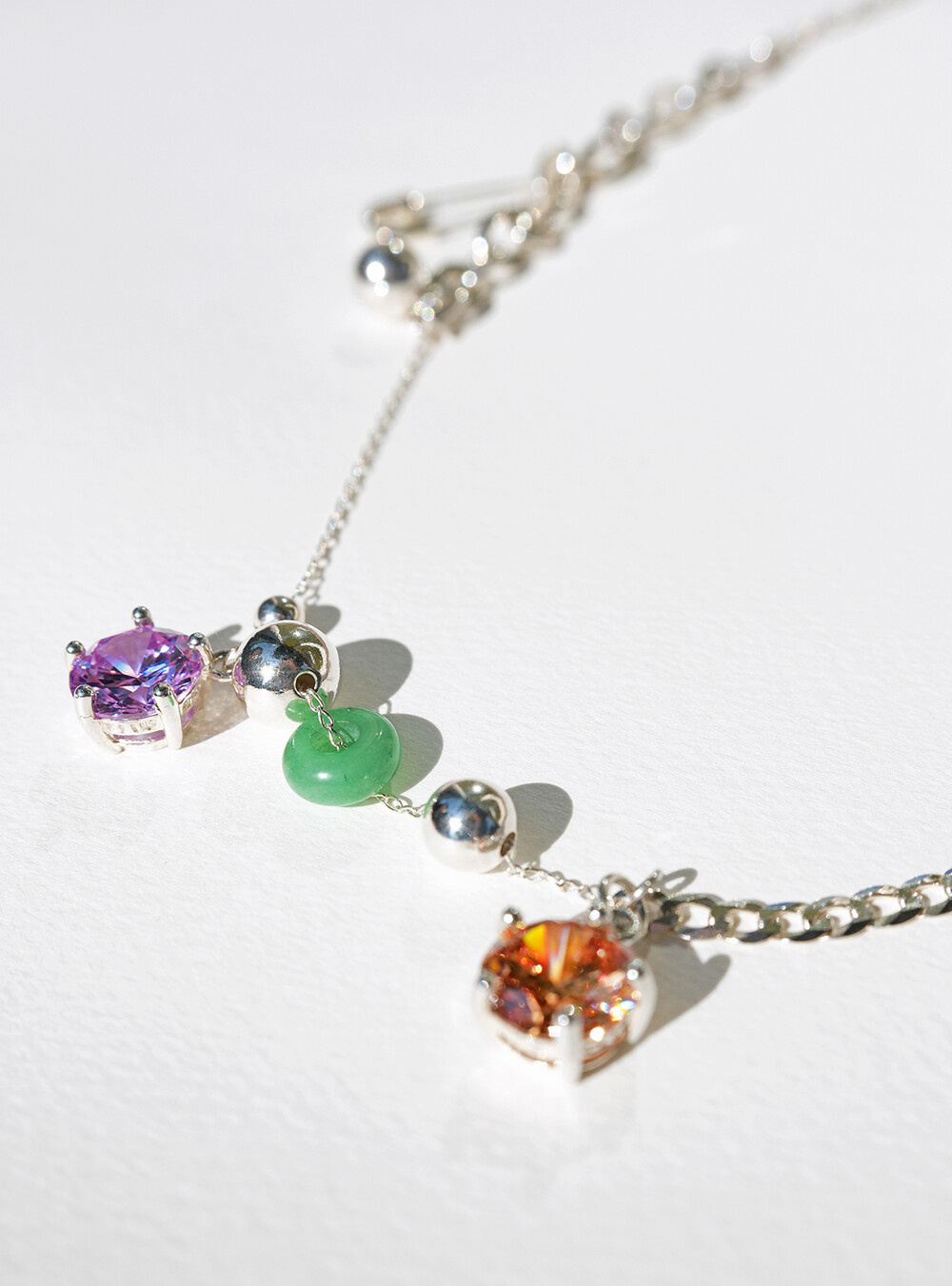 서로 다른 실버 체인과 반짝이는 큐빅, 옥 등의 소재가 조화롭게 어우러진 디자인입니다.