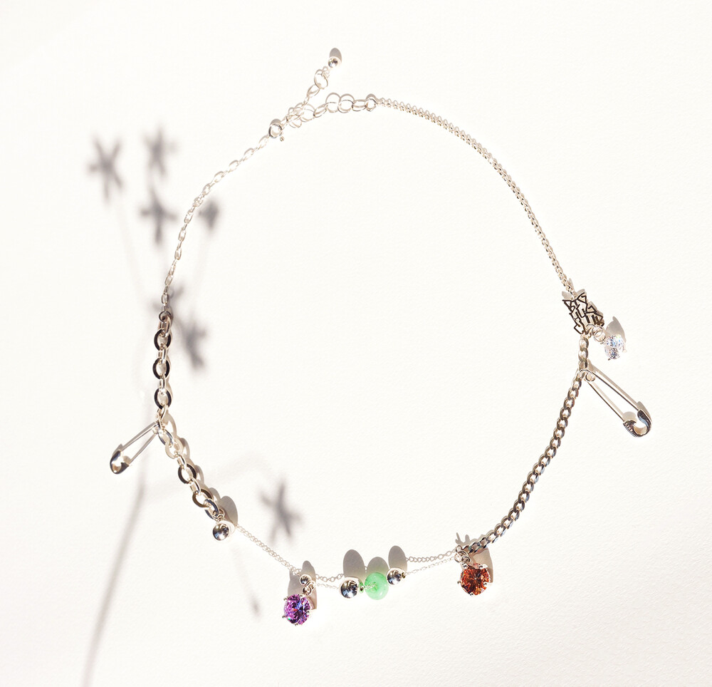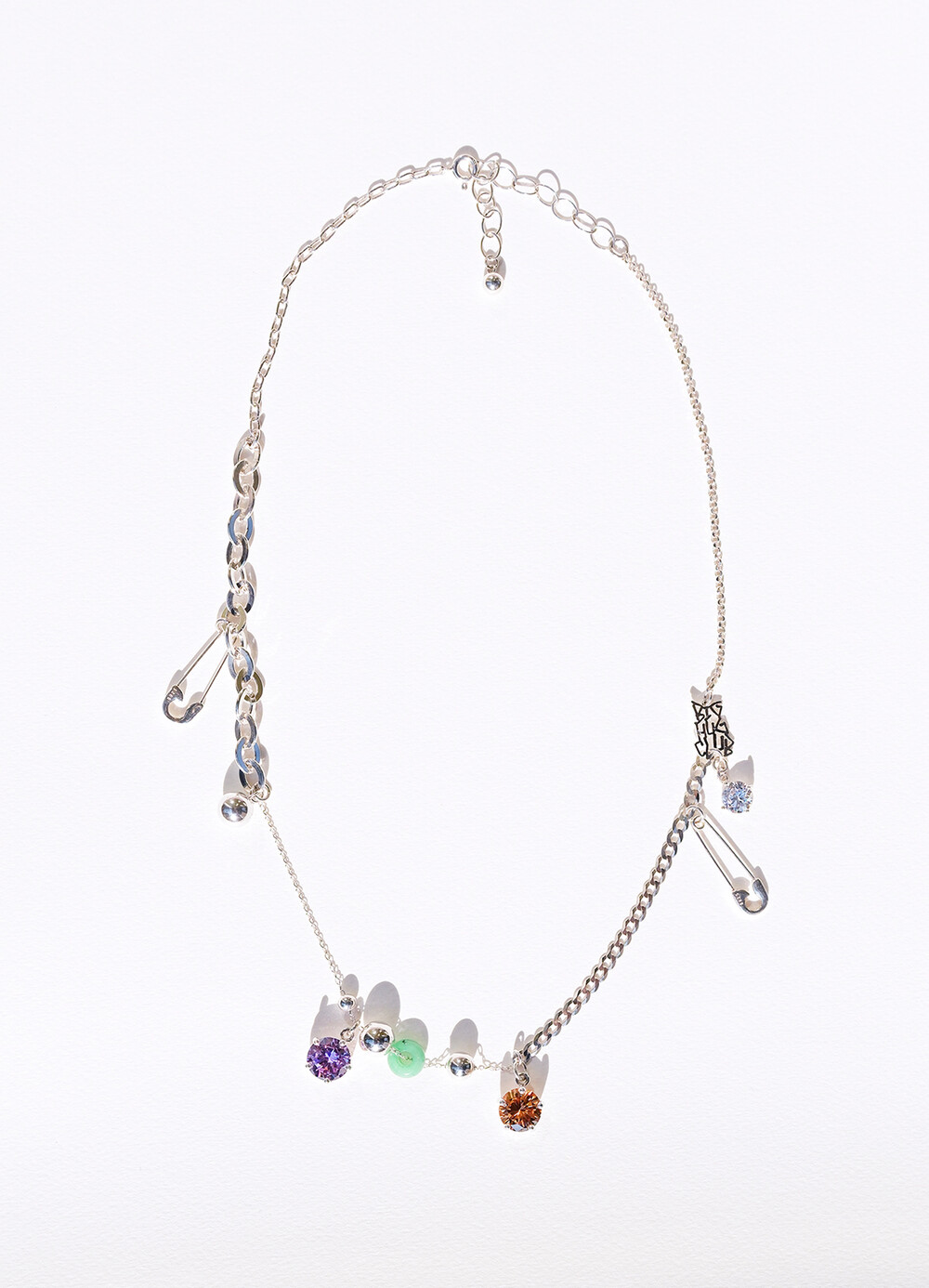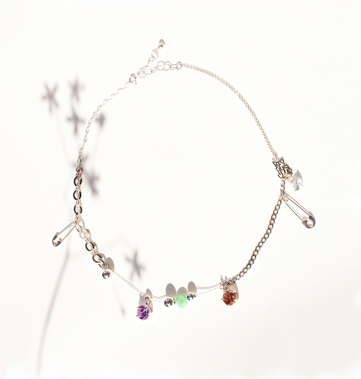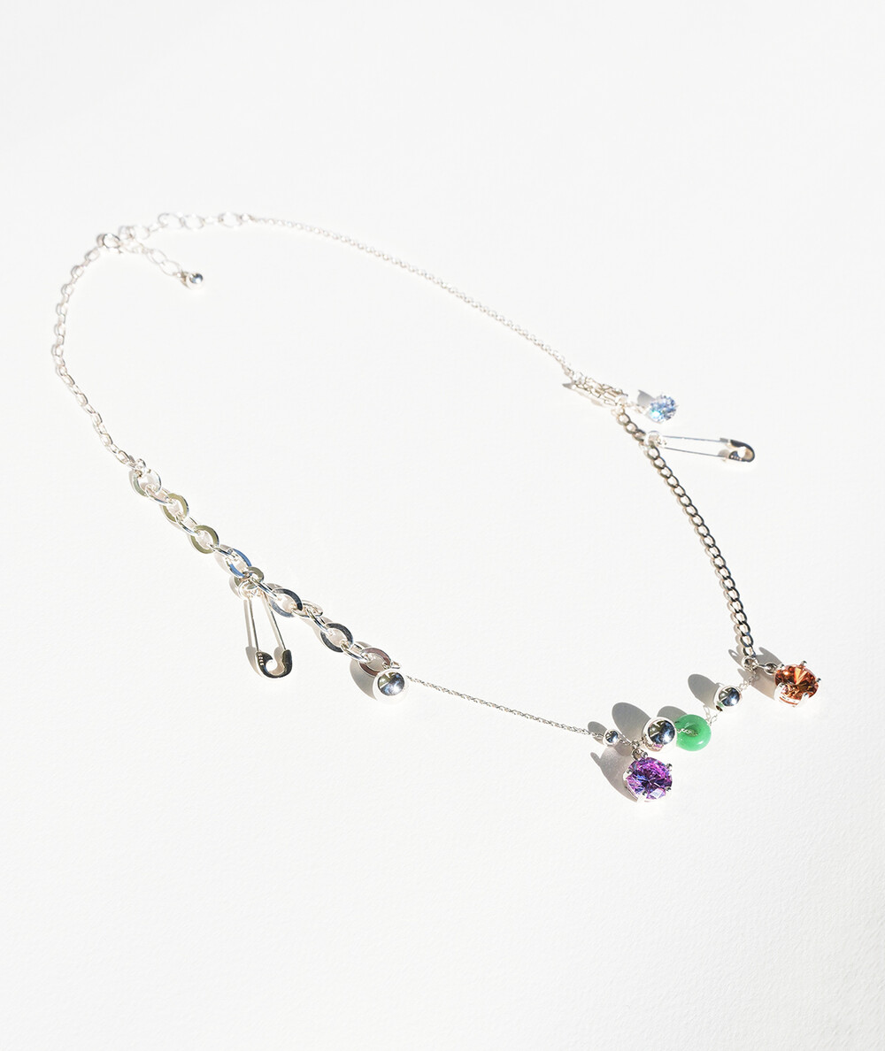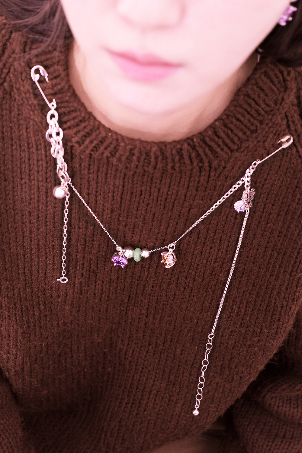 서로 다른 실버 체인과 반짝이는 큐빅, 옥 등의 소재가 조화롭게 어우러진 디자인입니다.