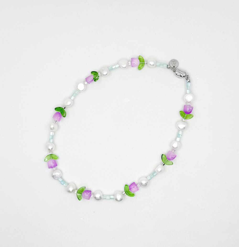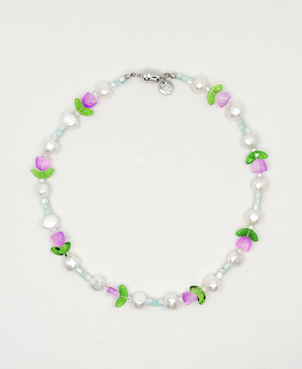 유리 튤립과 진주, 자개 비즈 소재가 믹스된 플라워 목걸이 입니다.