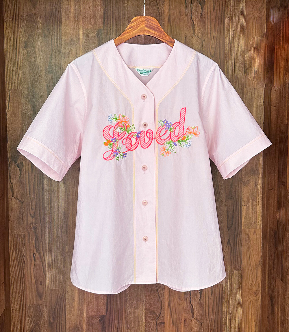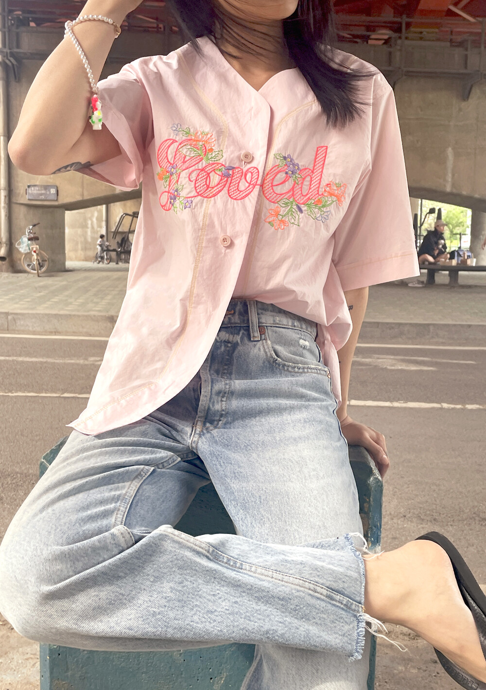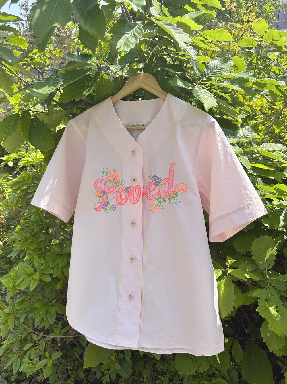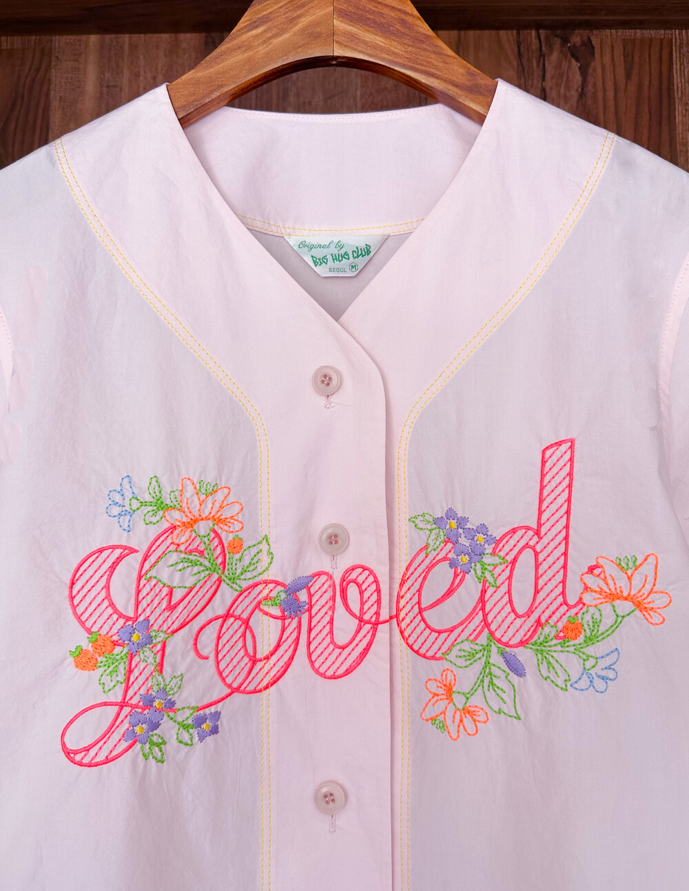 ' Loved' 문구와 꽃이 앞판에 자수 놓아진 베이스볼 셔츠 형태의 아름다운 여름 셔츠입니다.