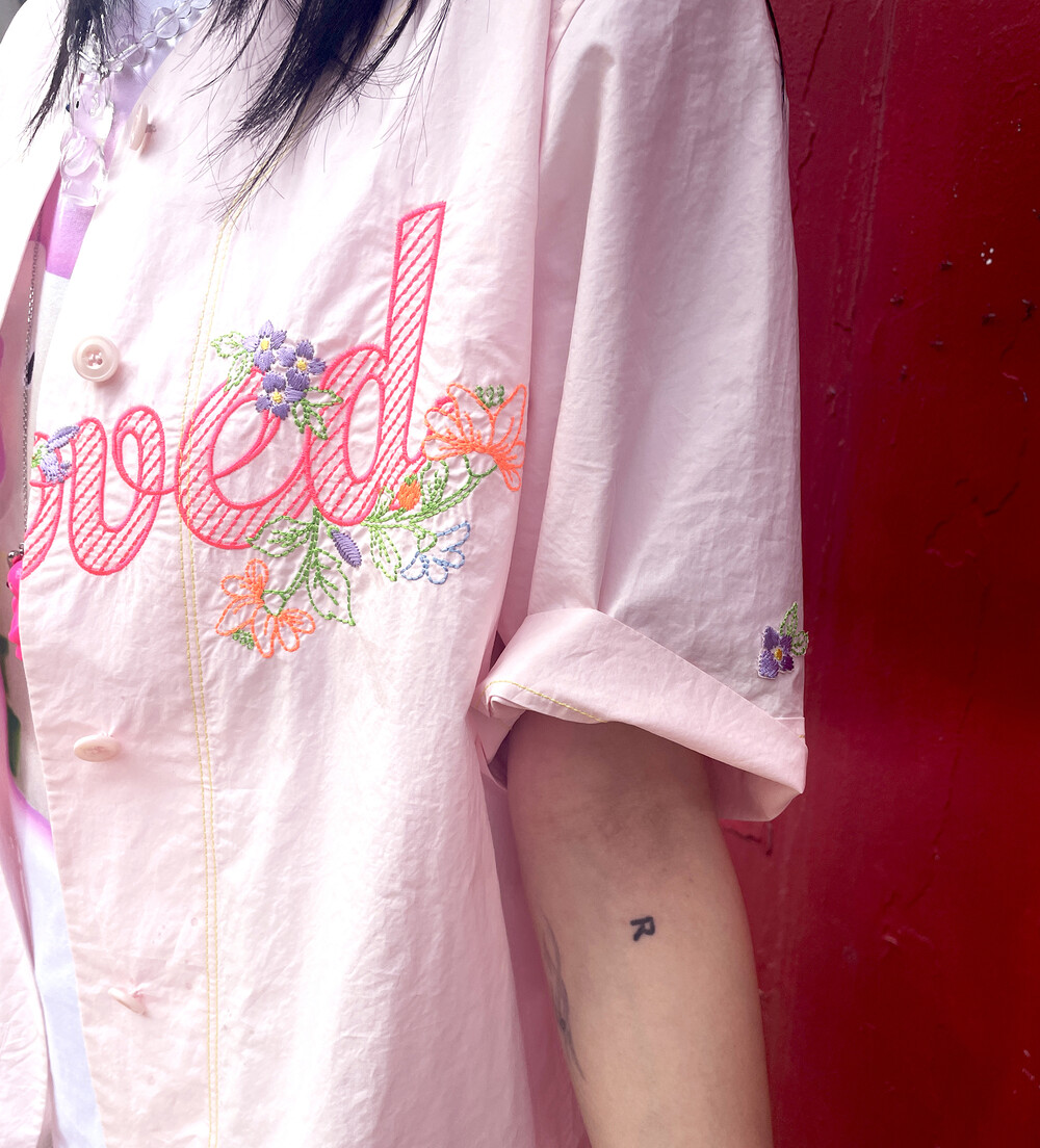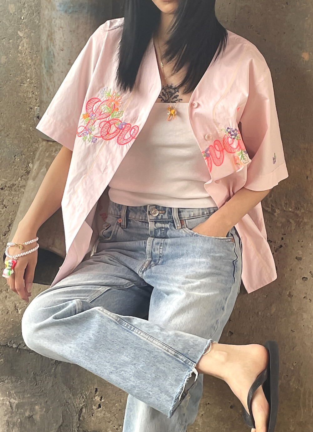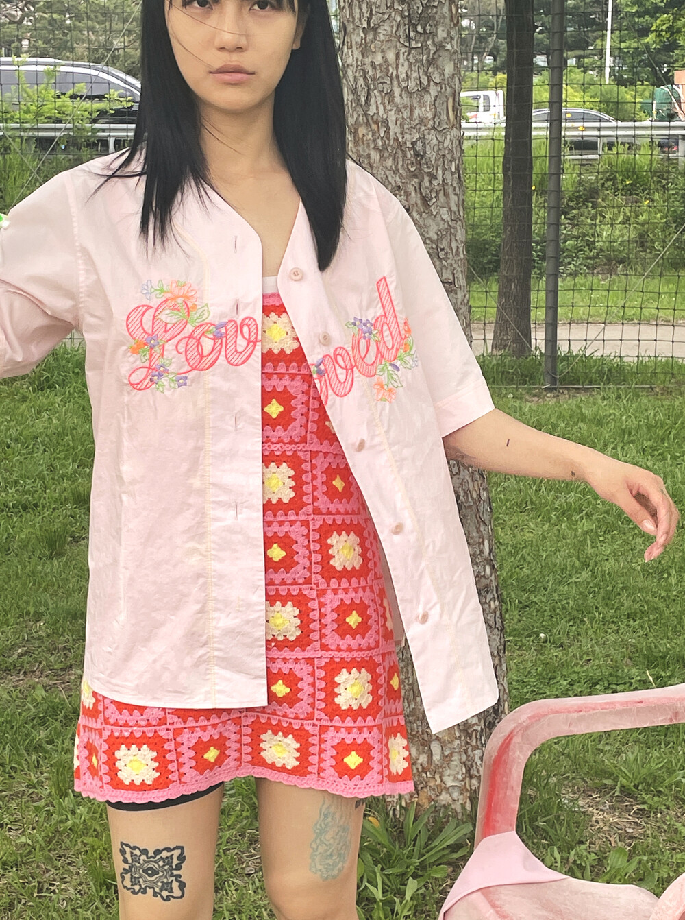 ' Loved' 문구와 꽃이 앞판에 자수 놓아진 베이스볼 셔츠 형태의 아름다운 여름 셔츠입니다.