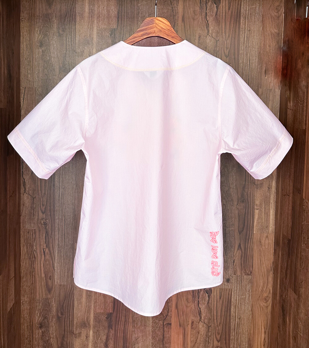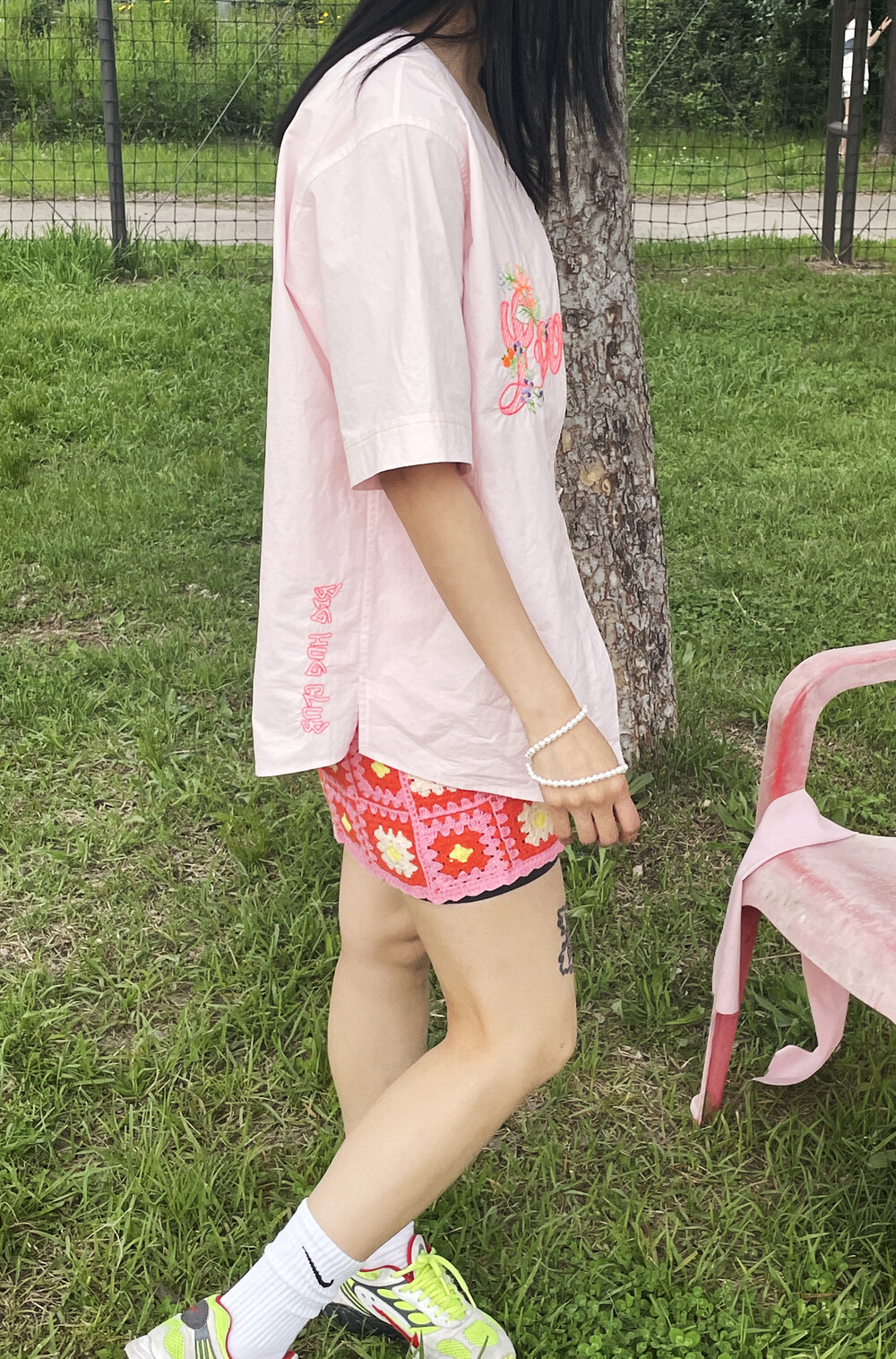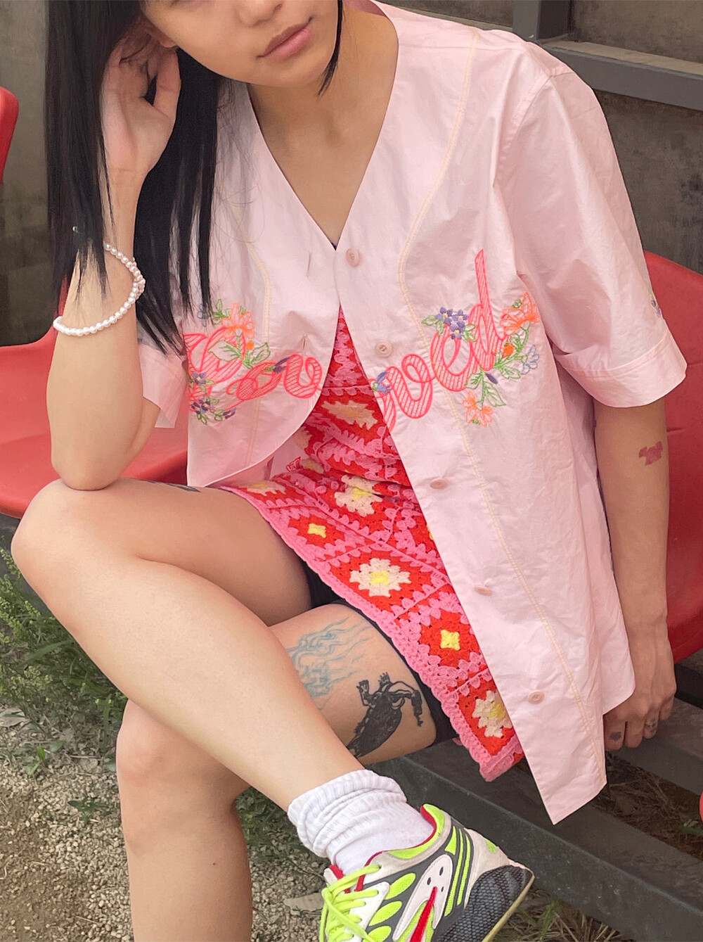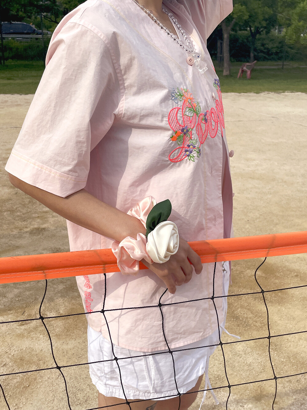 ' Loved' 문구와 꽃이 앞판에 자수 놓아진 베이스볼 셔츠 형태의 아름다운 여름 셔츠입니다.