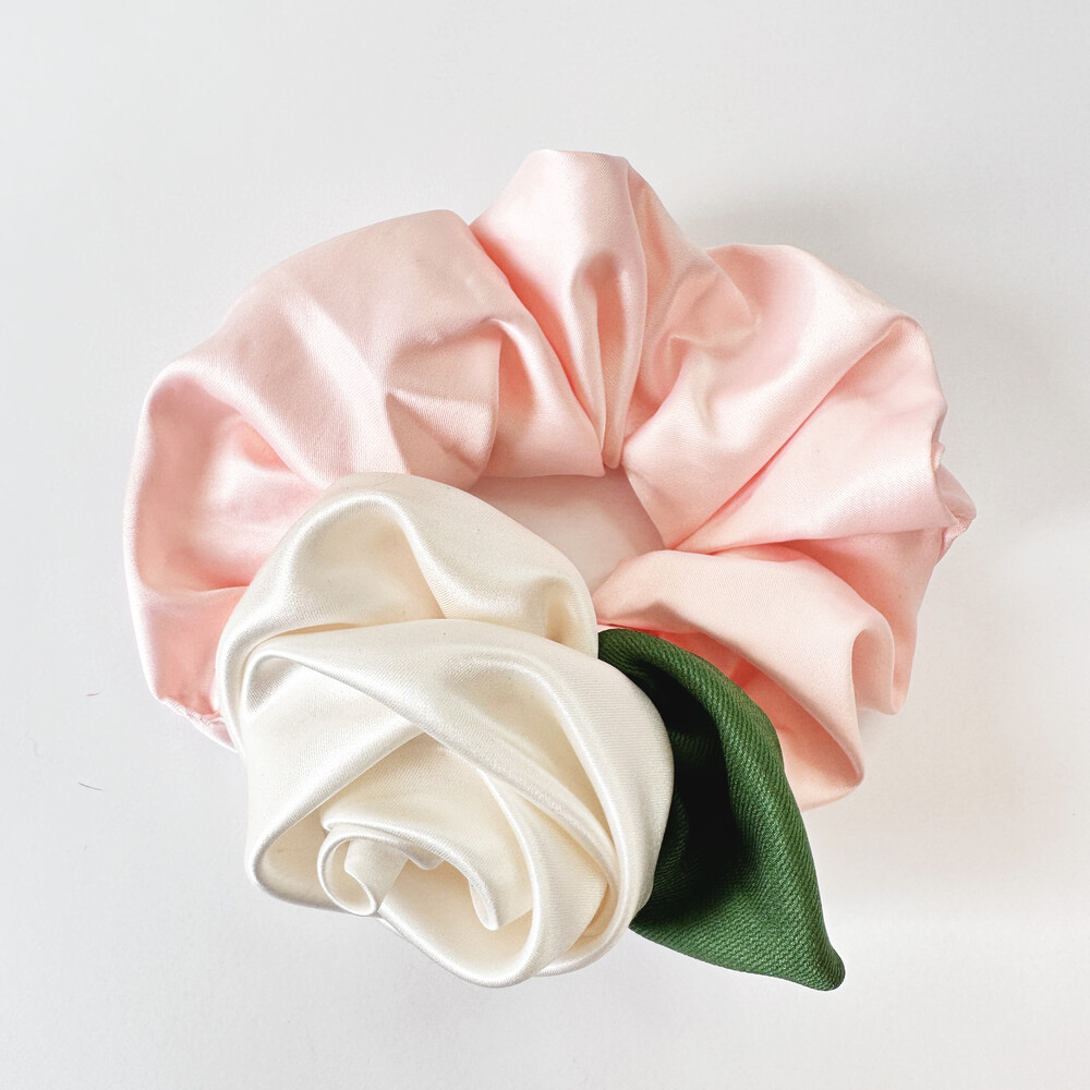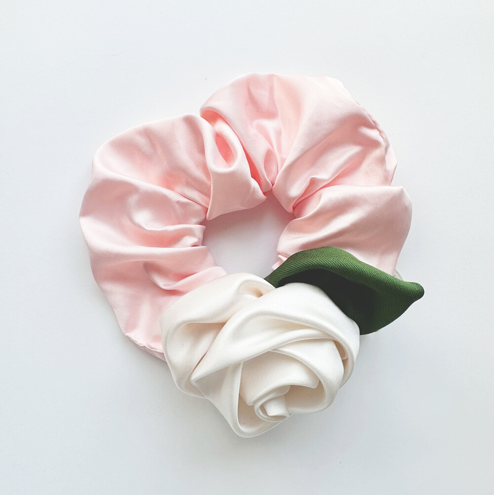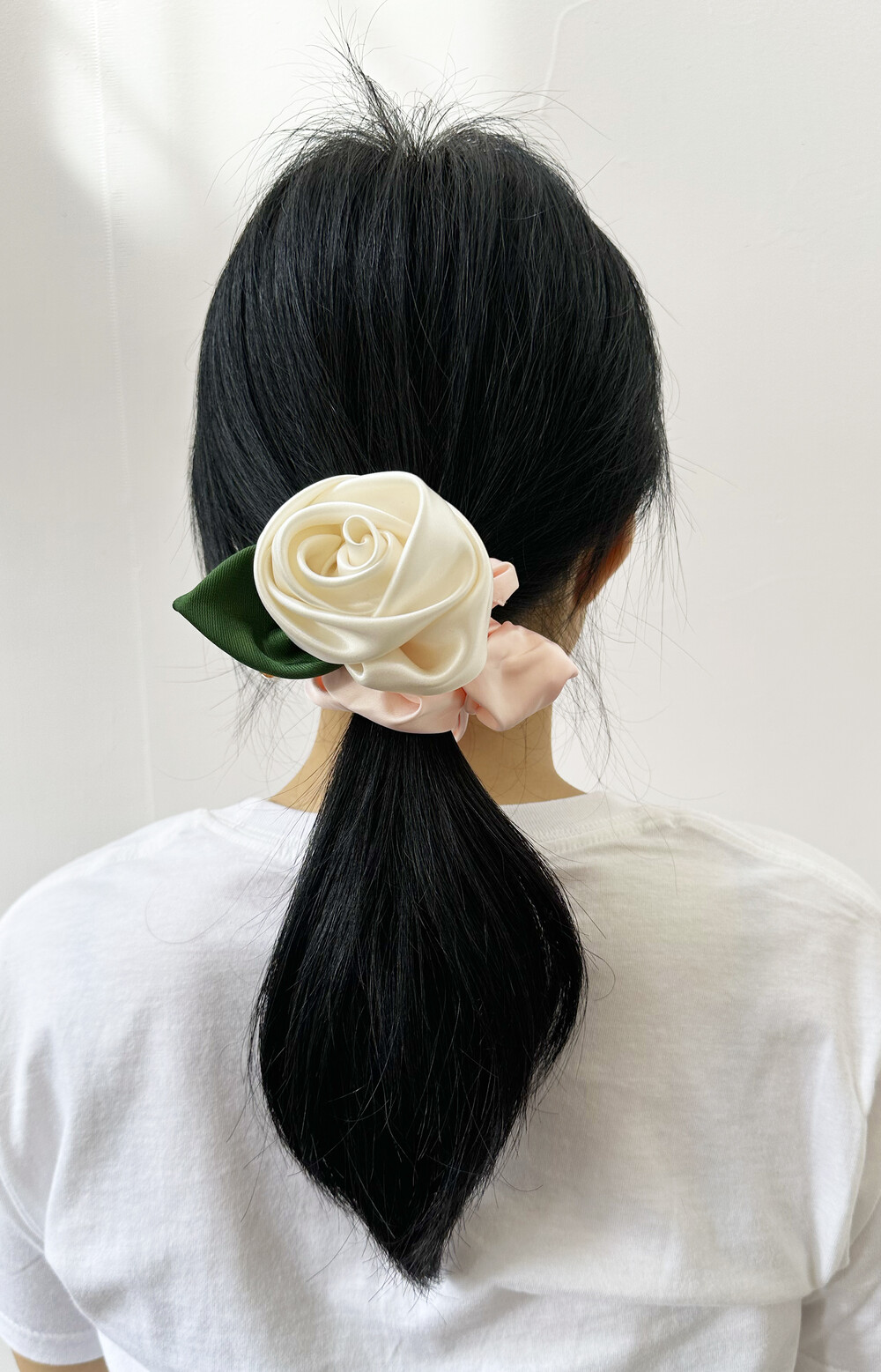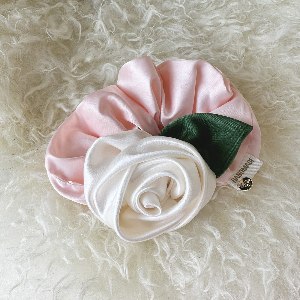 하나하나 손으로 만든 장미로 장식된 핸드메이드 실크 헤어 스크런치 밴드입니다.