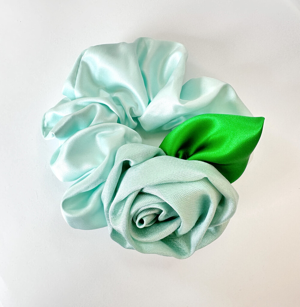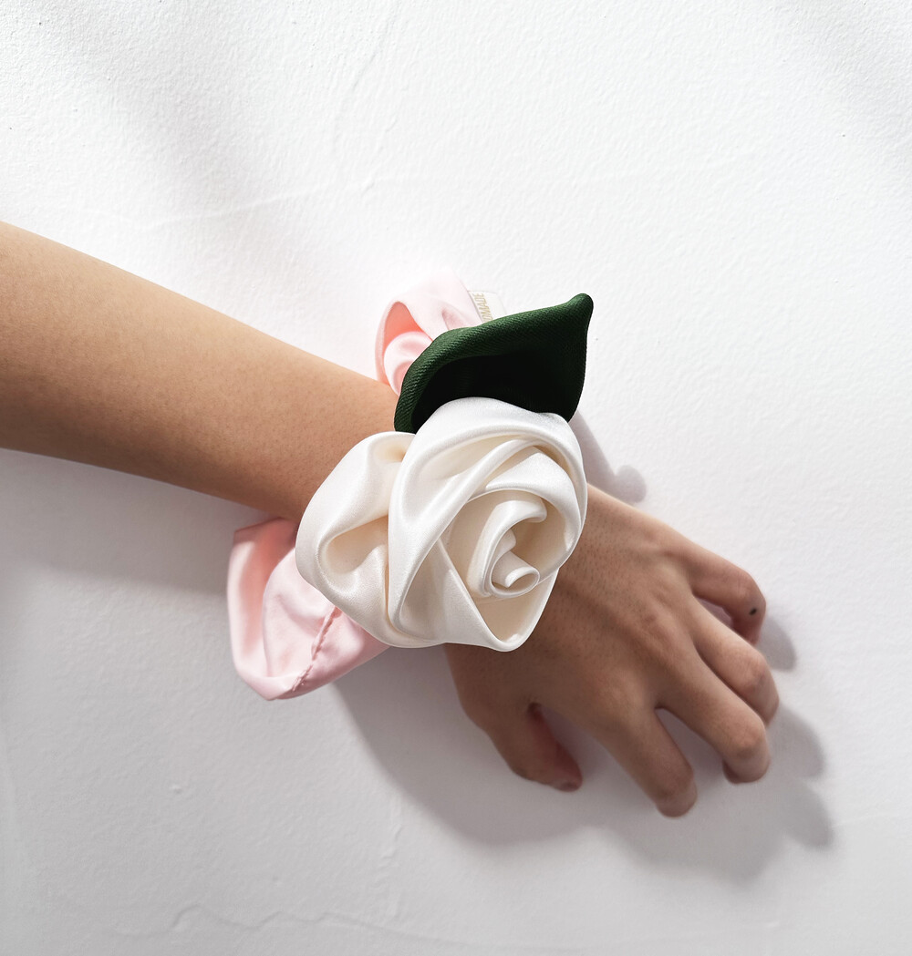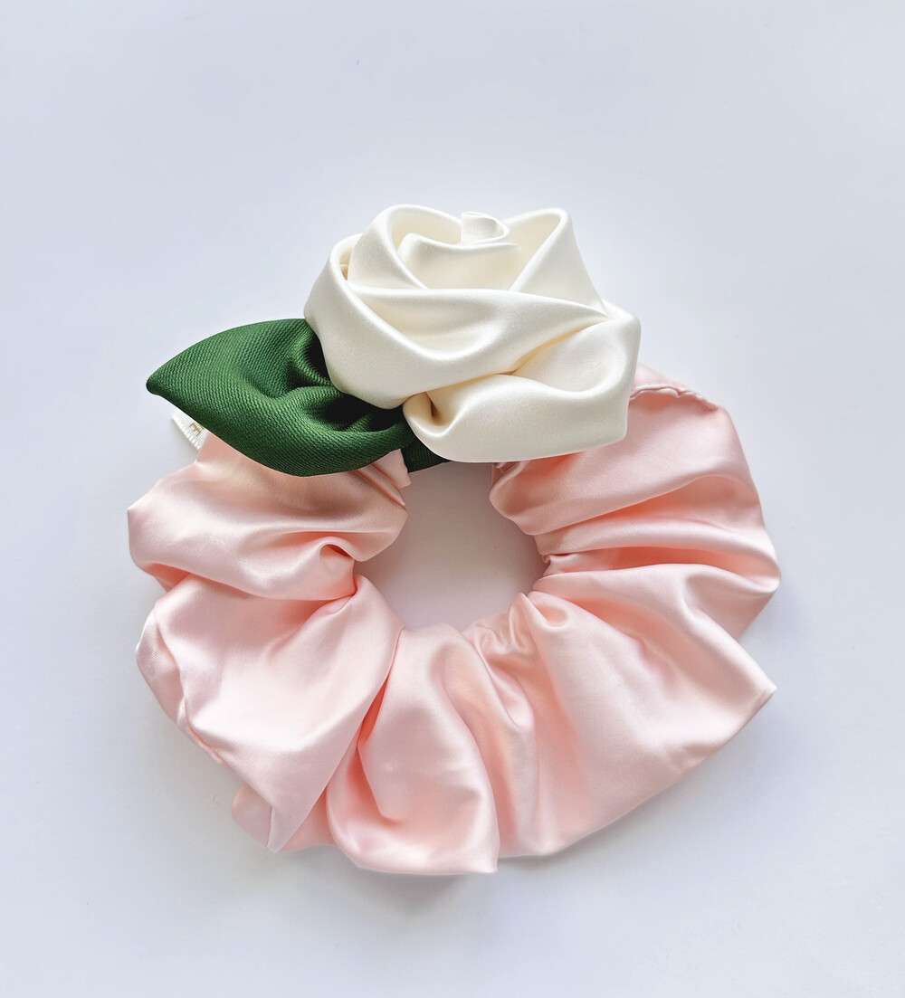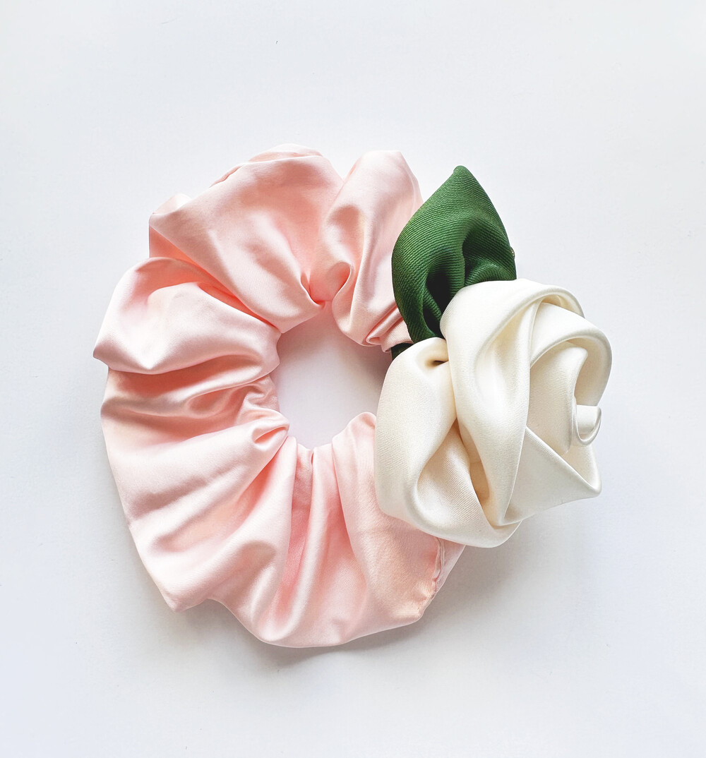 하나하나 손으로 만든 장미로 장식된 핸드메이드 실크 헤어 스크런치 밴드입니다.