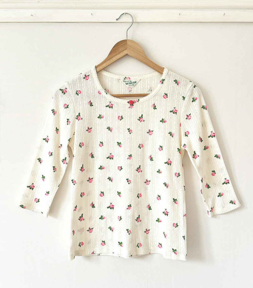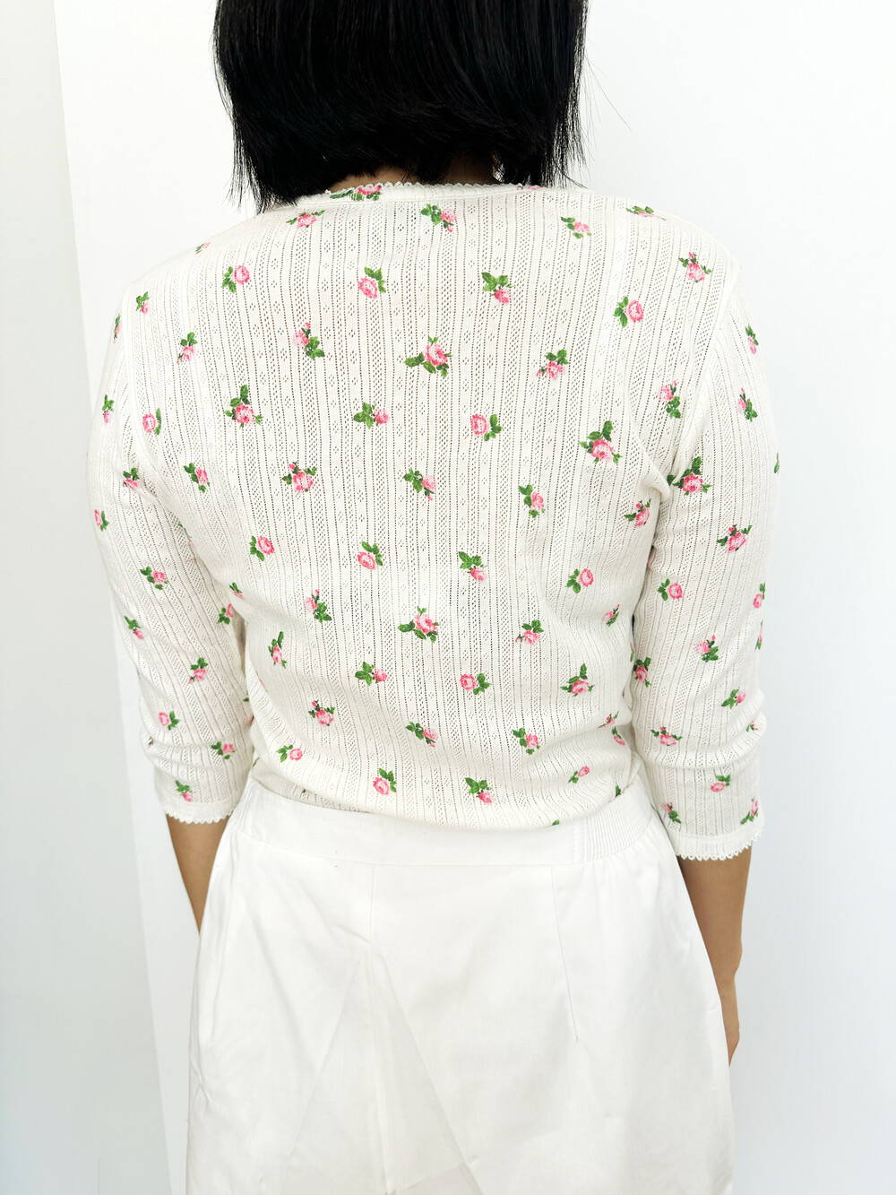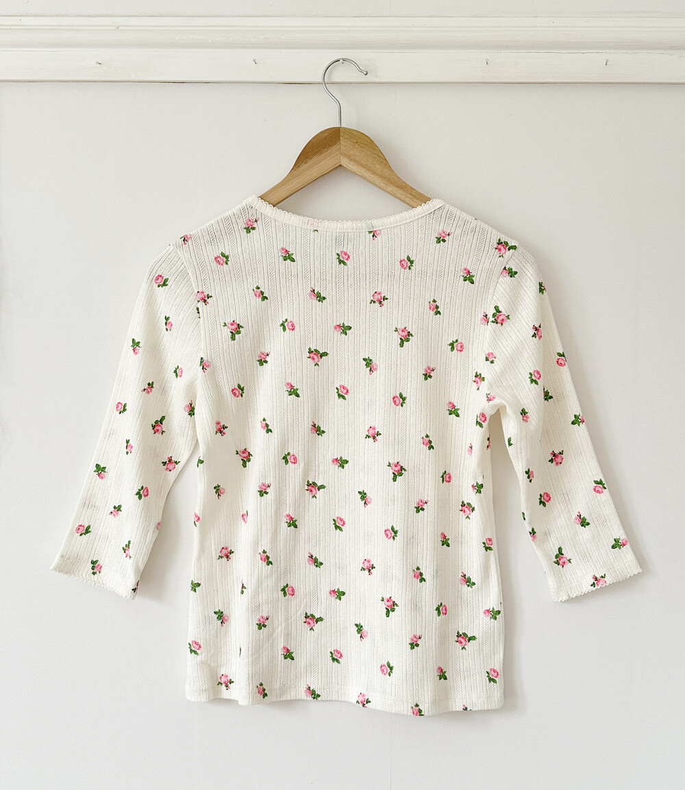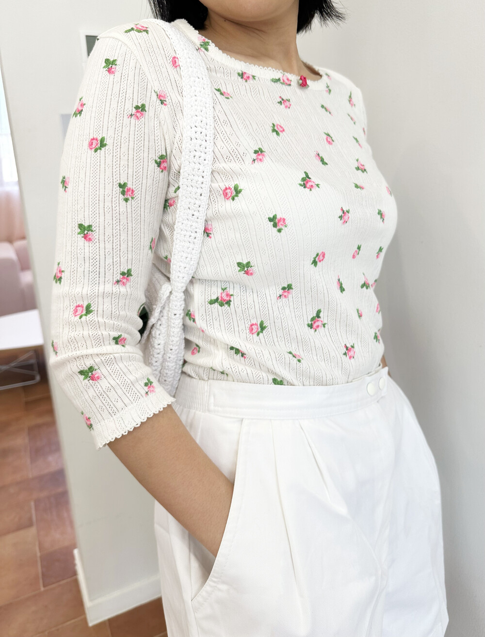 잔잔한 장미가 프린트된 아일렛 쟈가드 면 소재의 7부 소매 티셔츠 입니다.