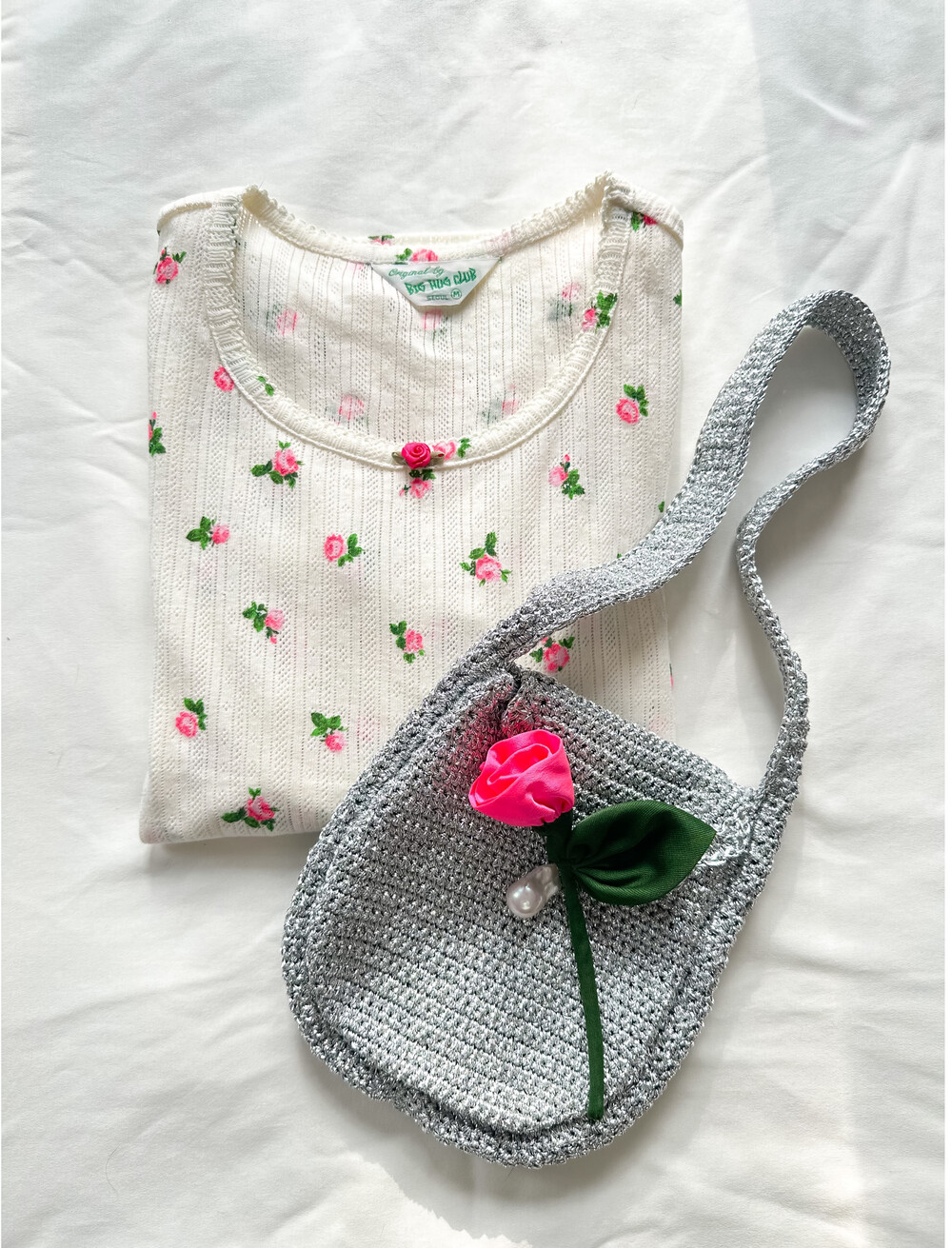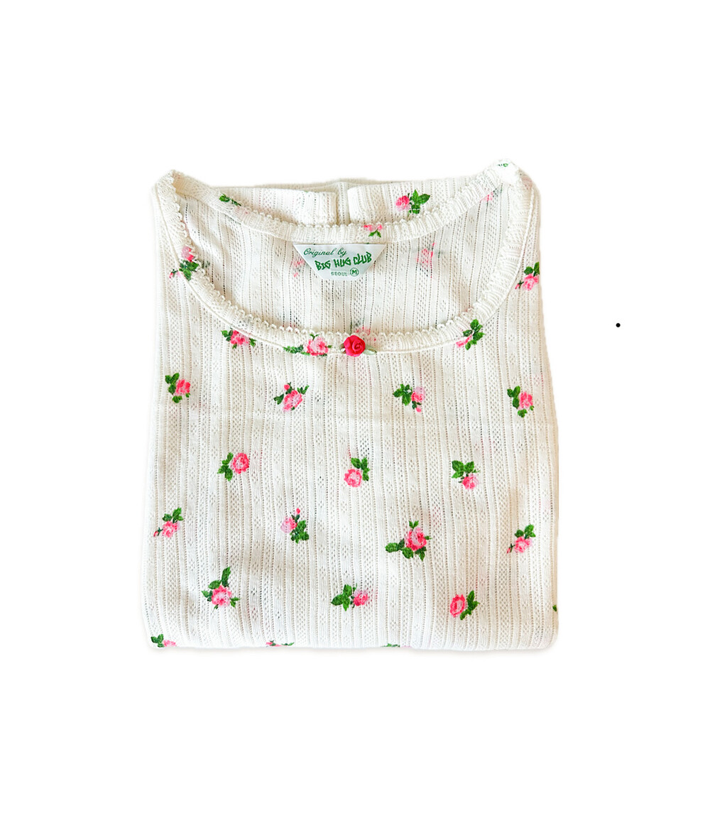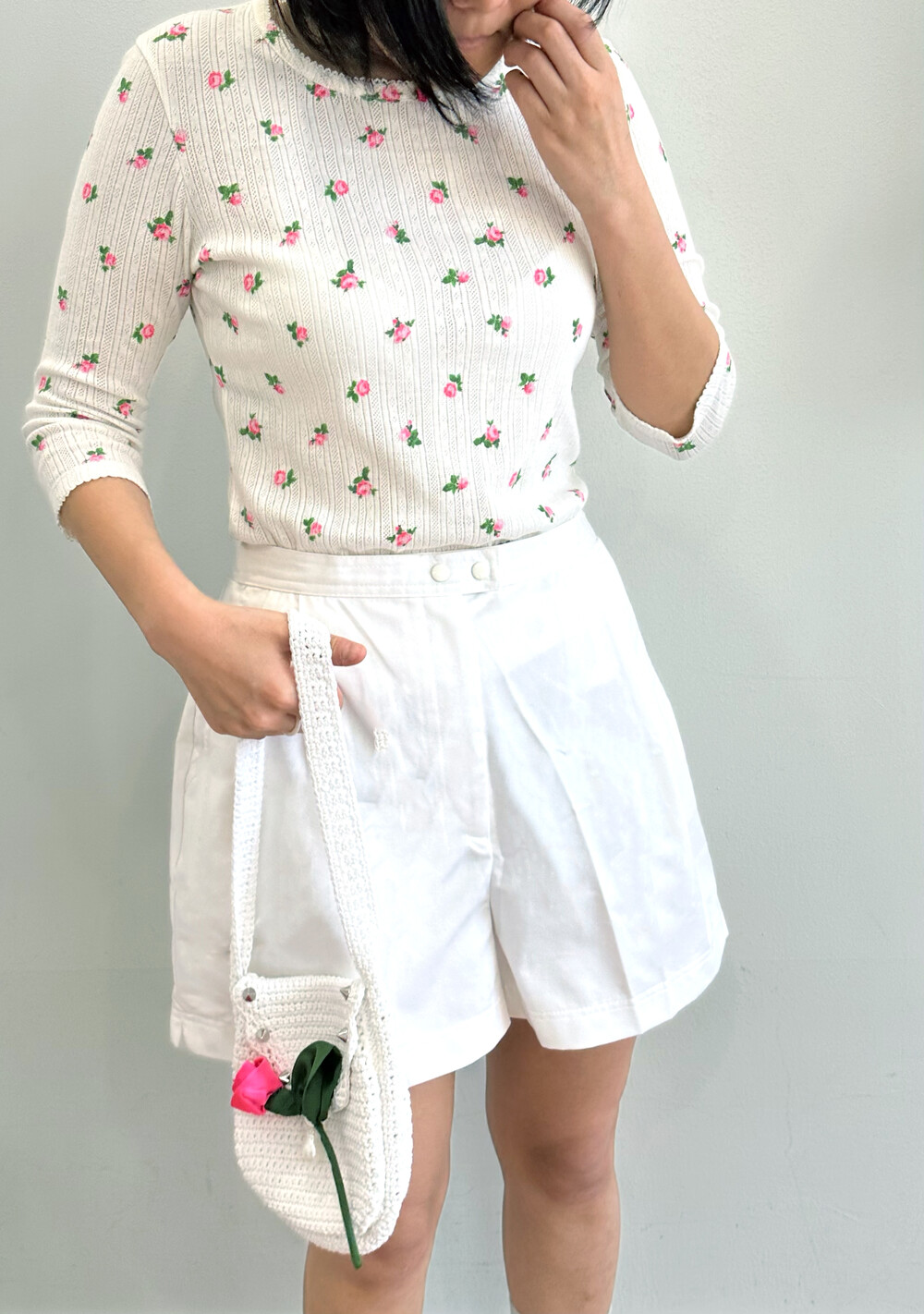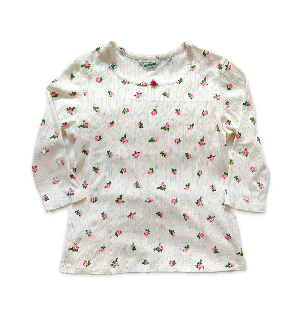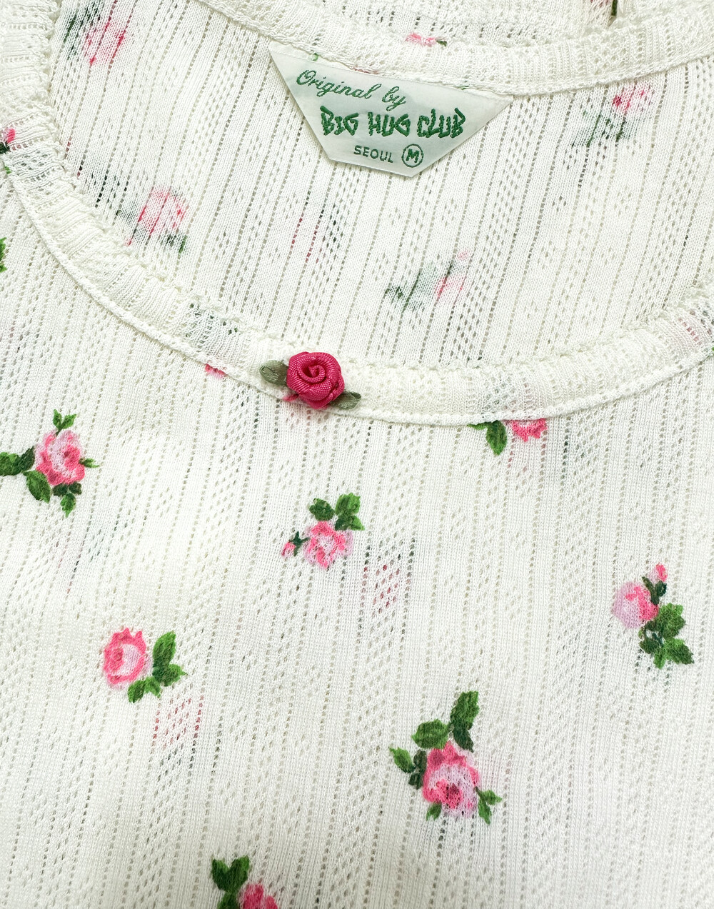 잔잔한 장미가 프린트된 아일렛 쟈가드 면 소재의 7부 소매 티셔츠 입니다.