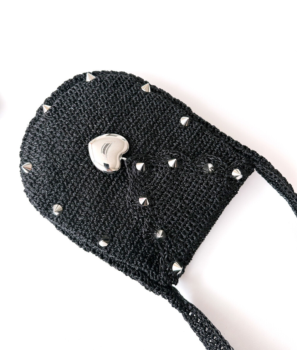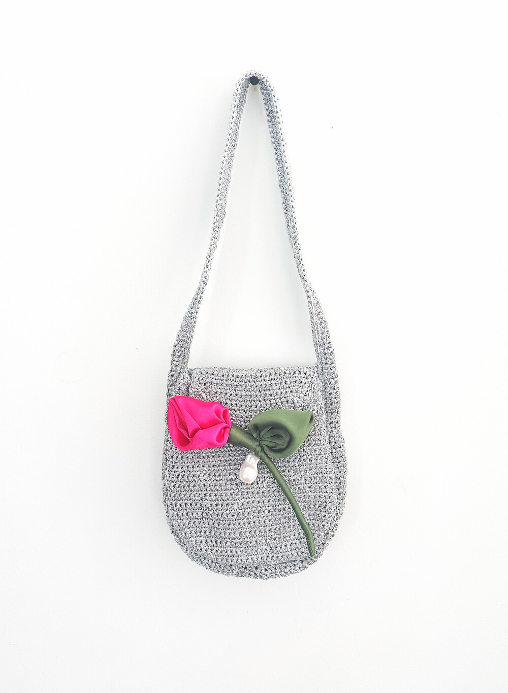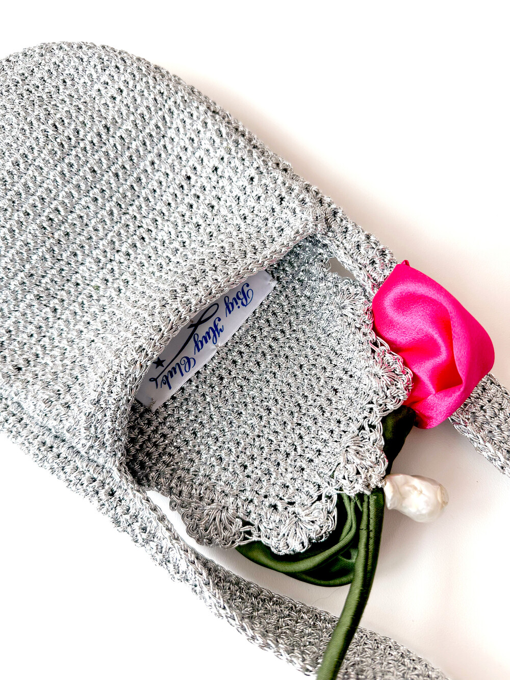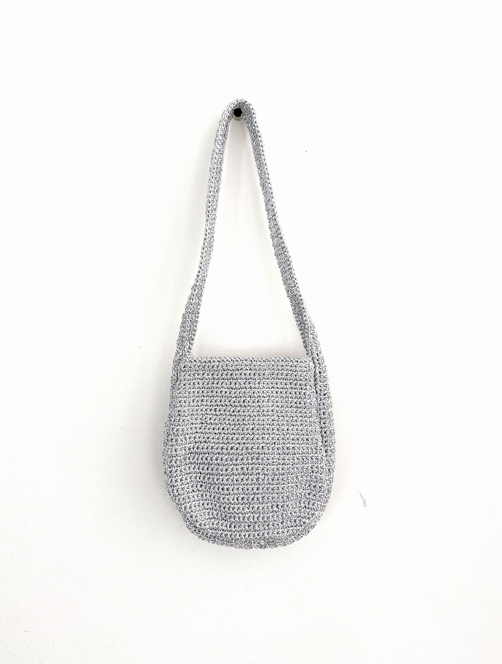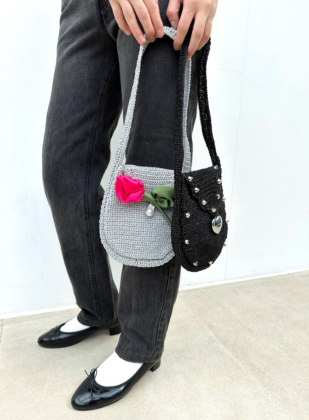 실버와 블랙의 메탈릭 사를 사용한 핸드메이드 크로쉐 니팅 가방입니다.
