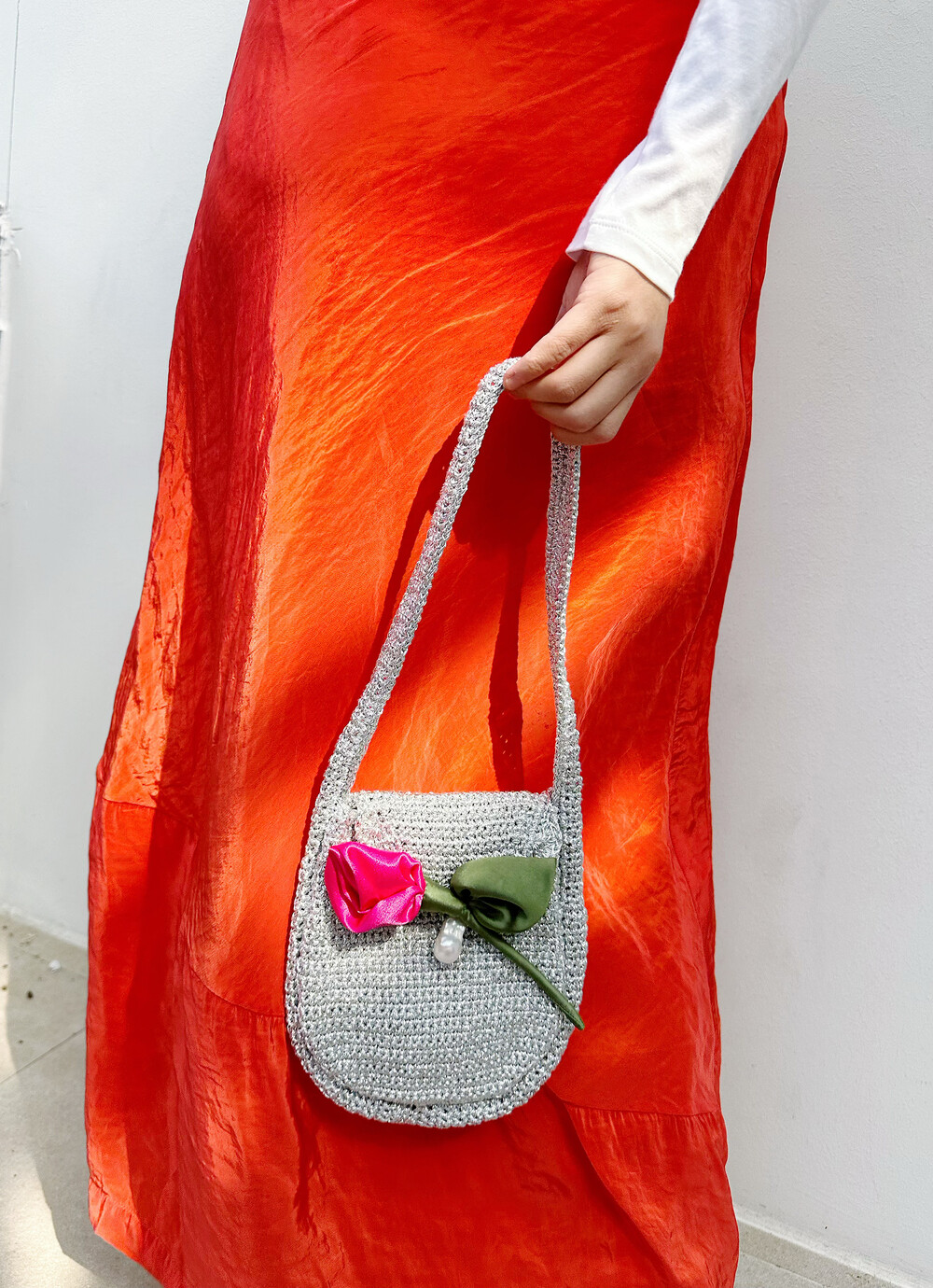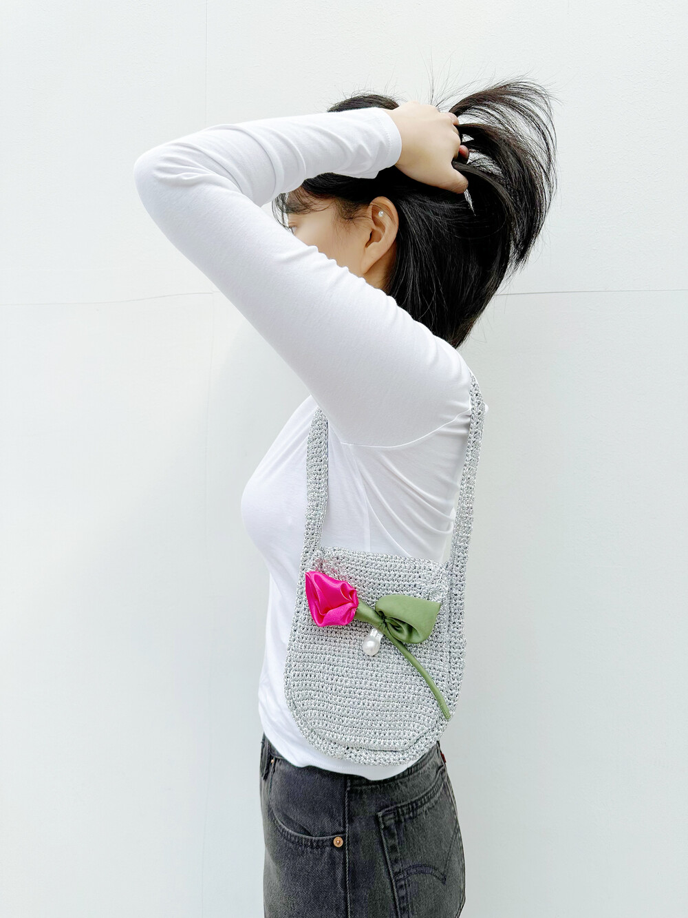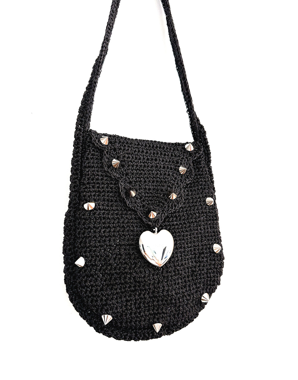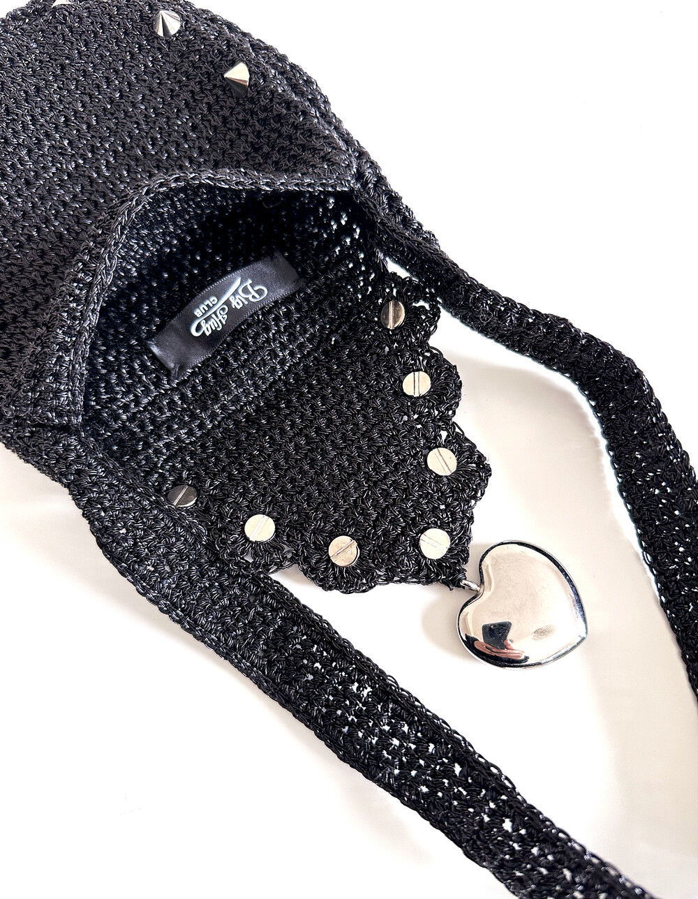 실버와 블랙의 메탈릭 사를 사용한 핸드메이드 크로쉐 니팅 가방입니다.