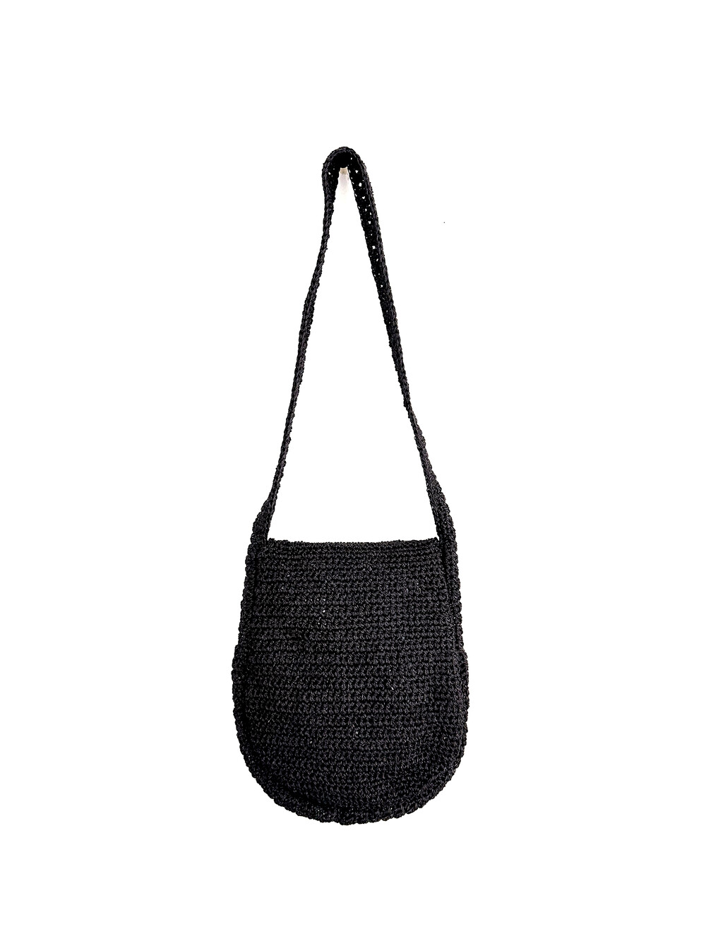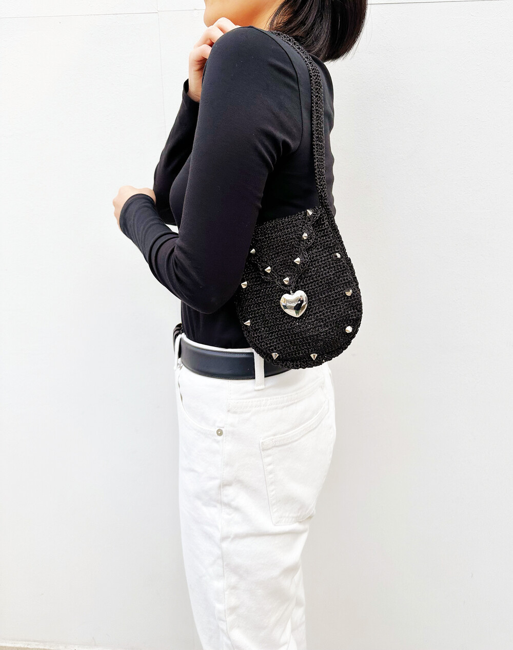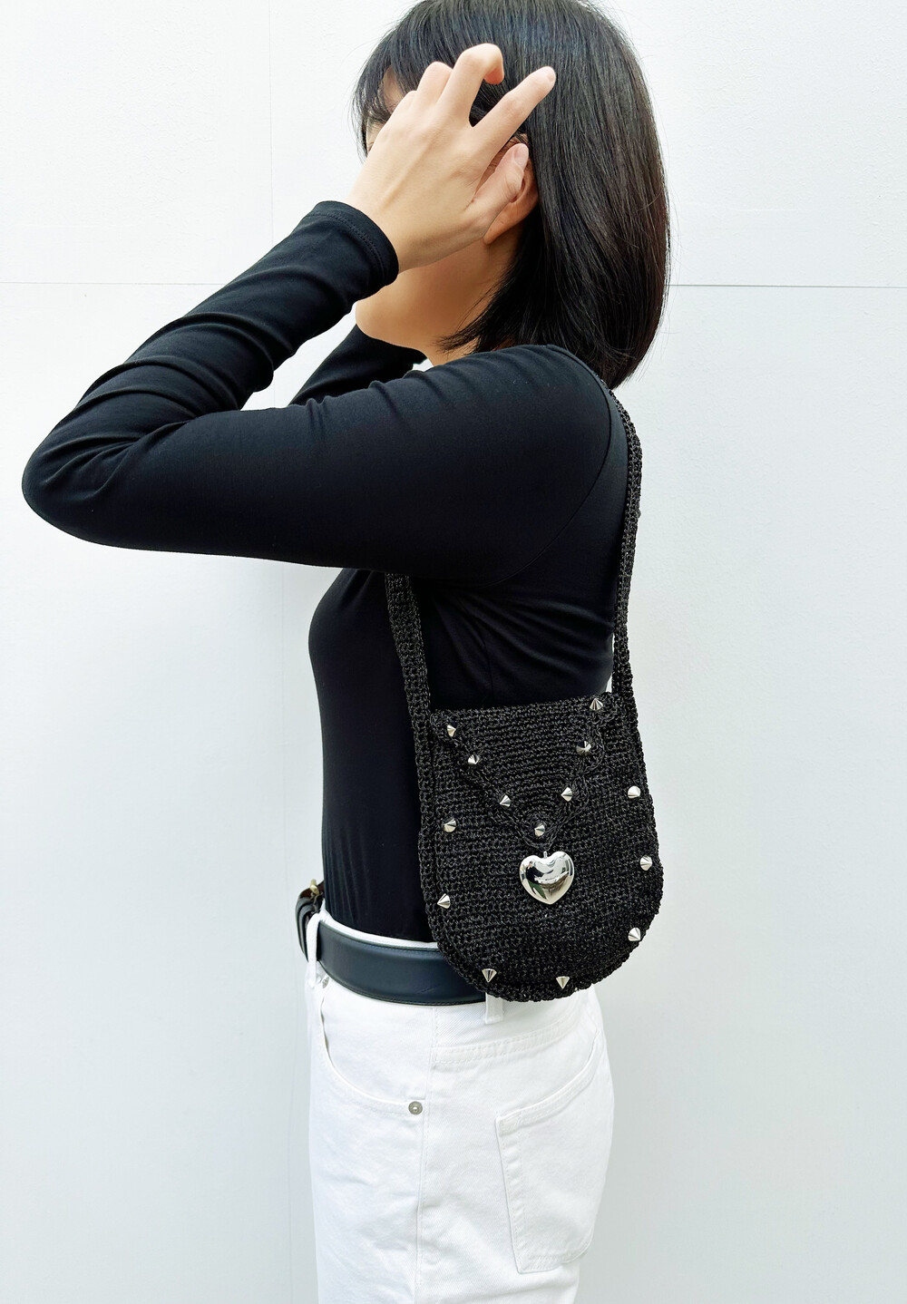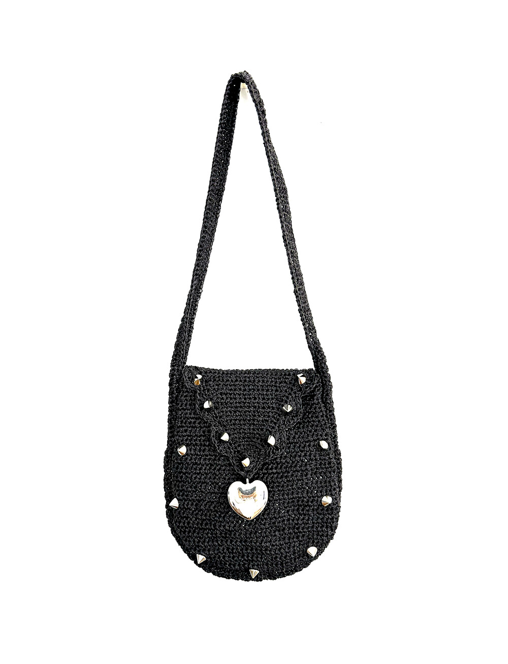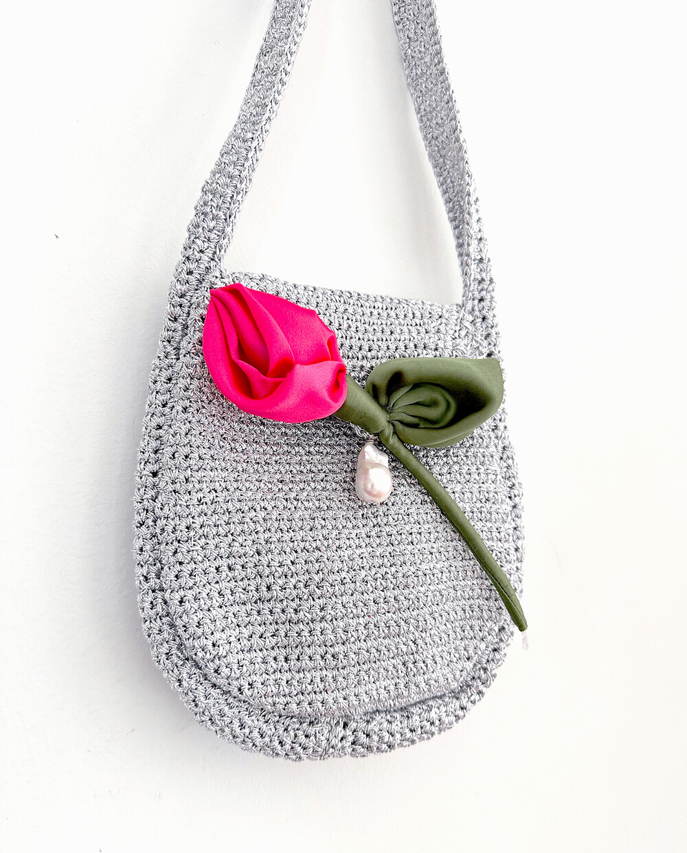 실버와 블랙의 메탈릭 사를 사용한 핸드메이드 크로쉐 니팅 가방입니다.