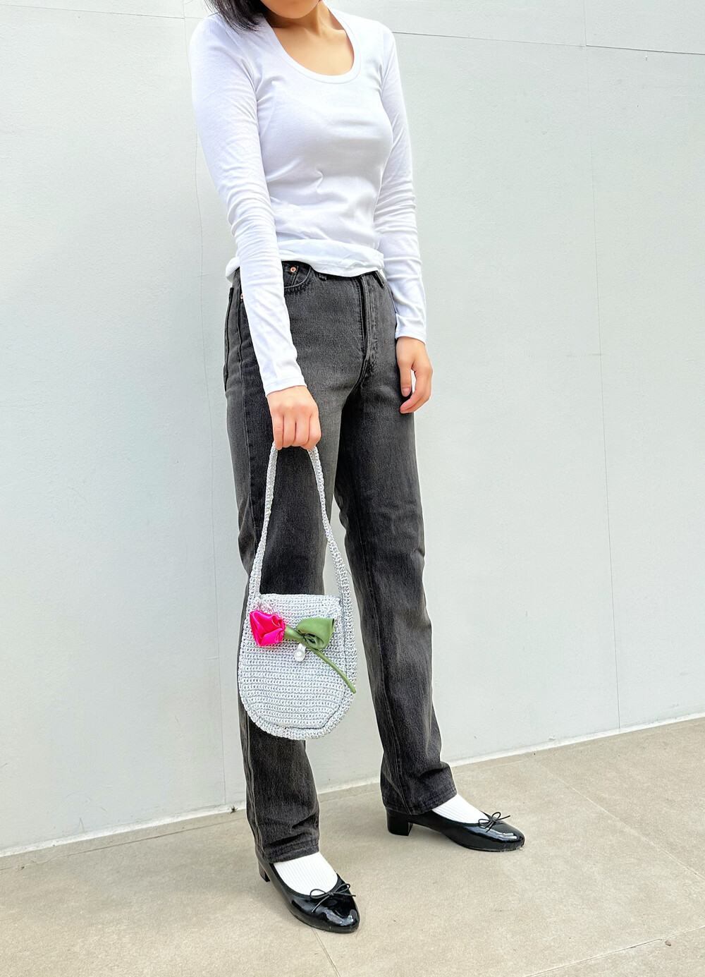 실버 백에는 핸드 메이드로 제작한 공단 장미를 블랙 백에는 가시 모양의 스터드로 장식하였습니다.