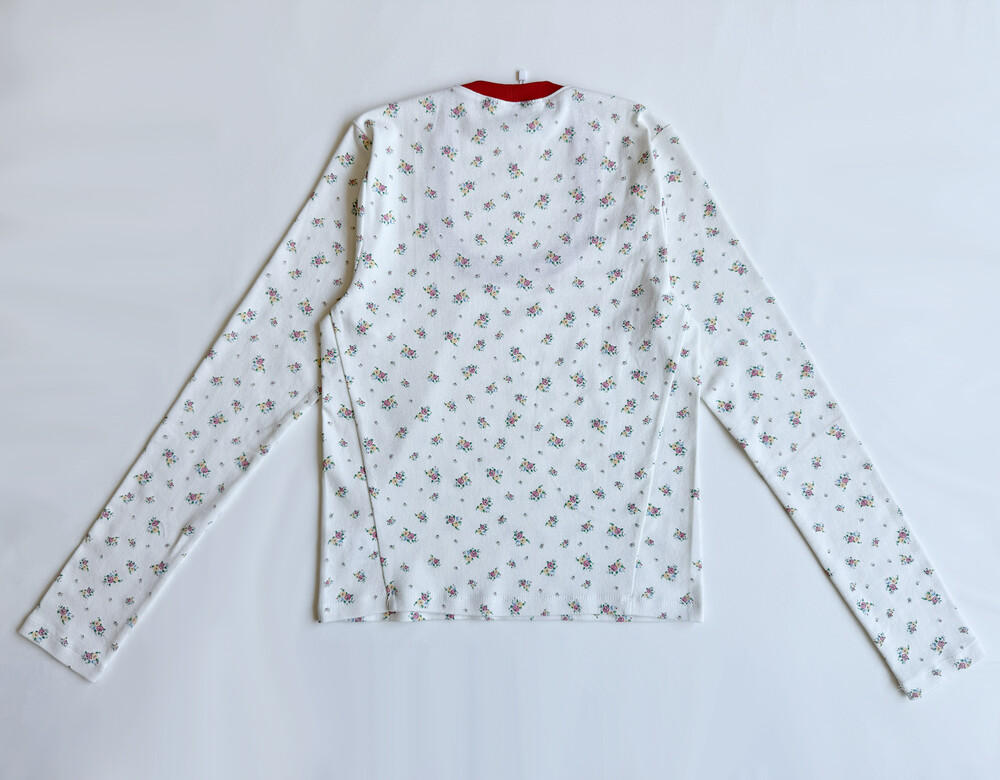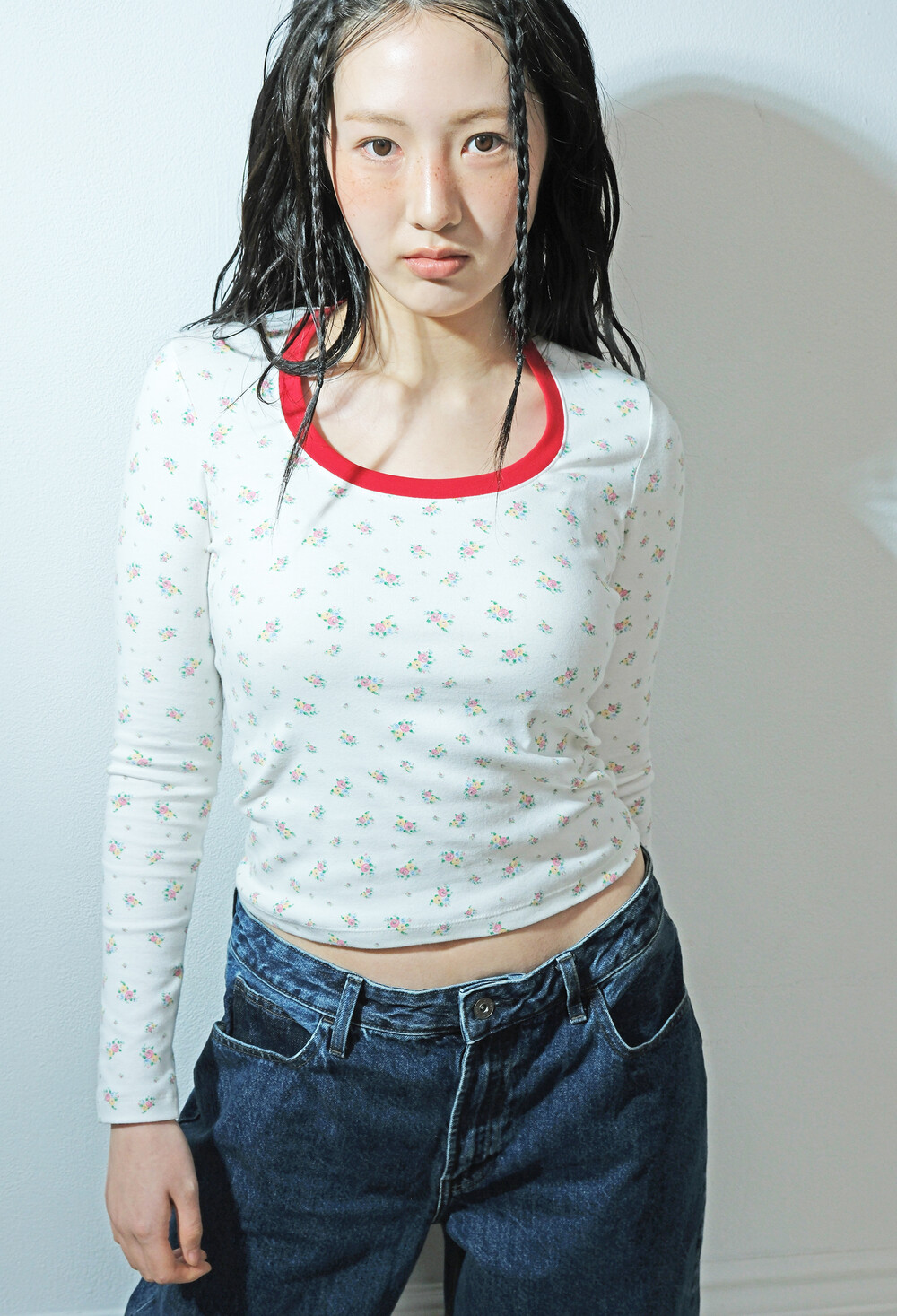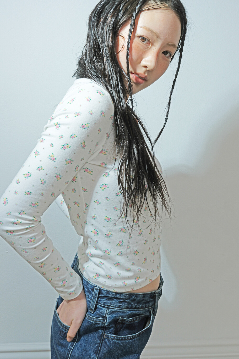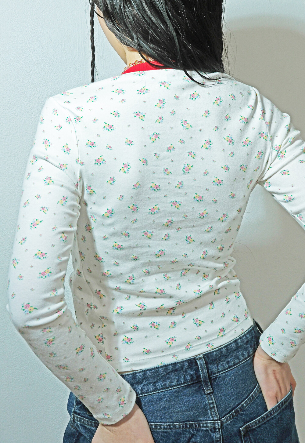 잔잔한 플라워 패턴이 전체에 프린트된 롱슬리브 티셔츠입니다.
