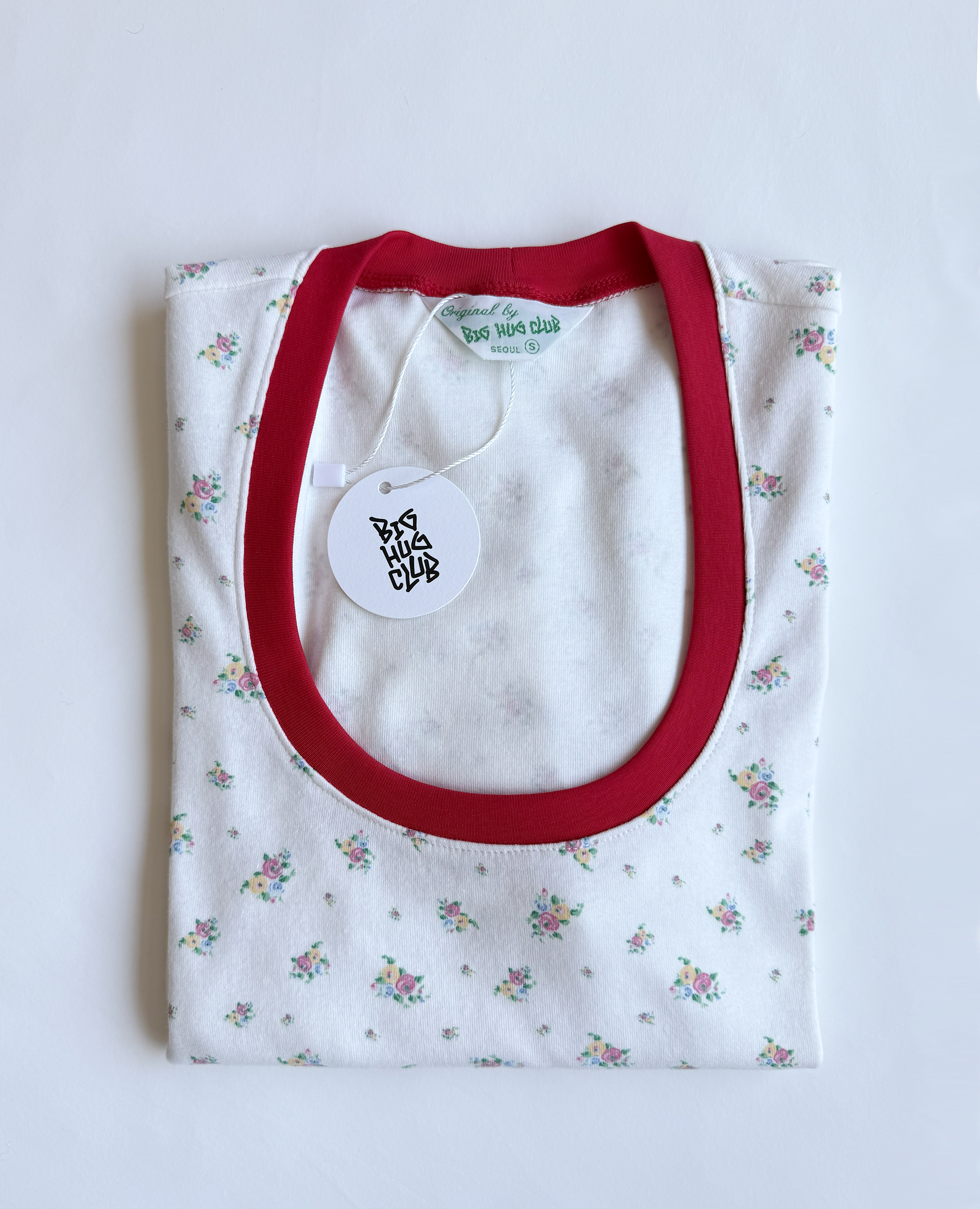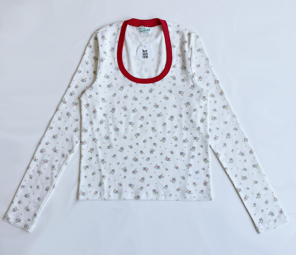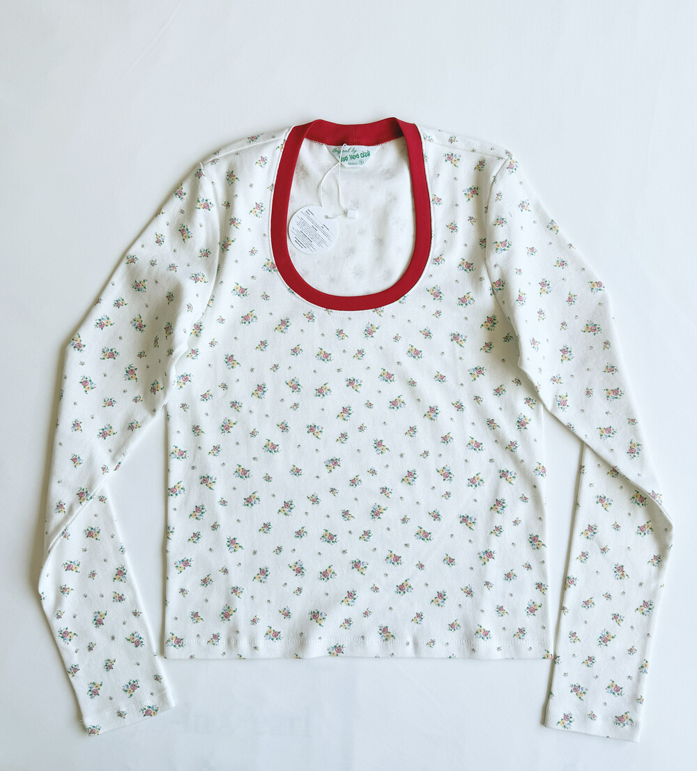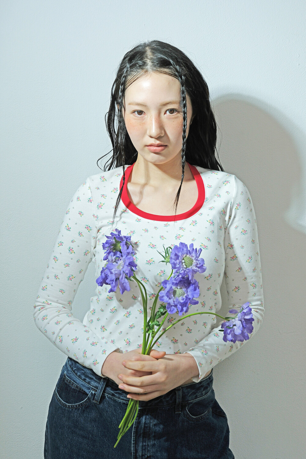 잔잔한 플라워 패턴이 전체에 프린트된 롱슬리브 티셔츠입니다.