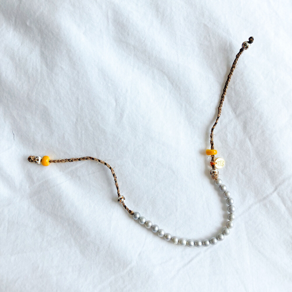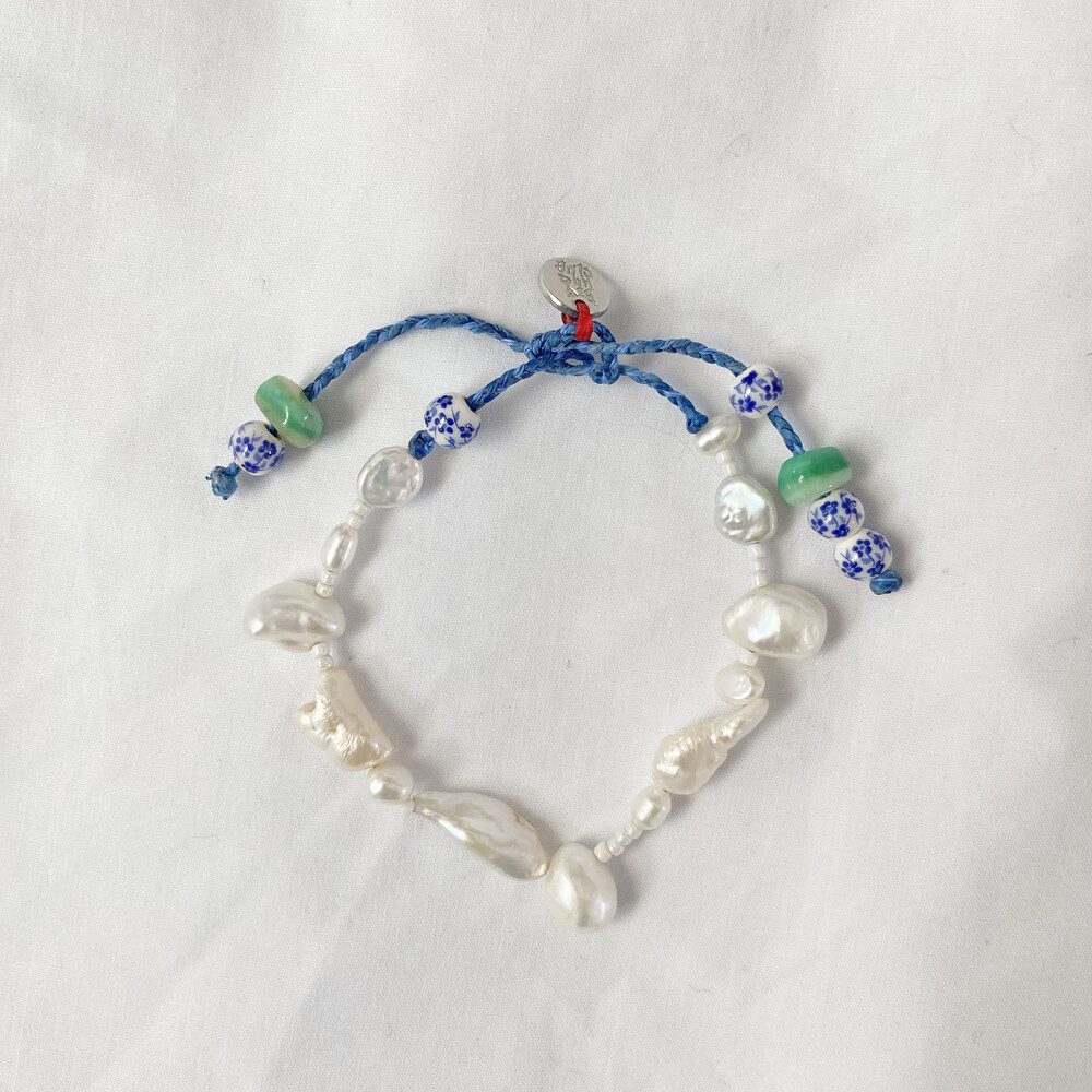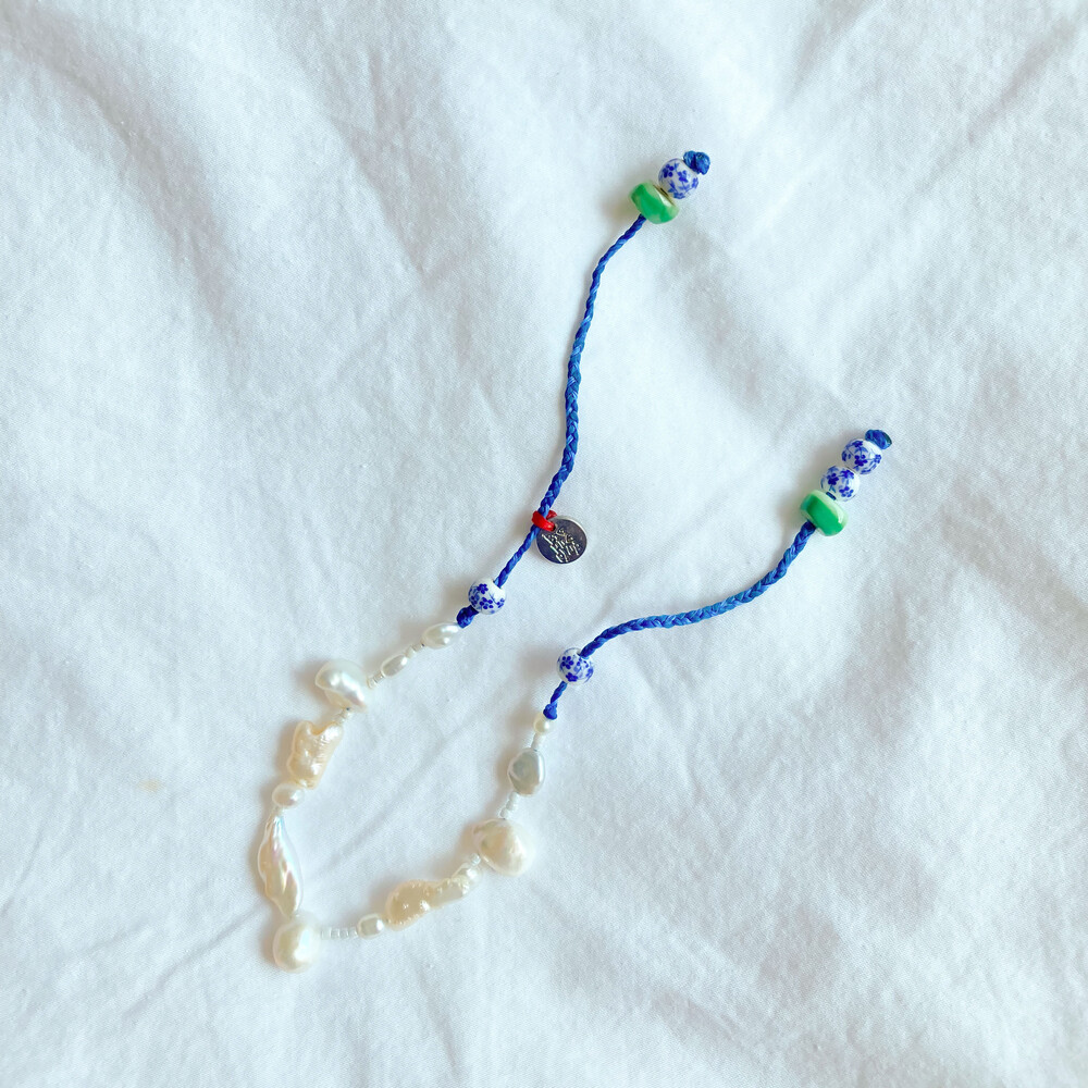 Material: pearls, silk yarn, waxed thread, porcelain, mother of pearl