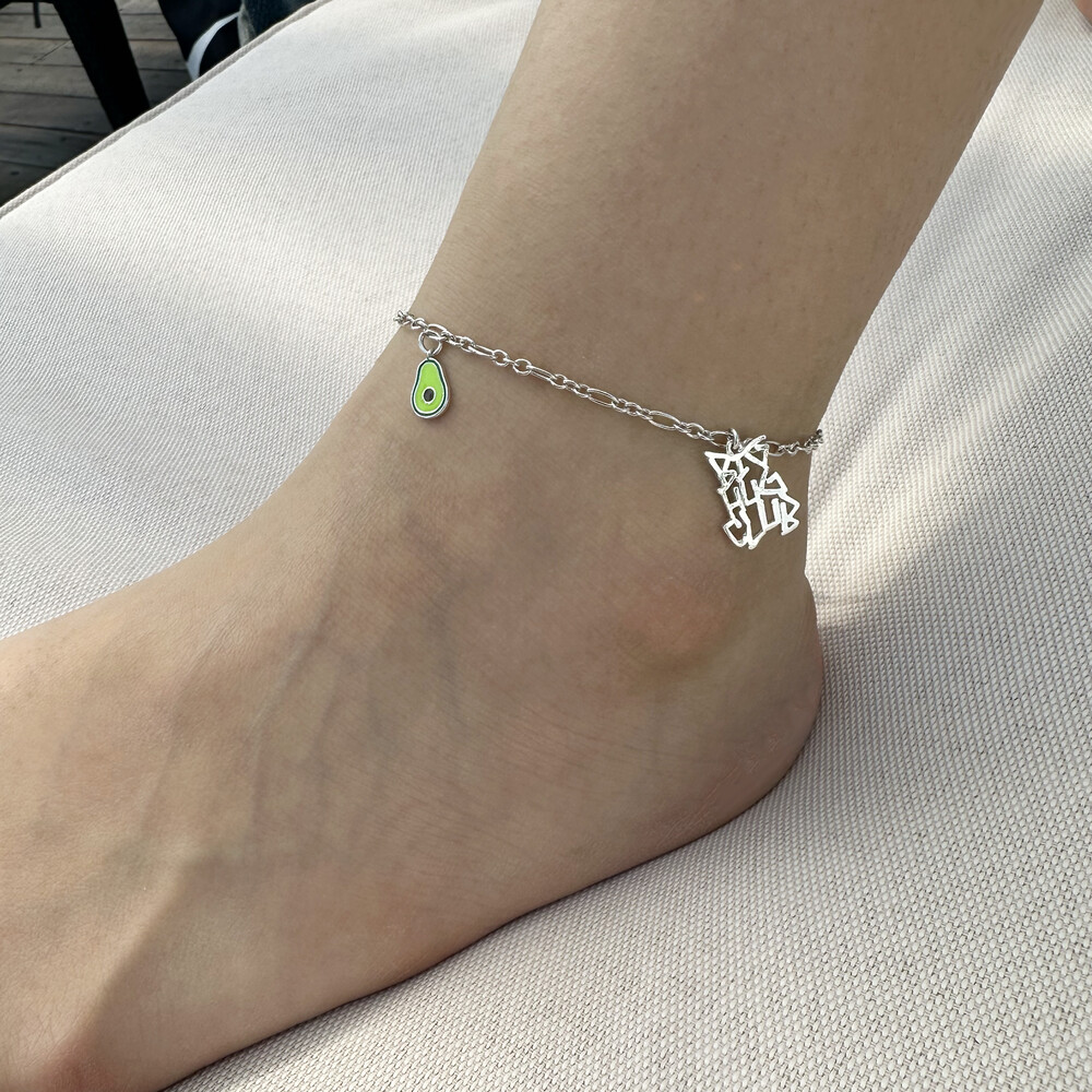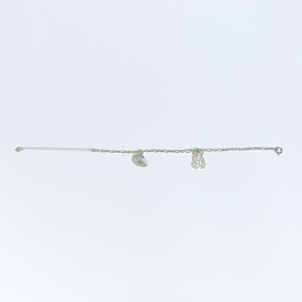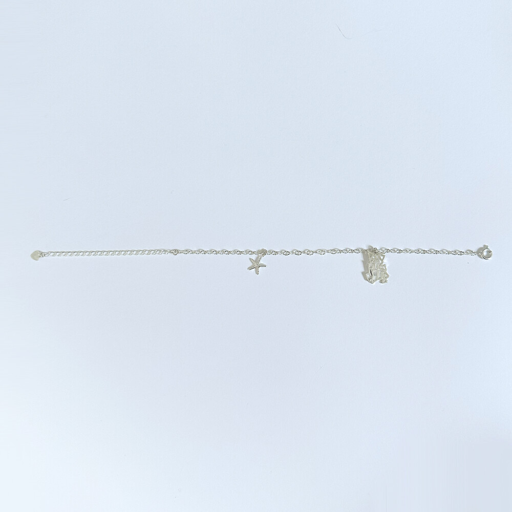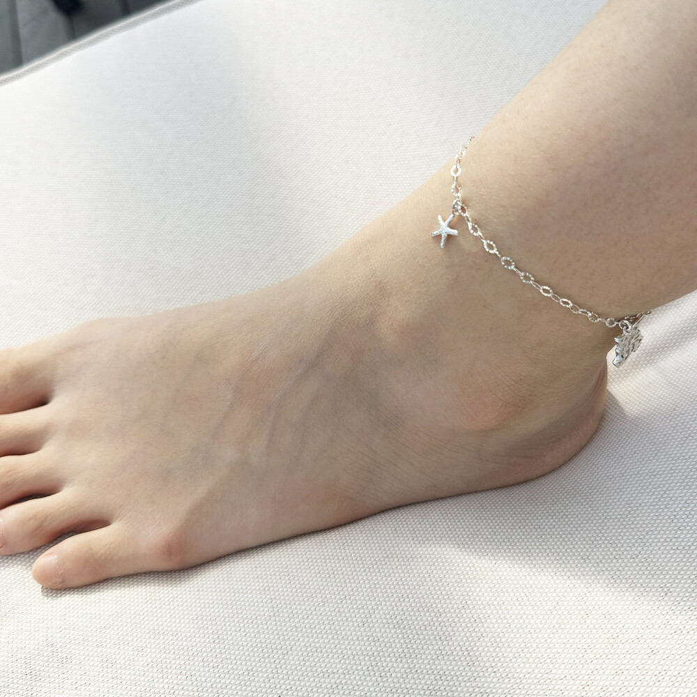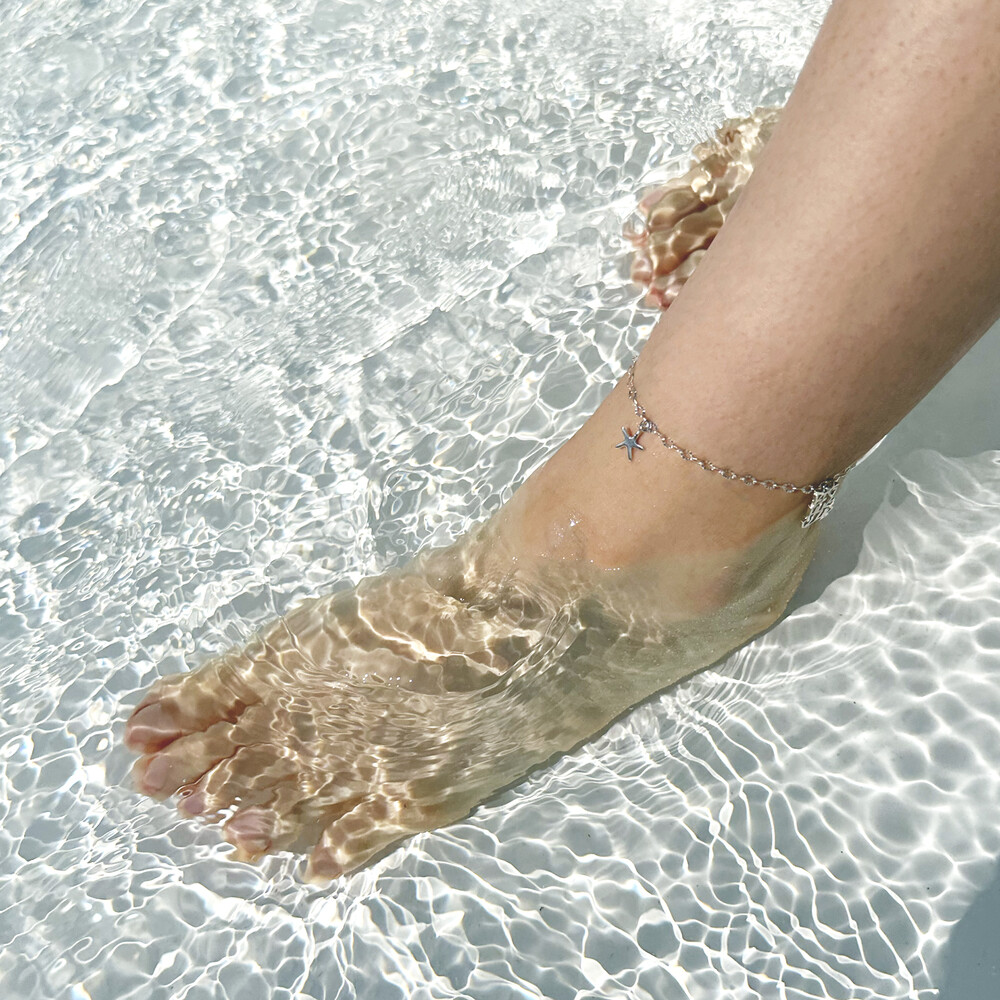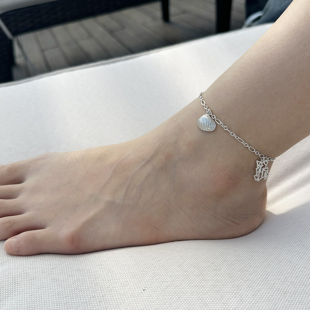 여름에 착용하기 좋은 반짝이는 실버 체인의 앵클렛입니다.