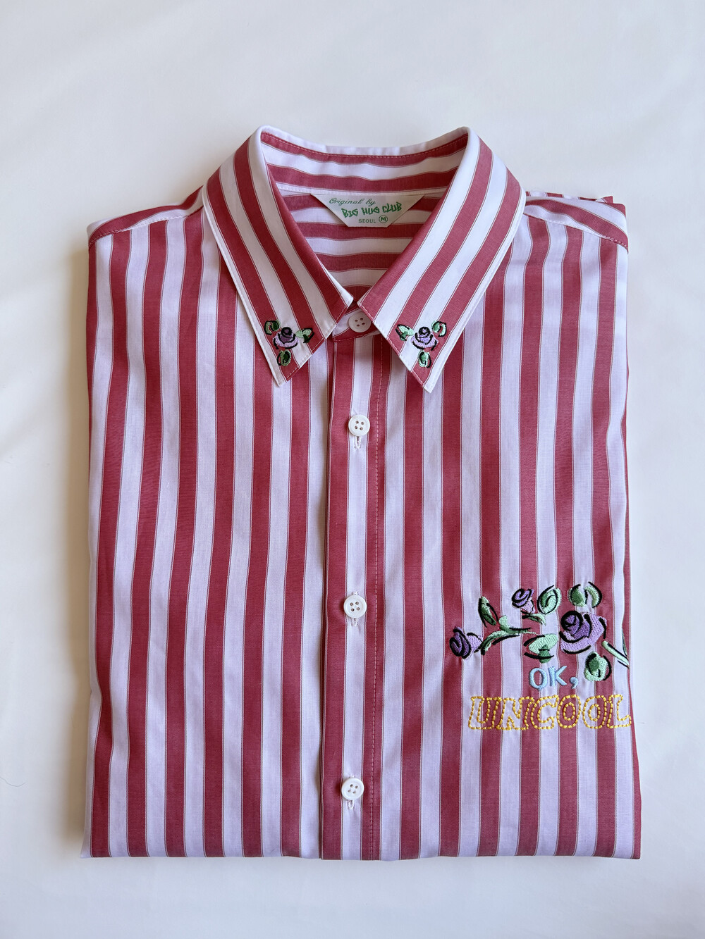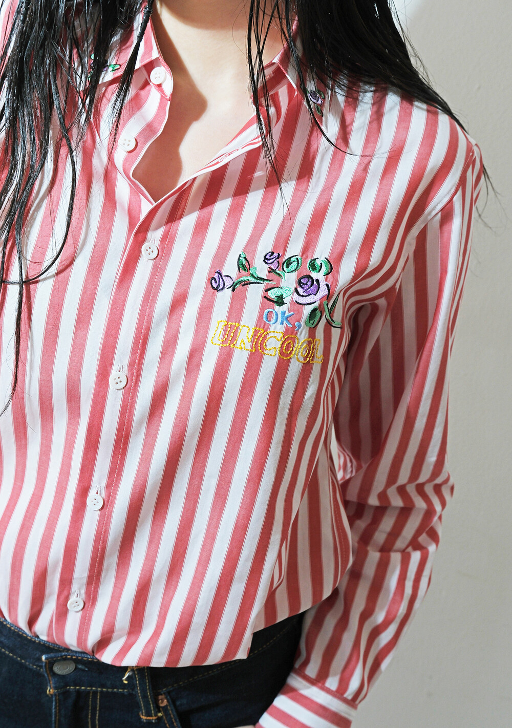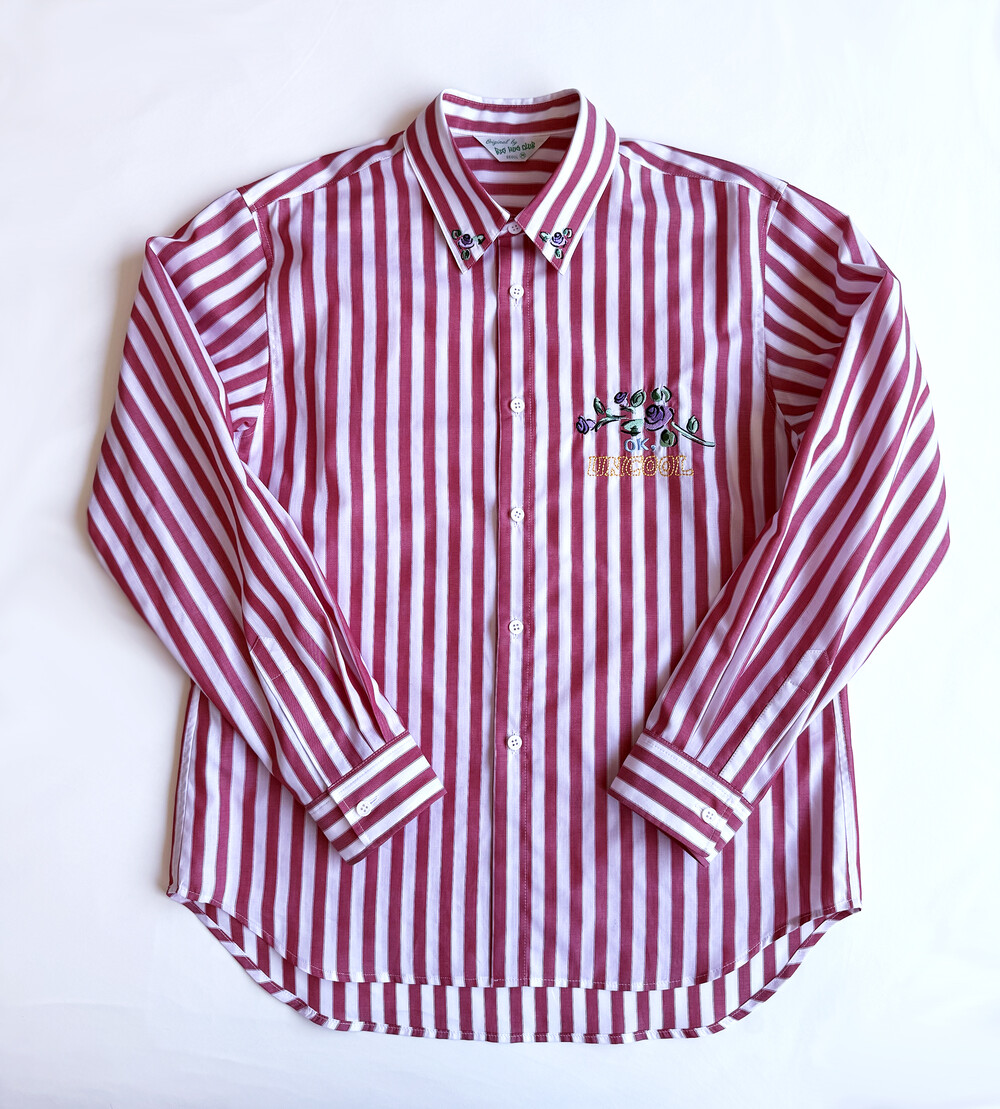 ‘Ok, uncool’ 자수가 더해진 레드 스트라이프 셔츠입니다.