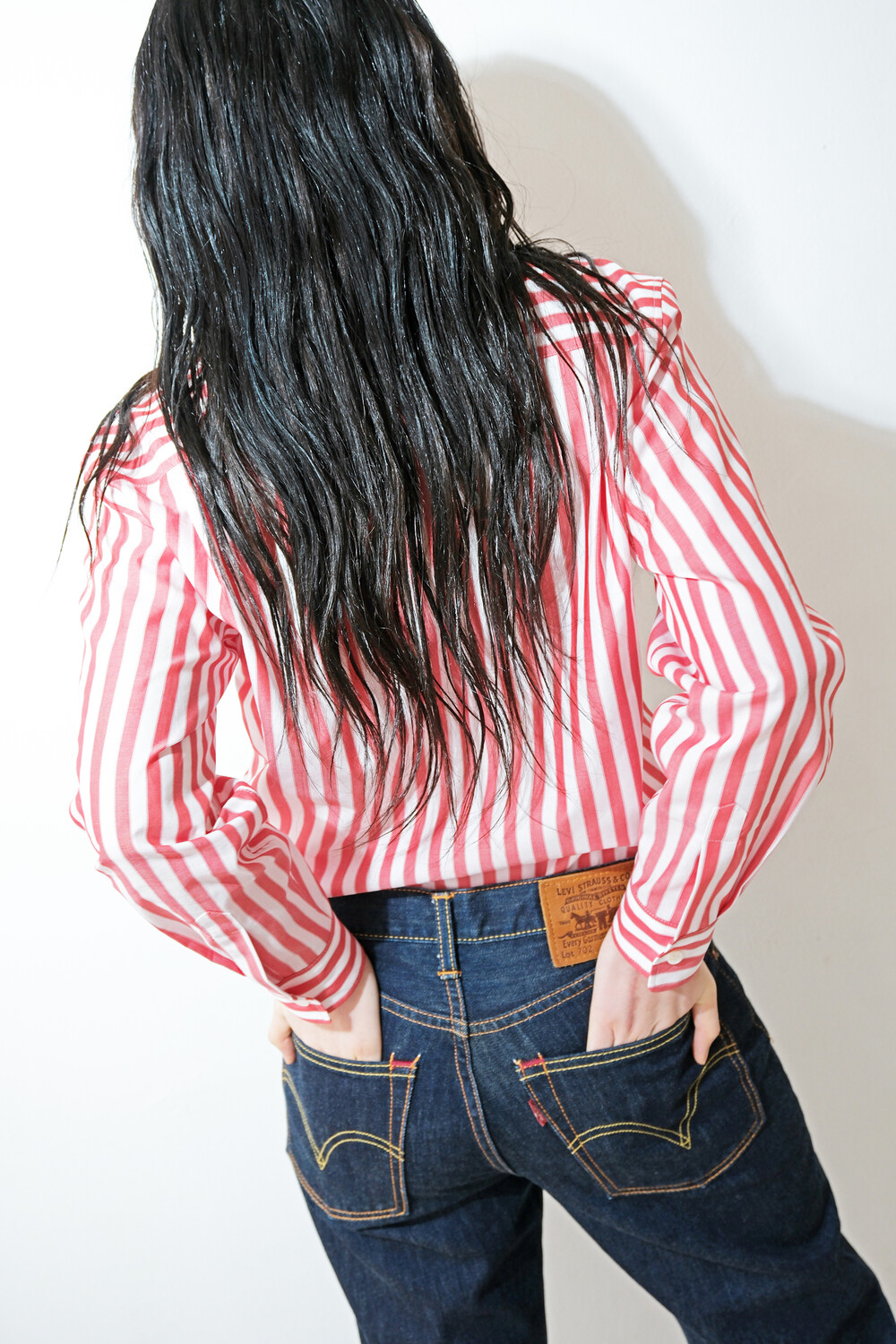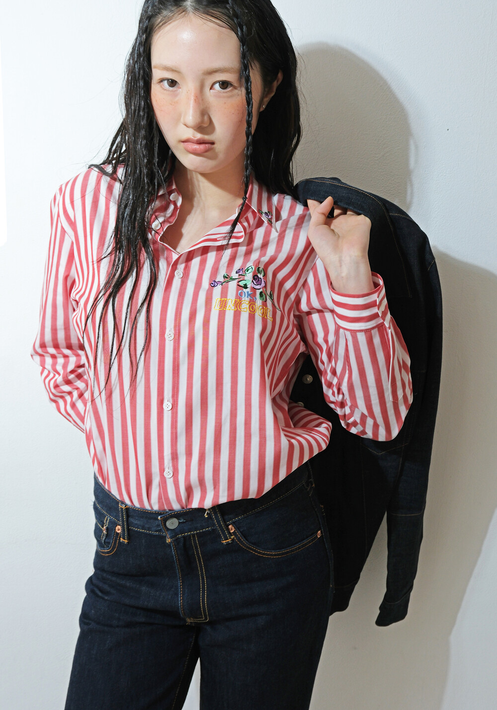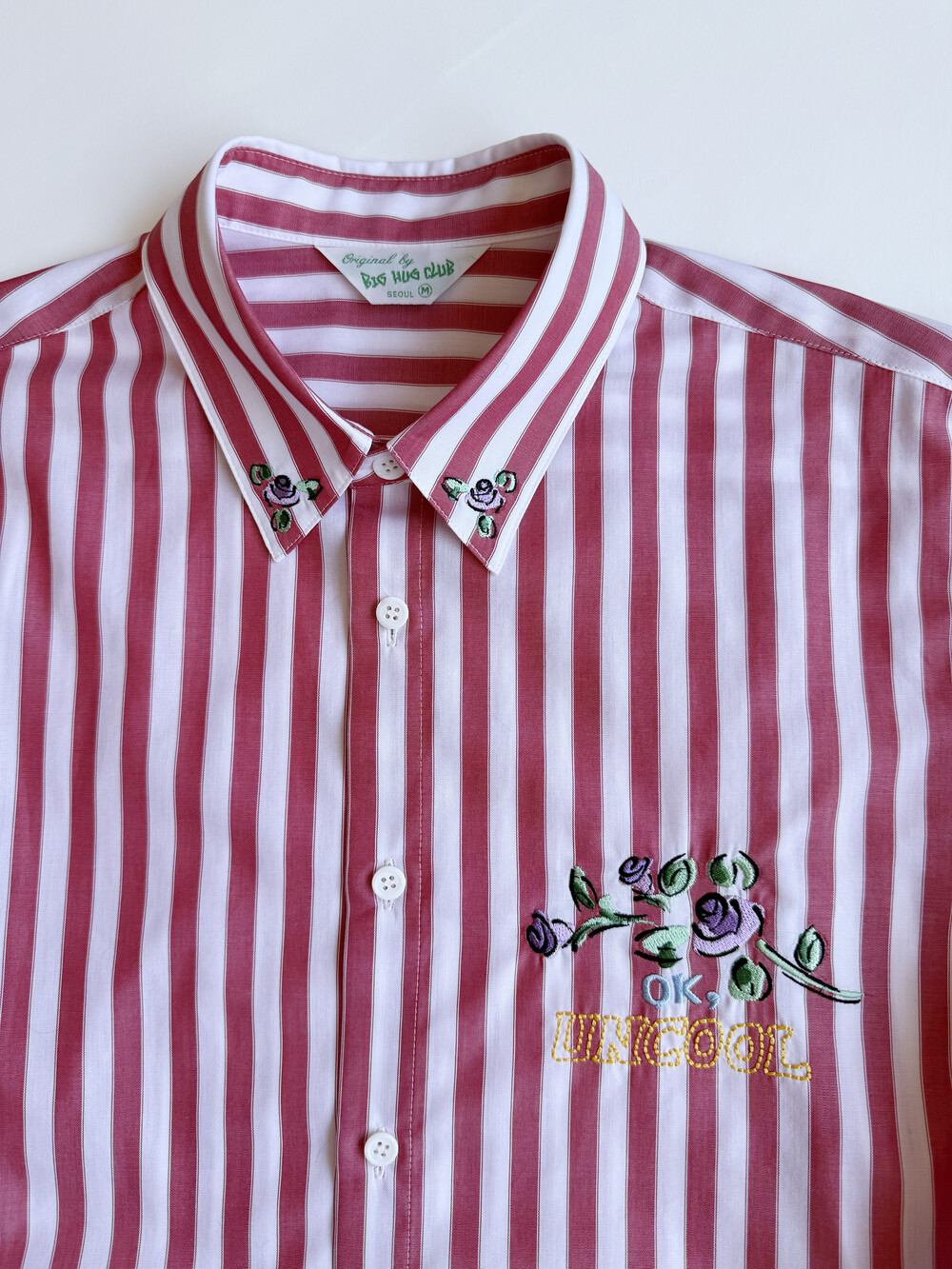 ‘Ok, uncool’ 자수가 더해진 레드 스트라이프 셔츠입니다.