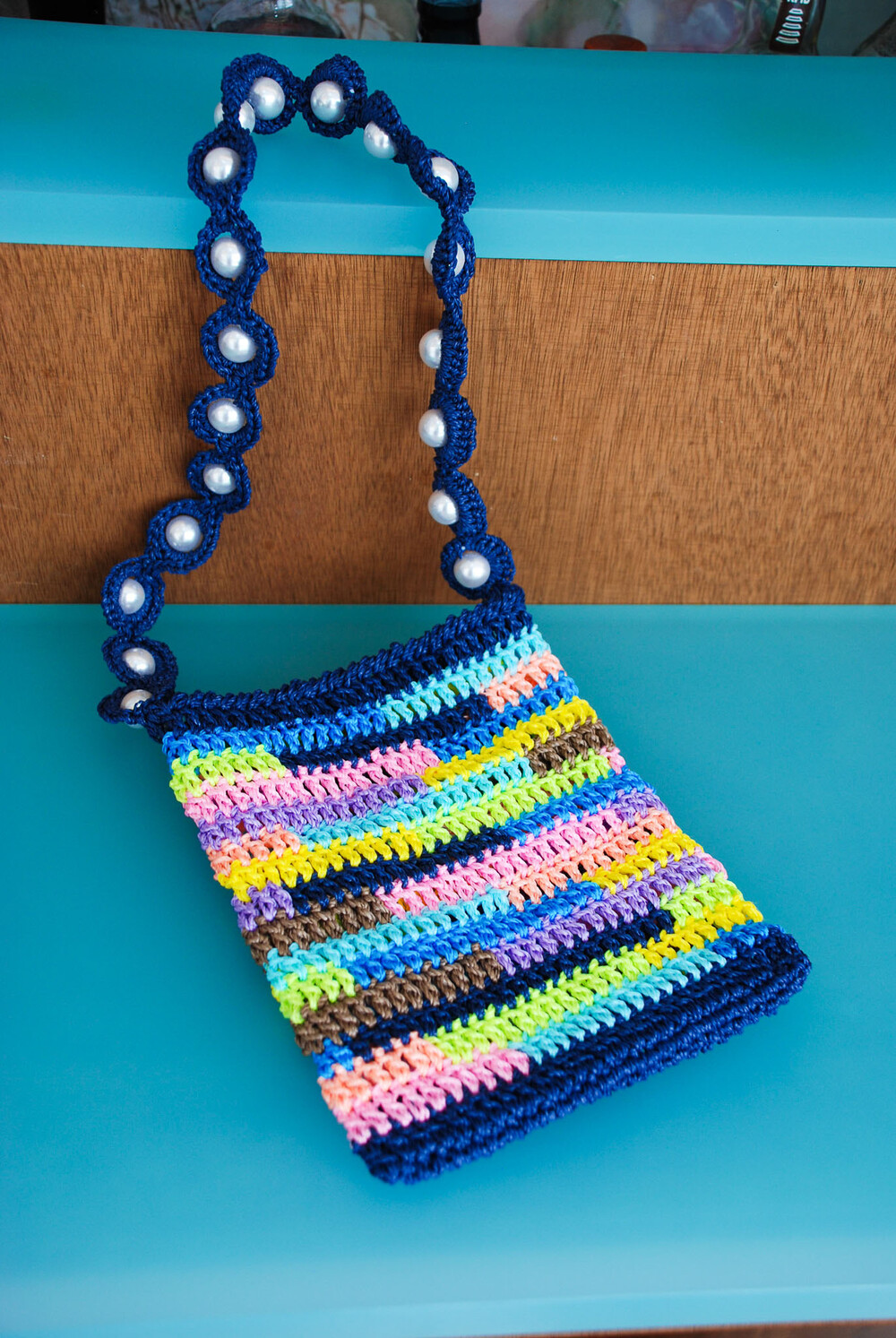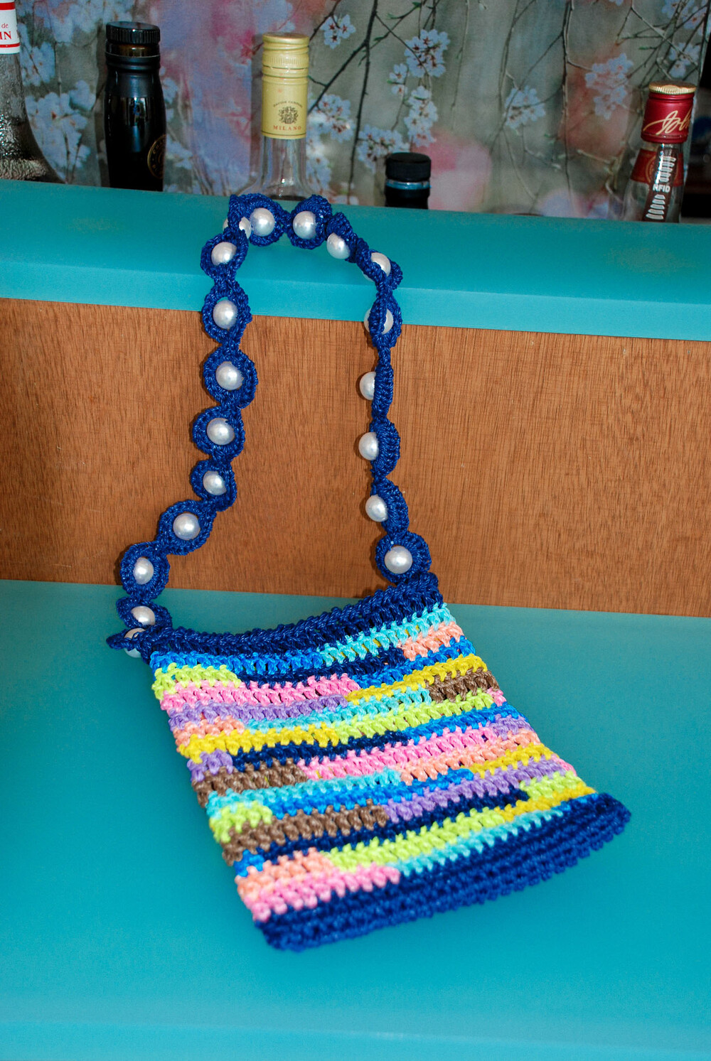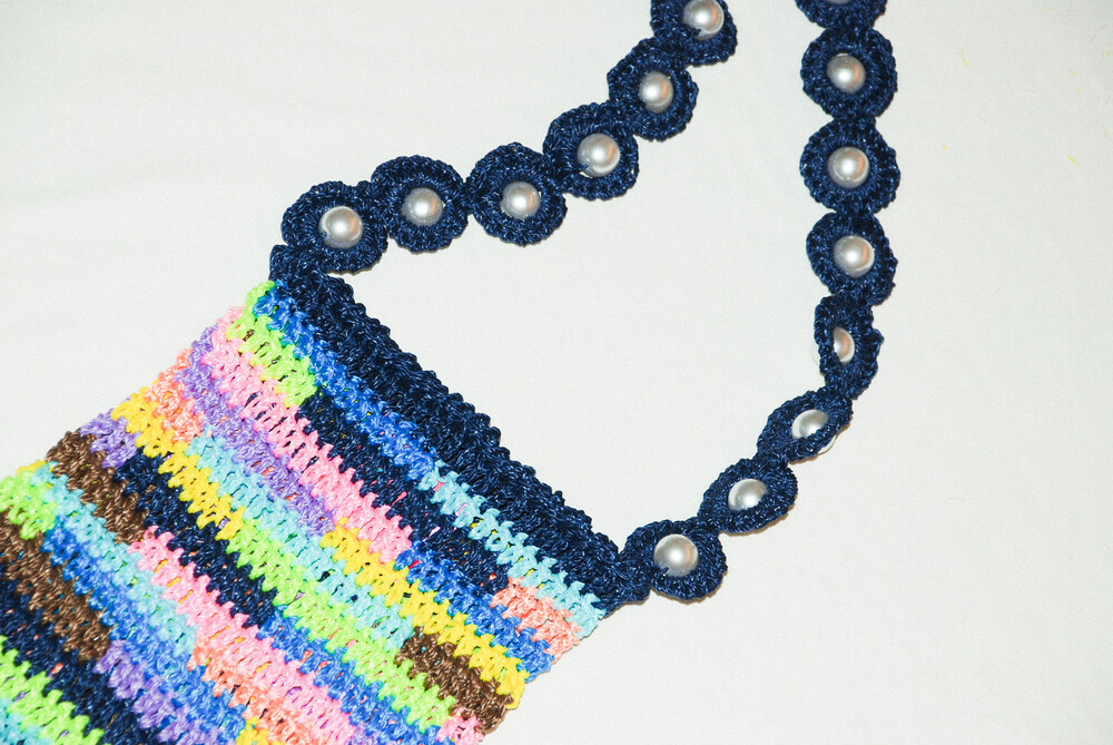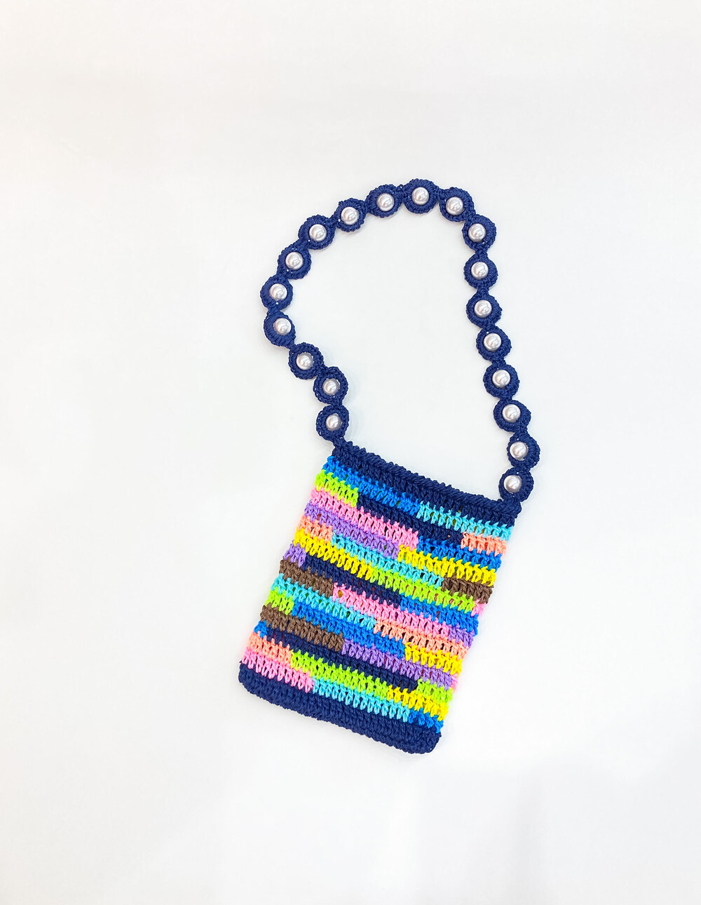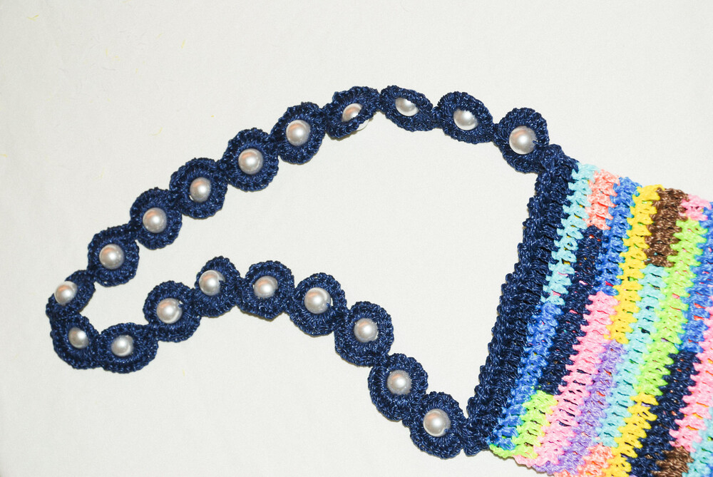 여러 가지 색상의 실로 짠 크로셰 백과 페이크 진주로 장식된 마크라메 매듭의 어깨 끈으로