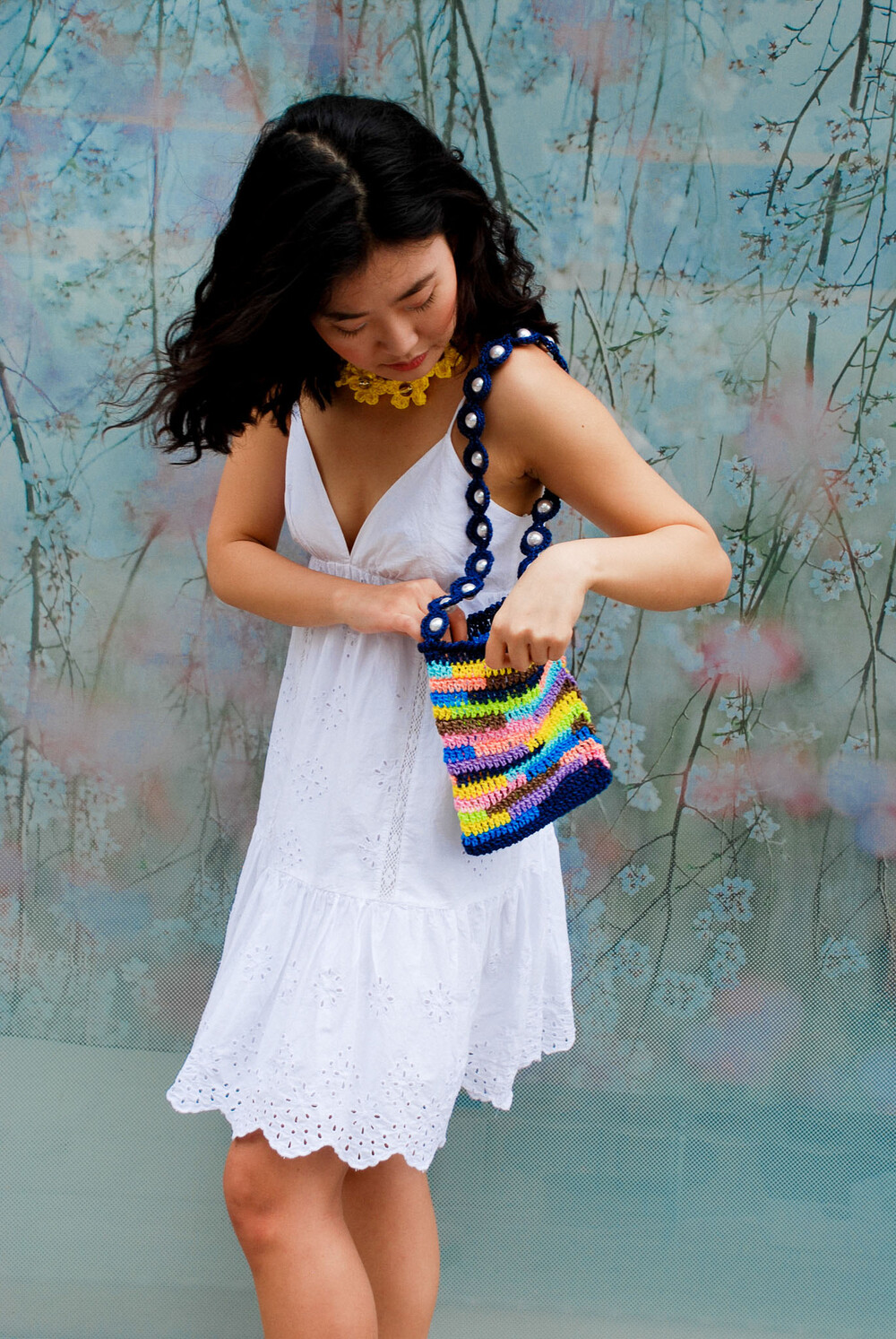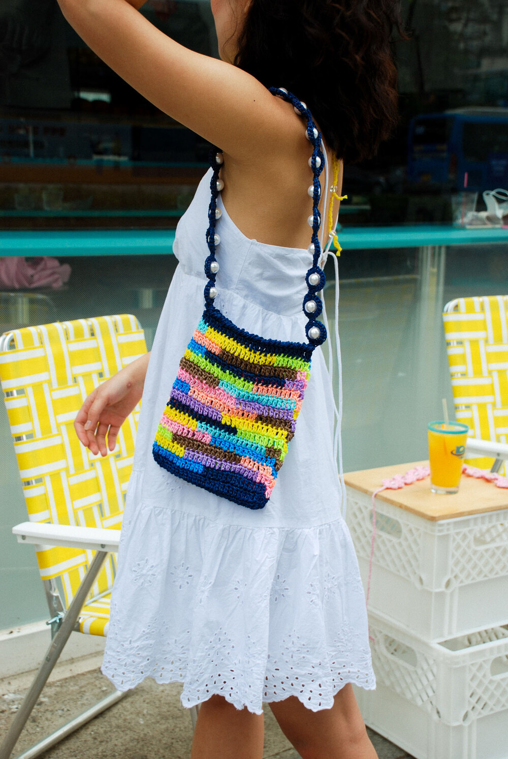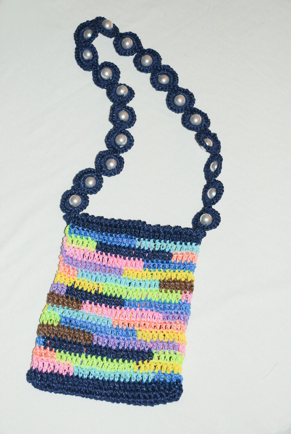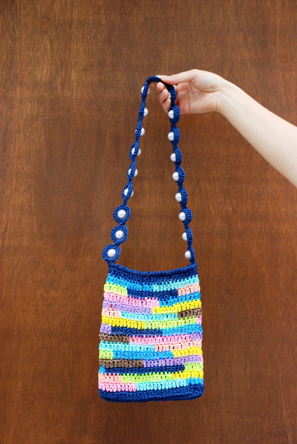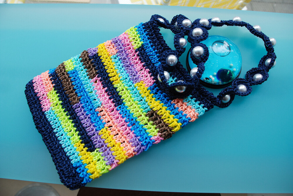 여러 가지 색상의 실로 짠 크로셰 백과 페이크 진주로 장식된 마크라메 매듭의 어깨 끈으로